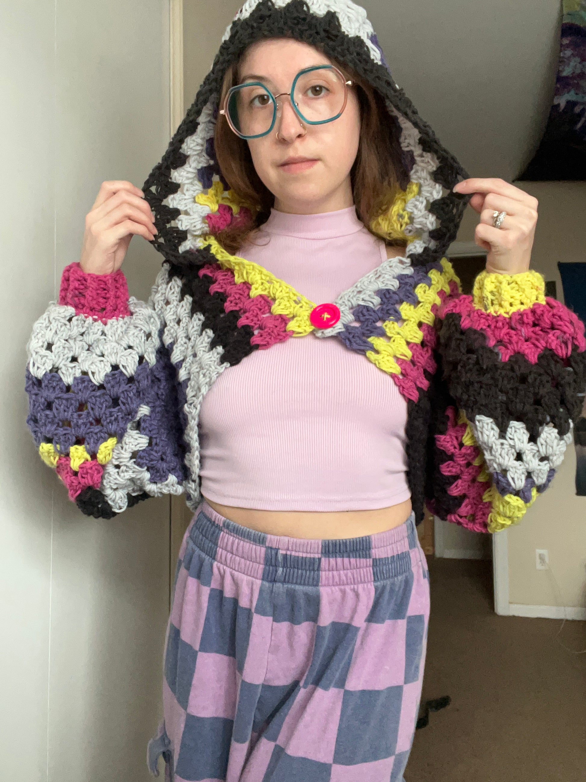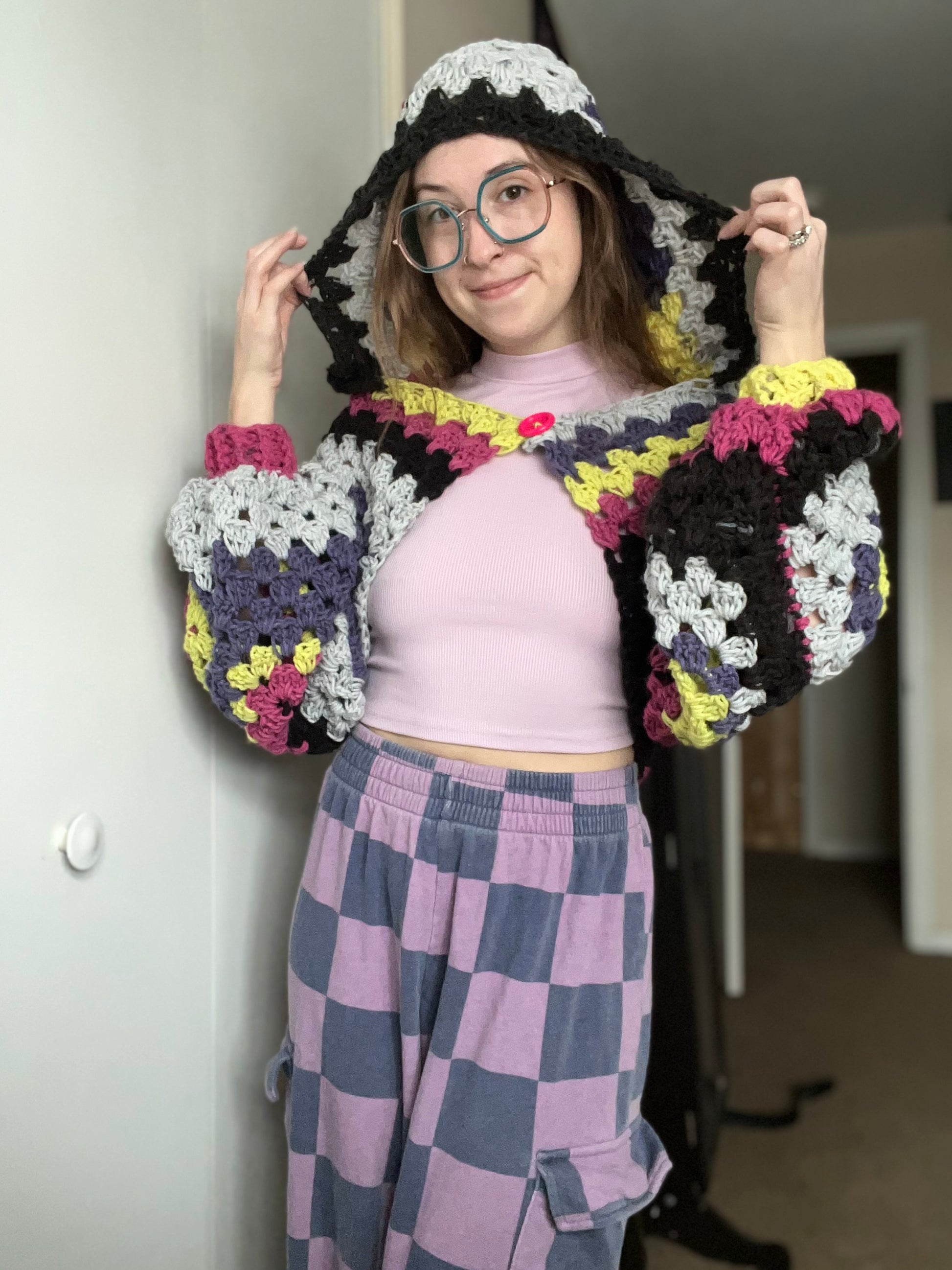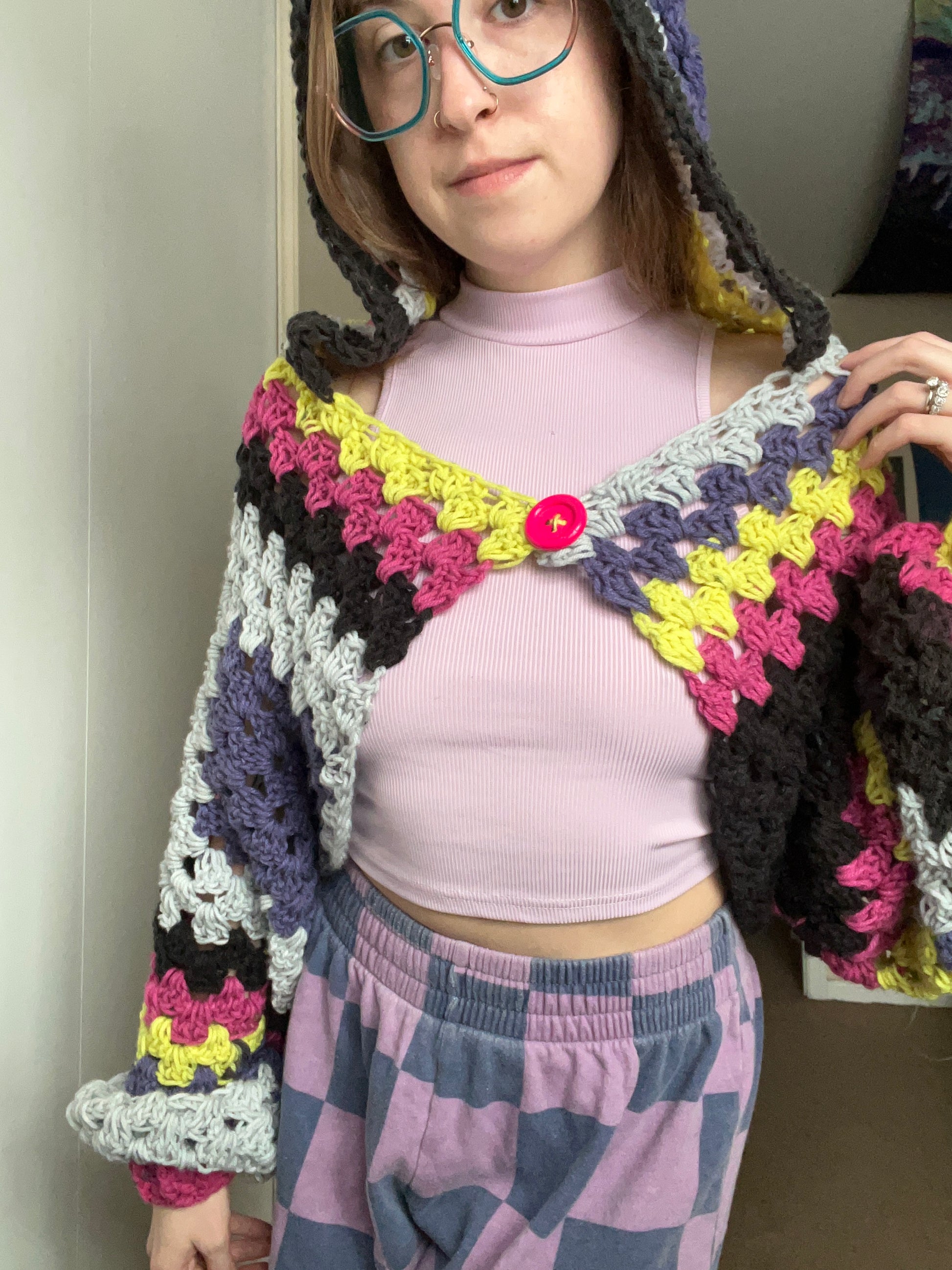 Item is made with acrylic yarn and a plastic button with a loop clasp
