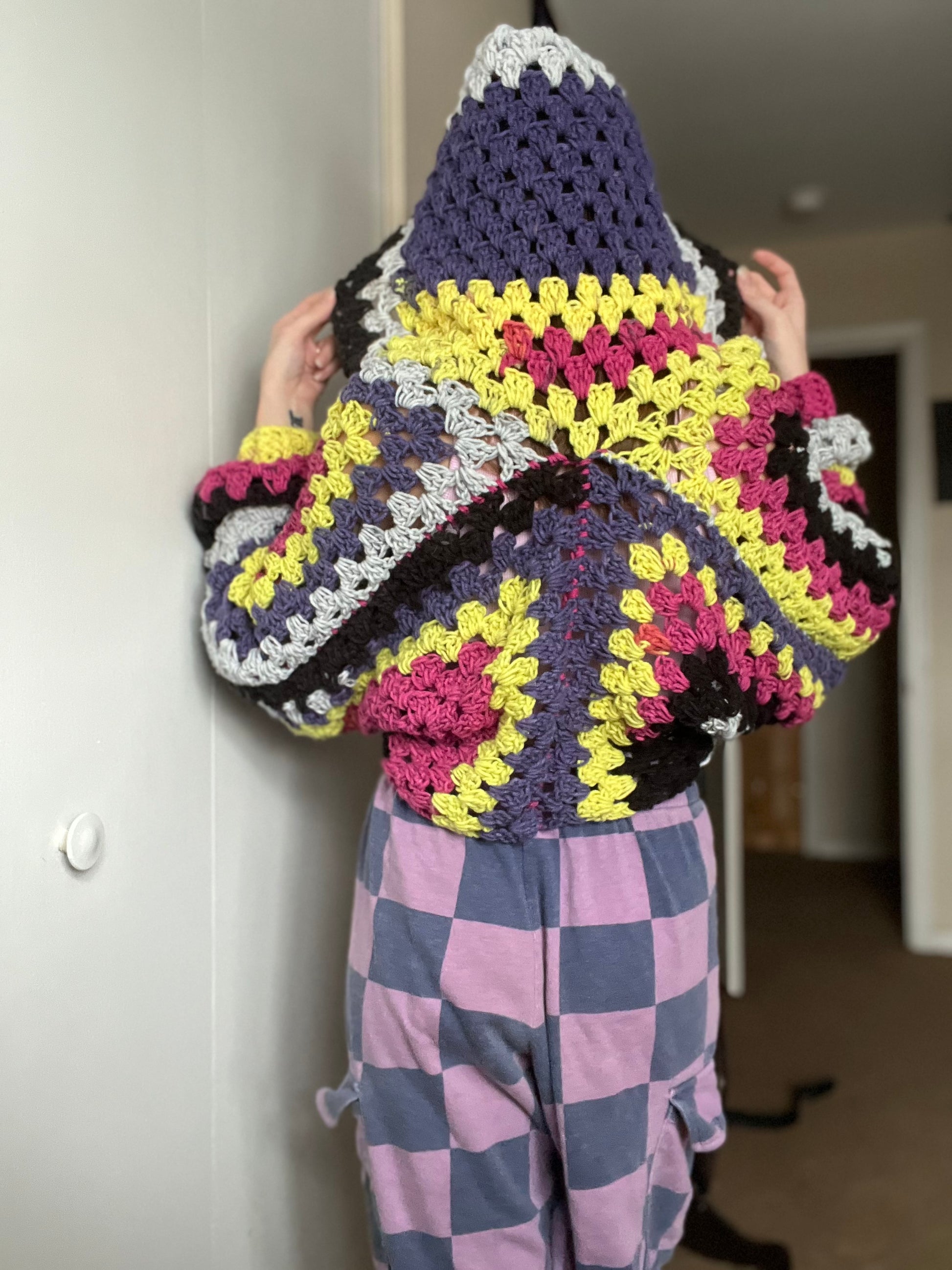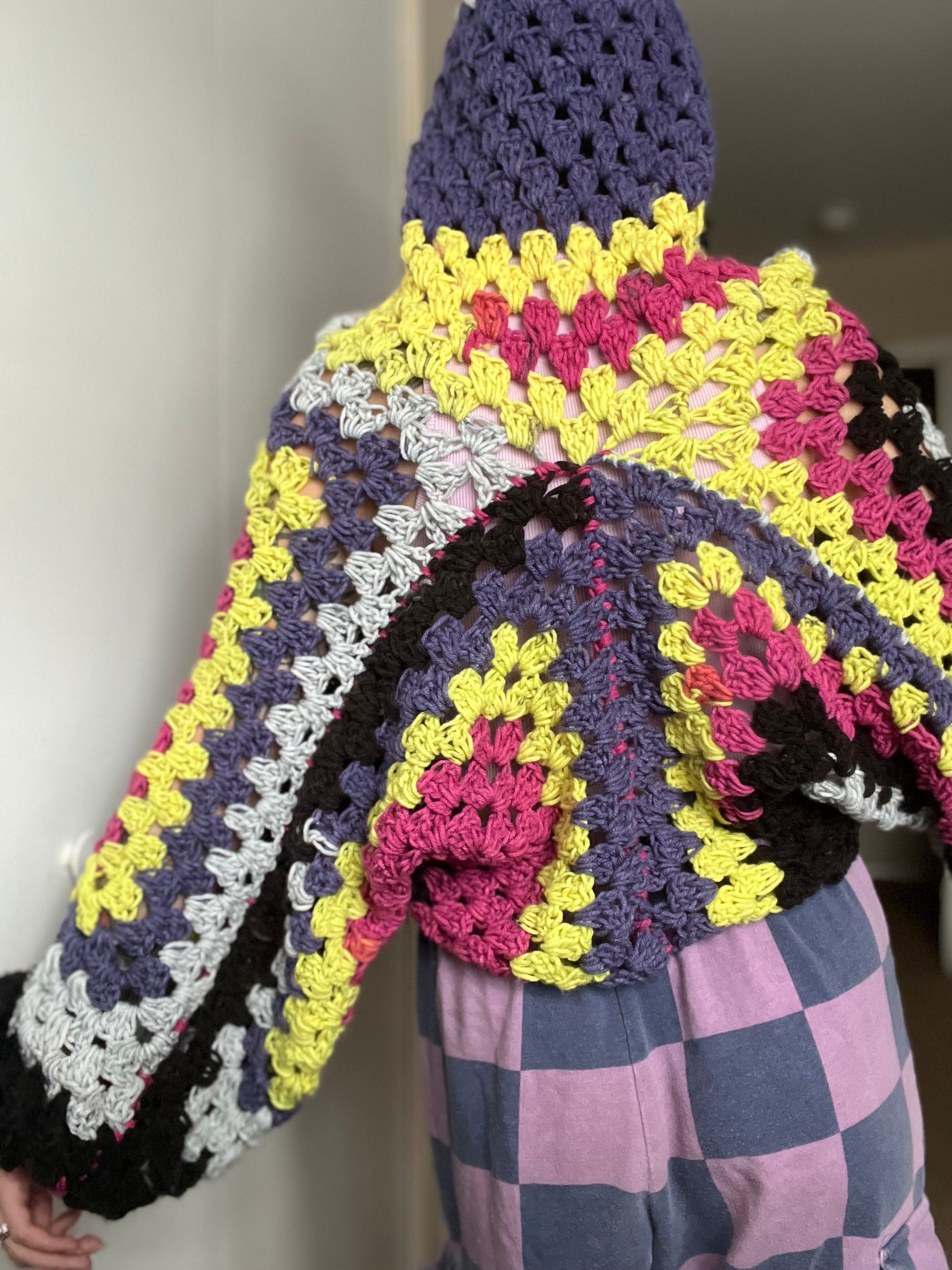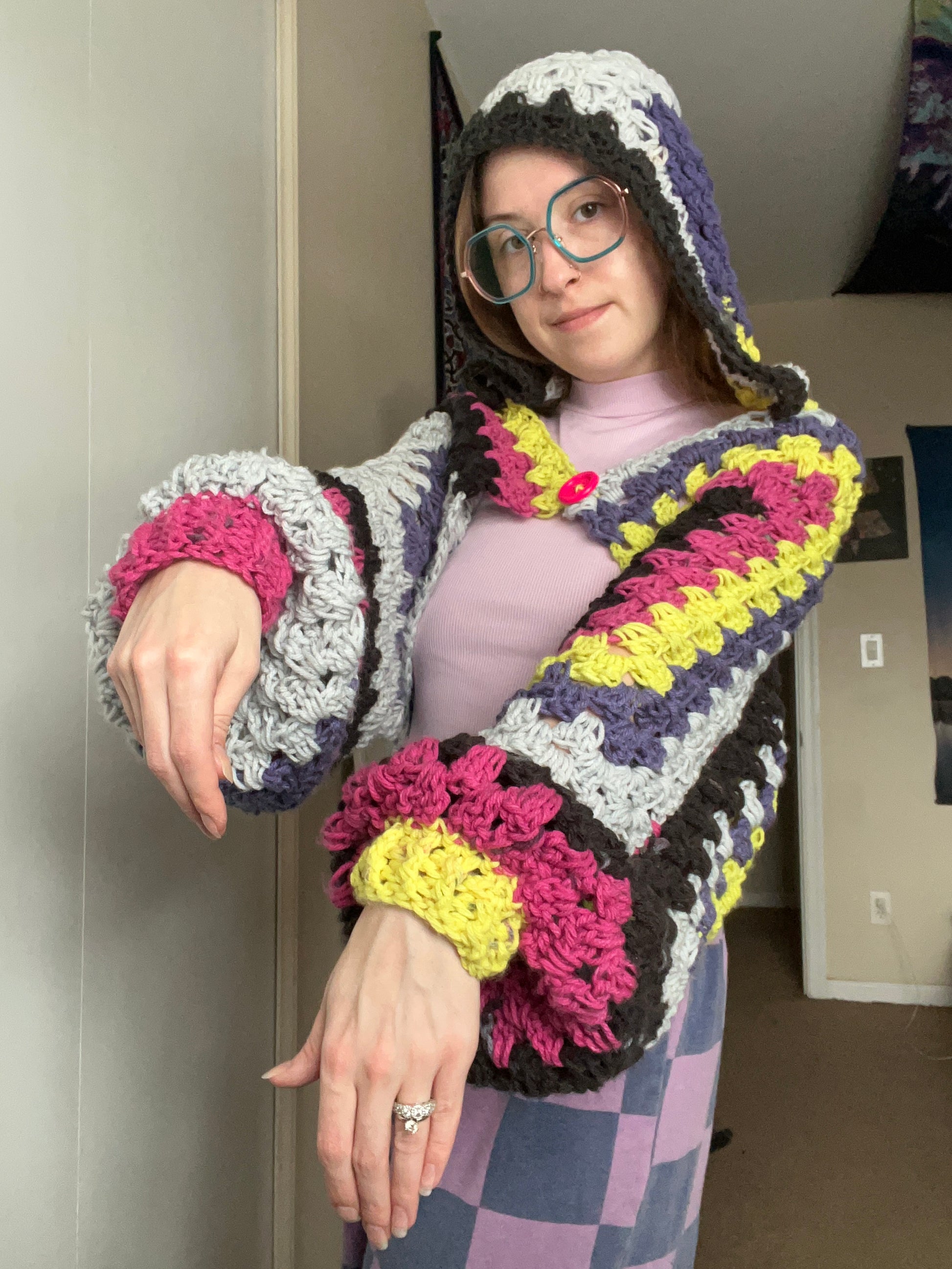 Item is made with acrylic yarn and a plastic button with a loop clasp