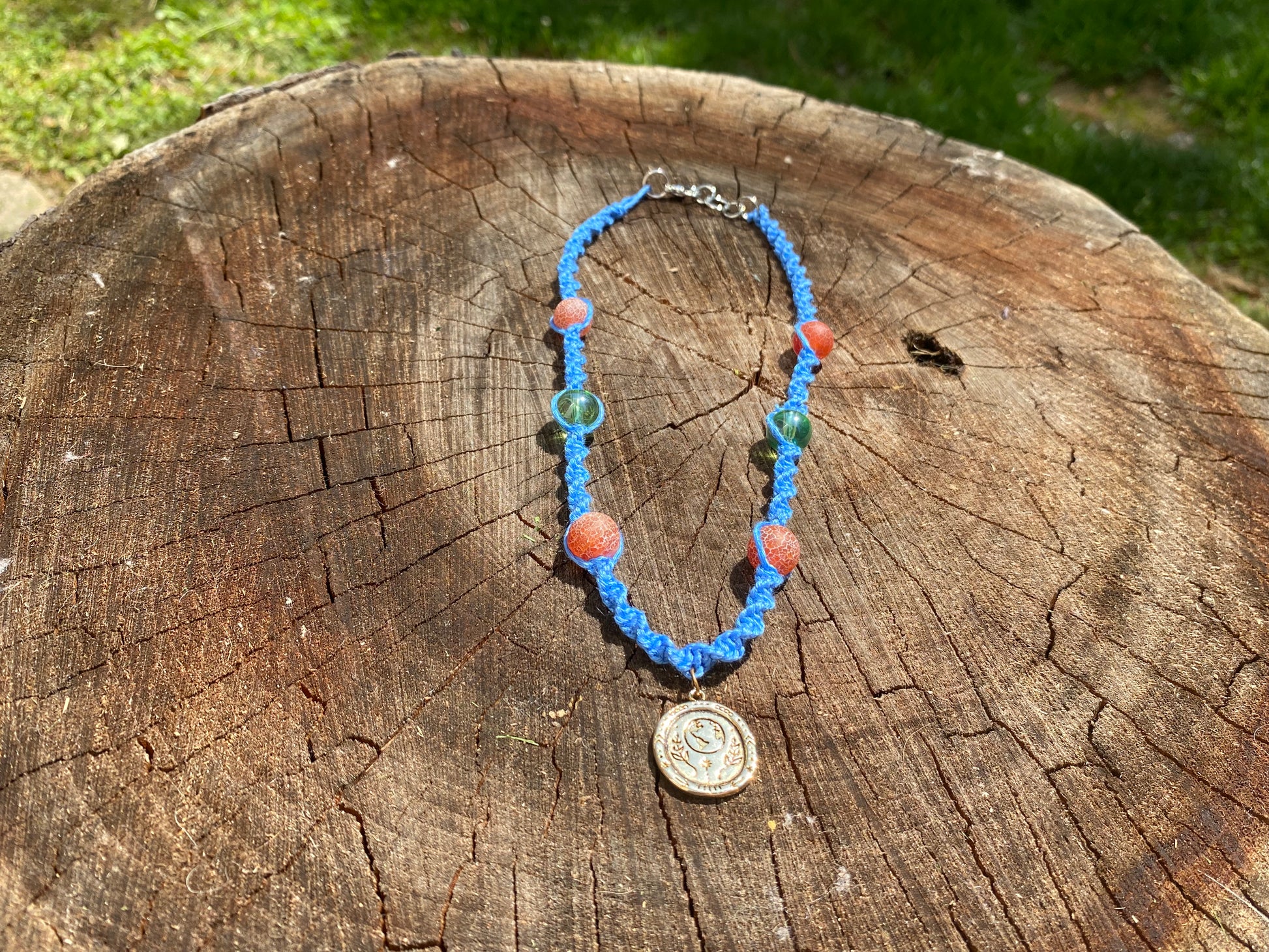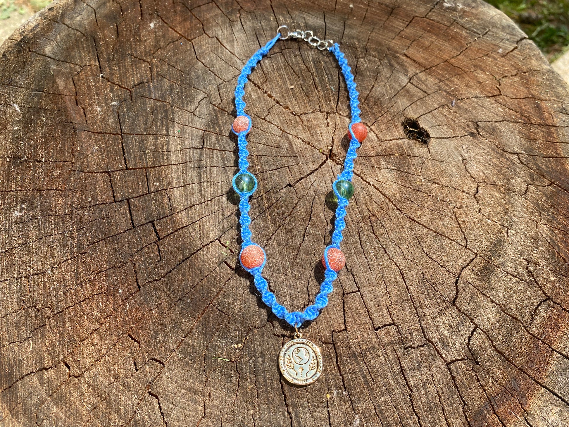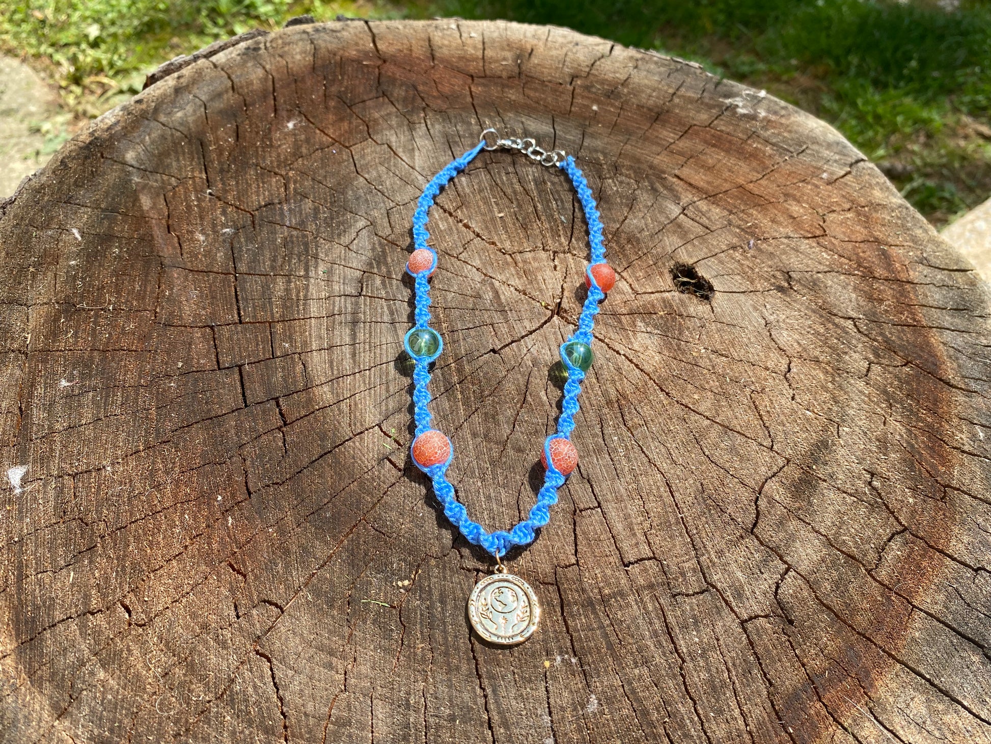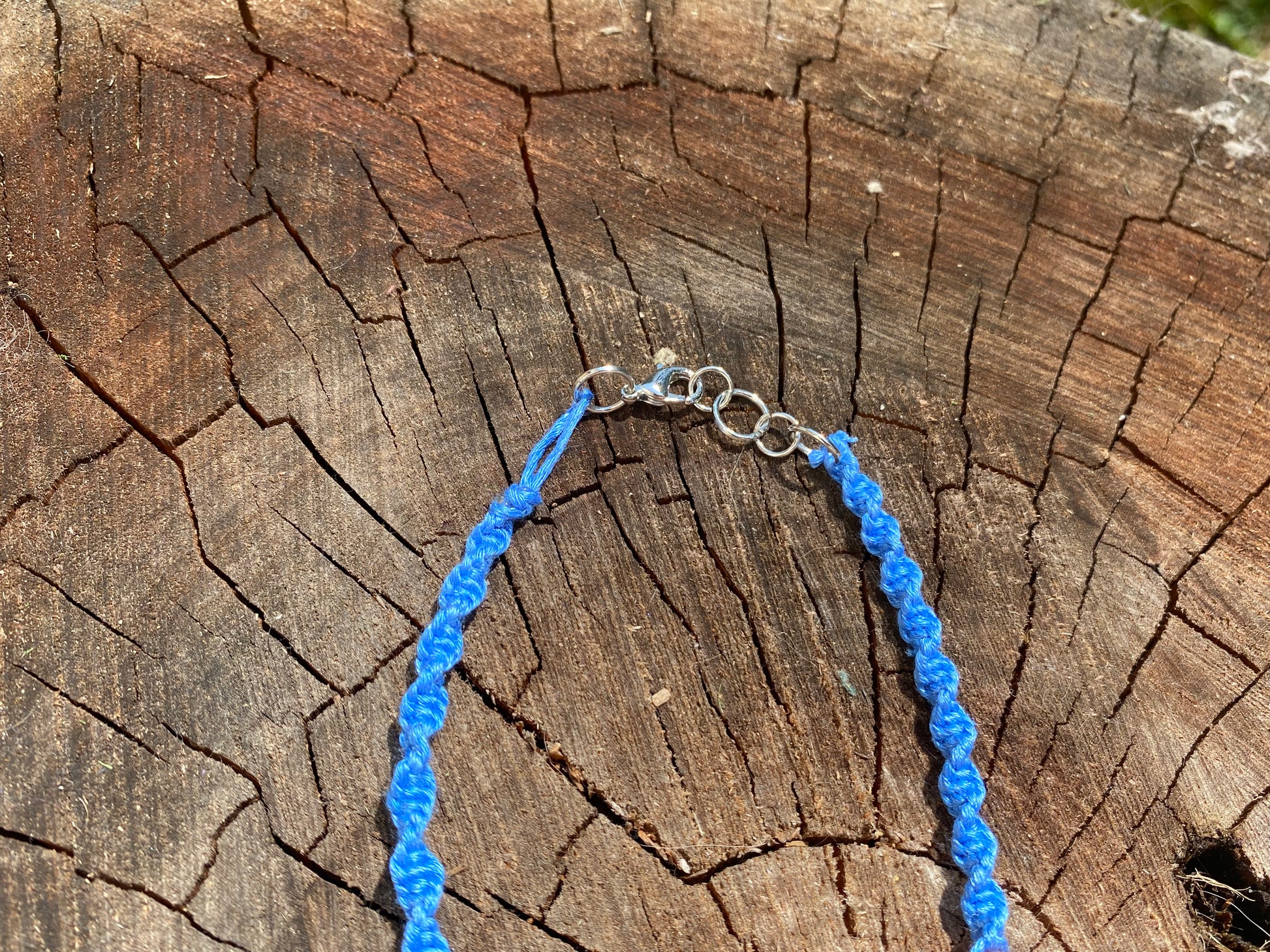14.5 inches in length with 2 inches of extra chain link, made with soft blue hemp and glass and stone beads. This item is available longer per request in order comments.