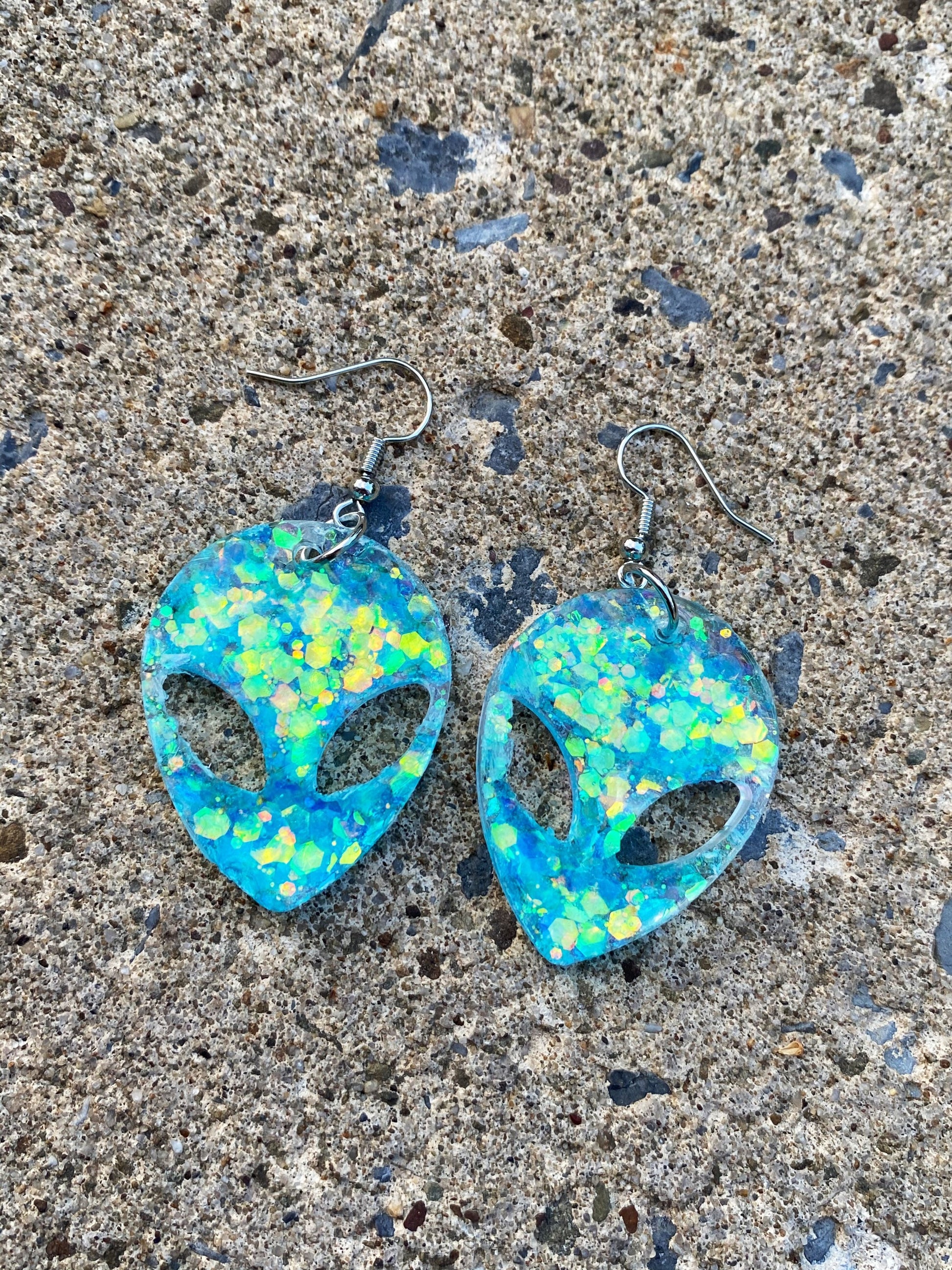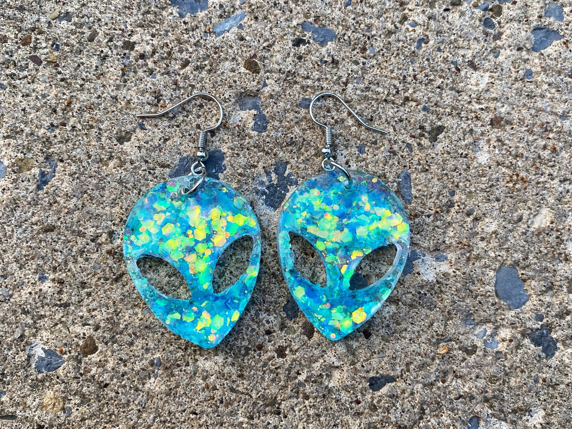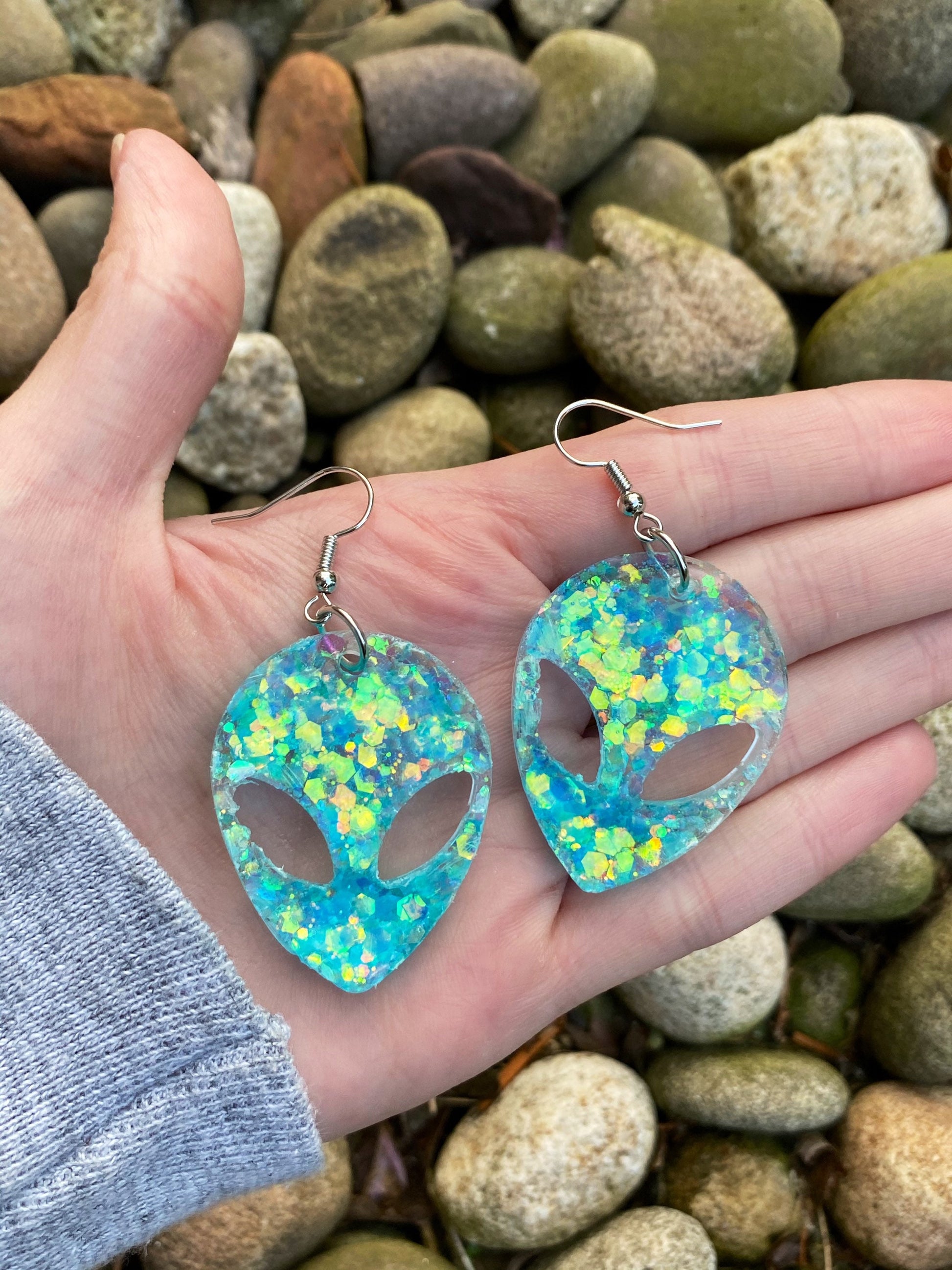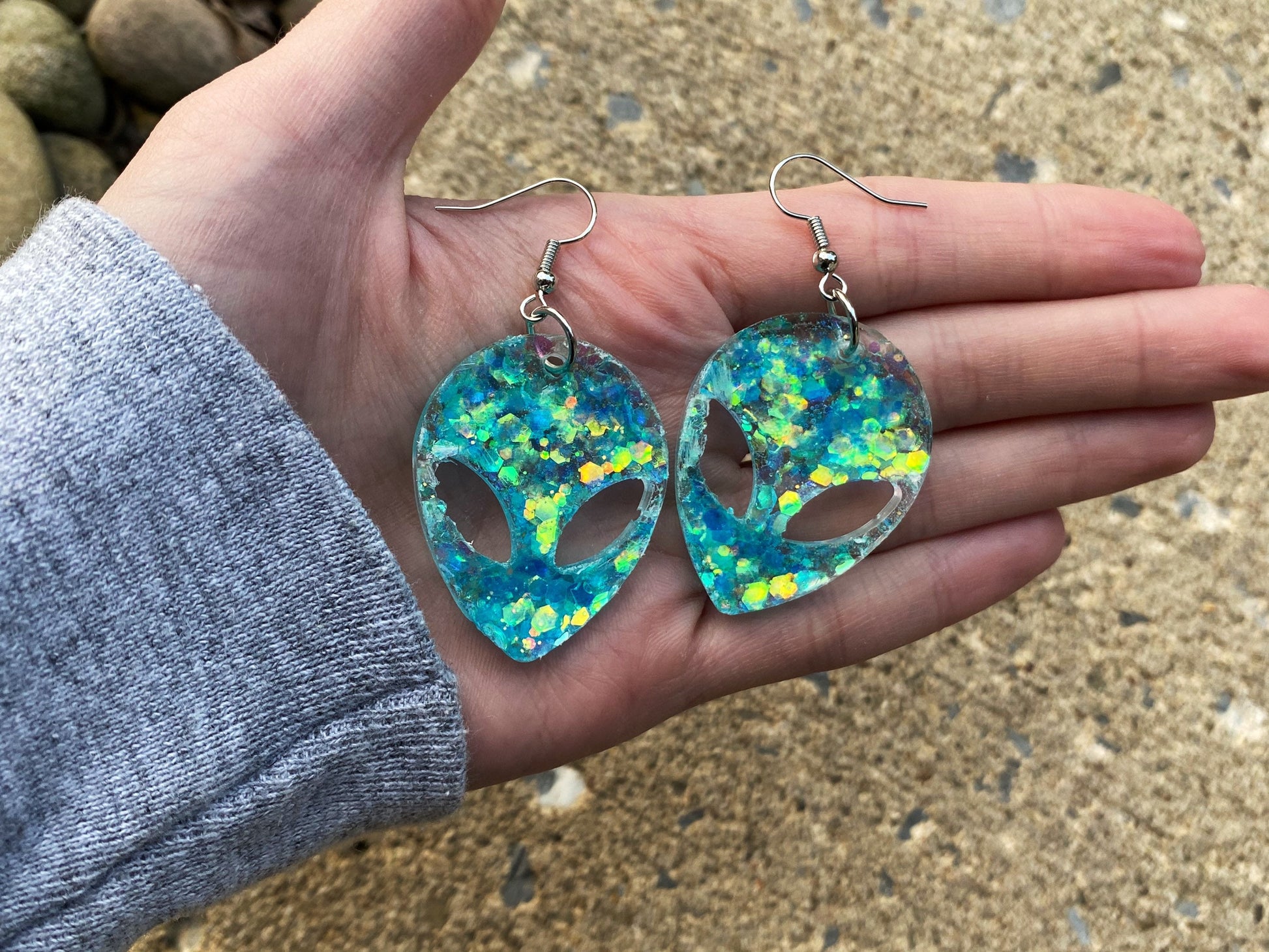 Available for remake in multiple colors :) Handmade resin alien head earrings. Made using epoxy resin and hardener, I used a gorgeous light reflective blue glitter for the base color. These earrings are very light weight and perfect for any weird rave babes👽💗 The alien heads about approximately 2 inches in length.