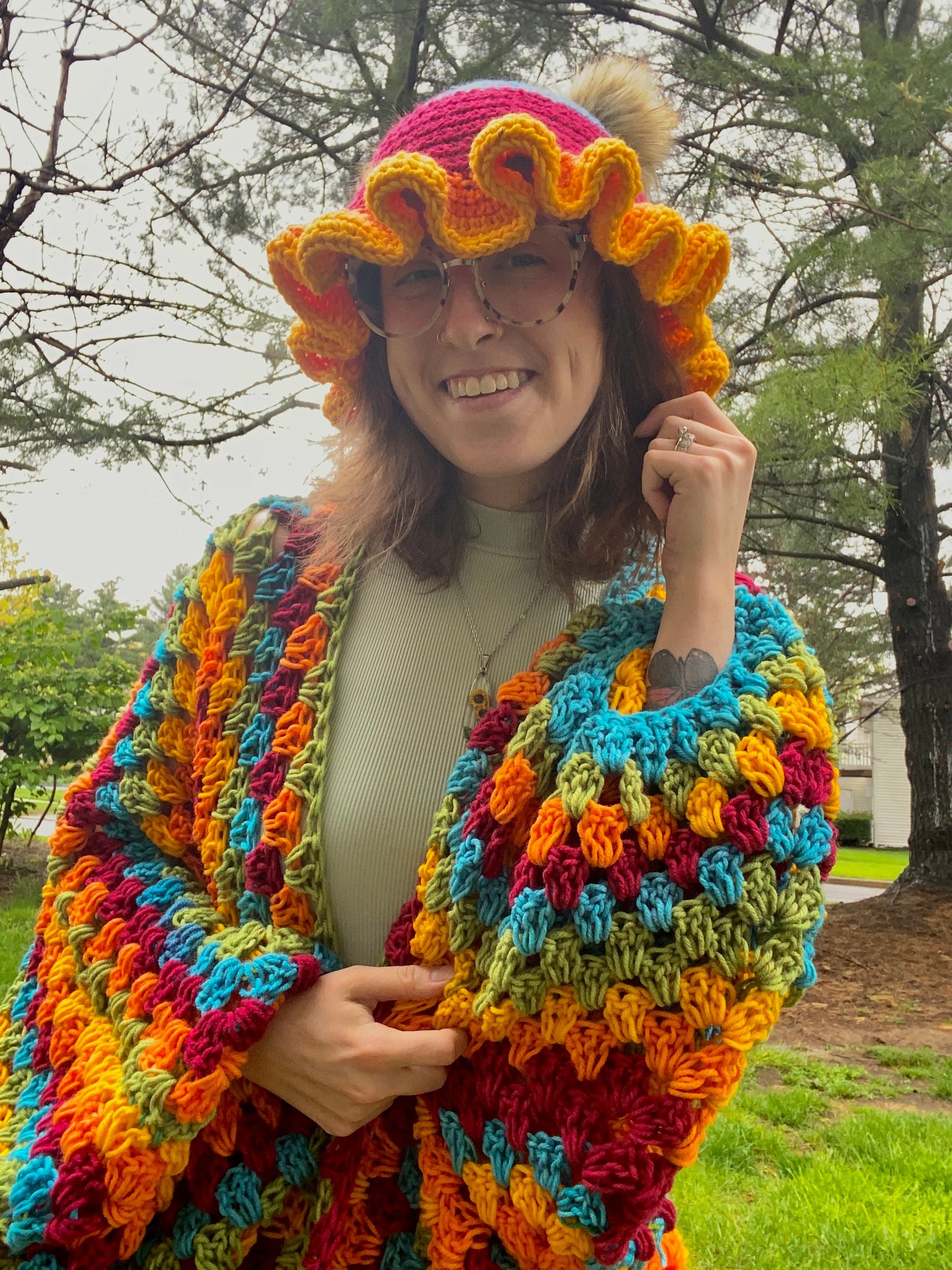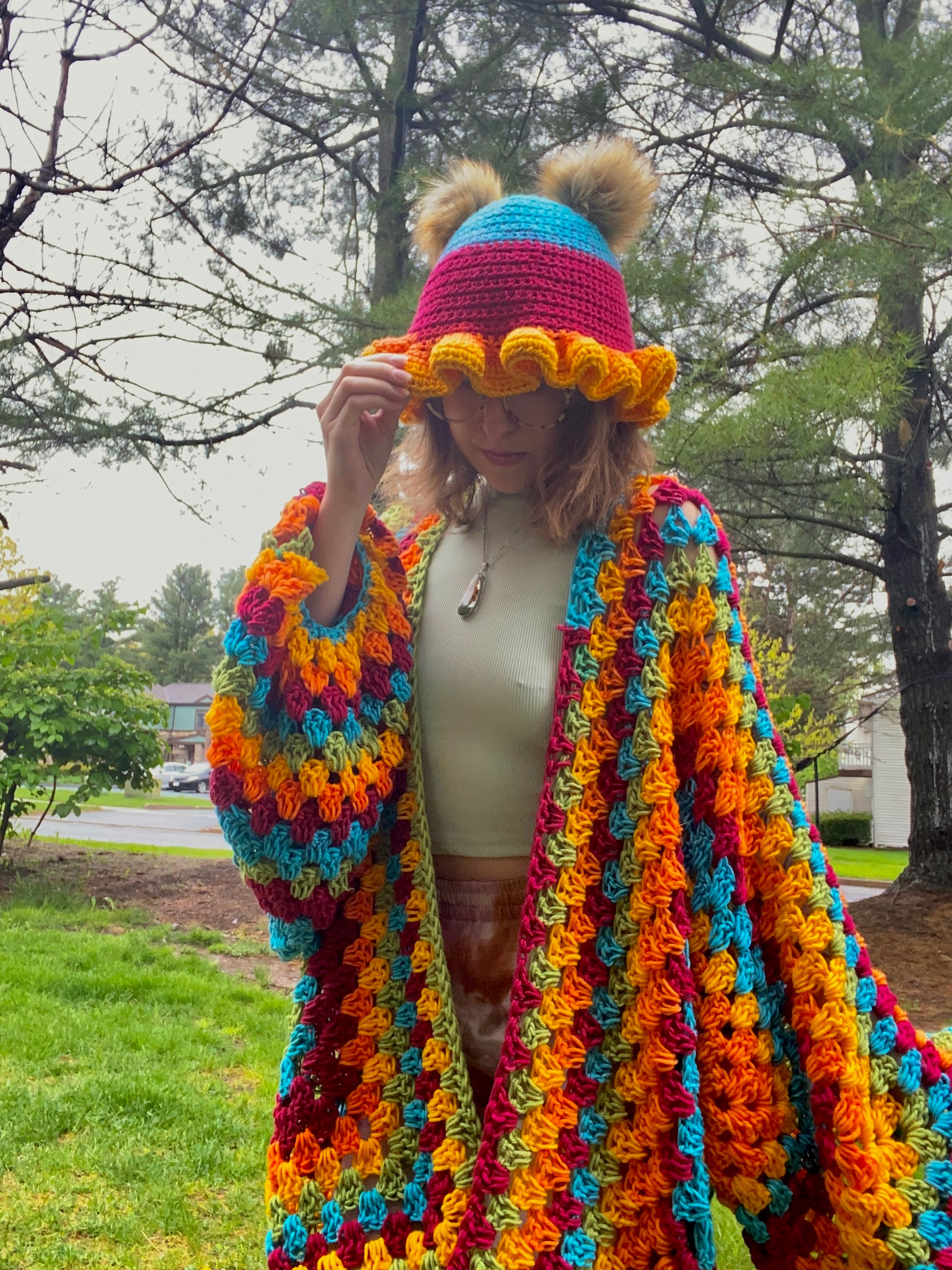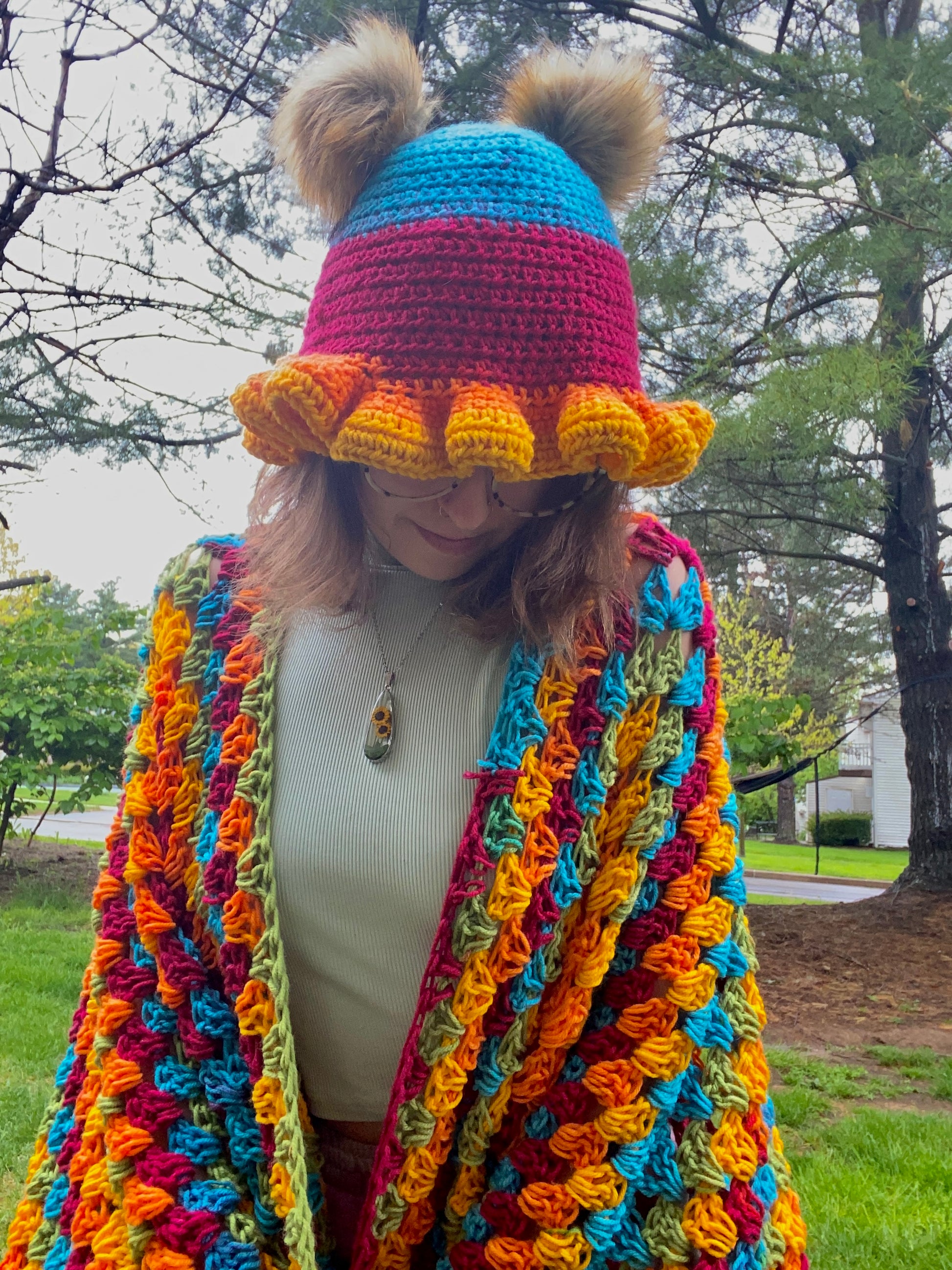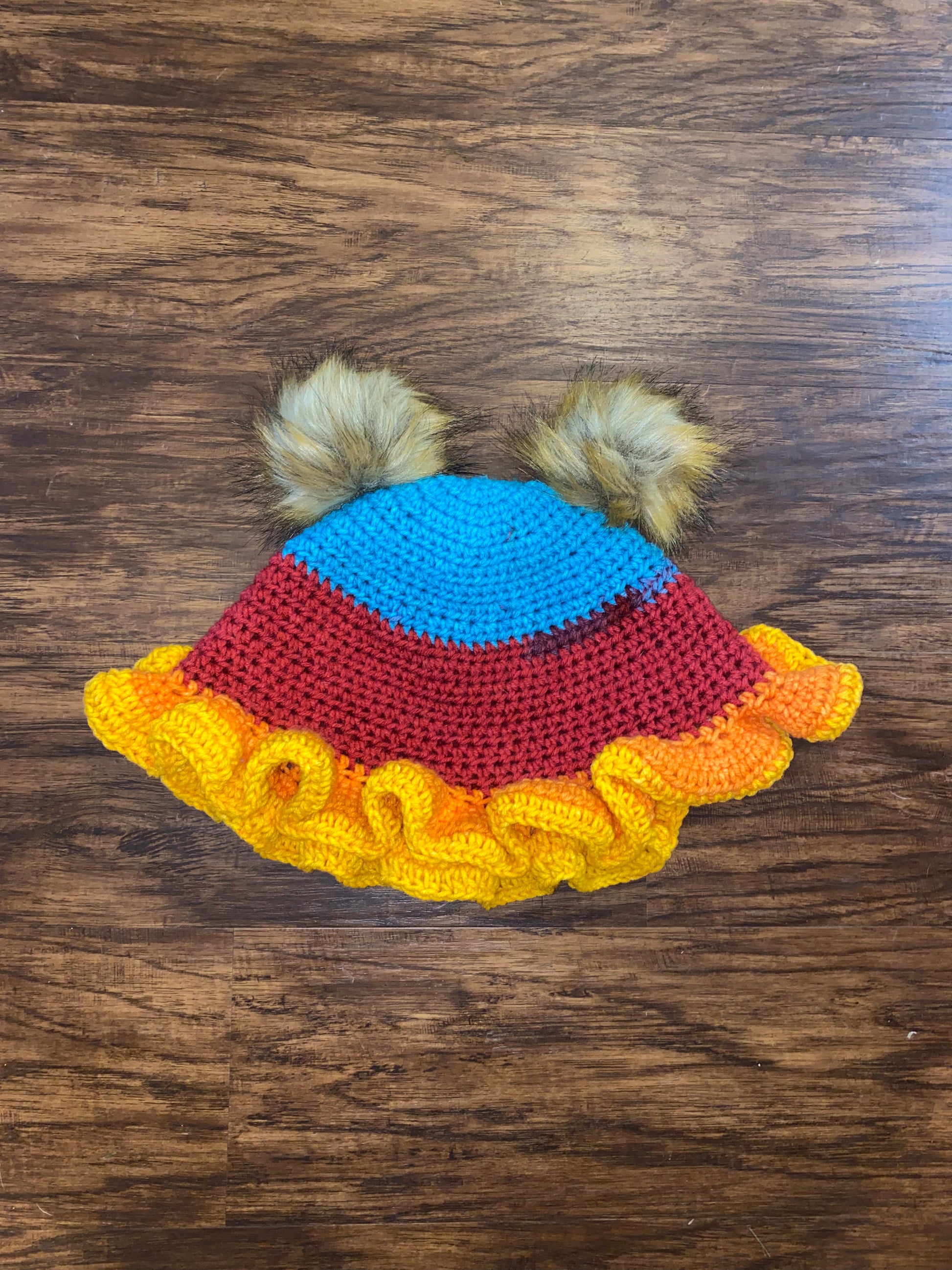 Made using an acrylic wool blend yarn and faux fur Pom Poms
