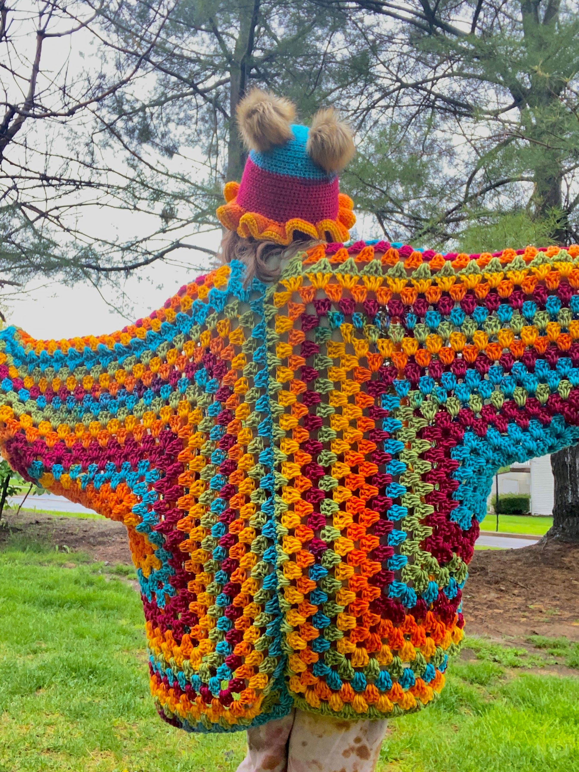 Handmade in any size using an acrylic wool blend of yarn and faux fur Pom Poms