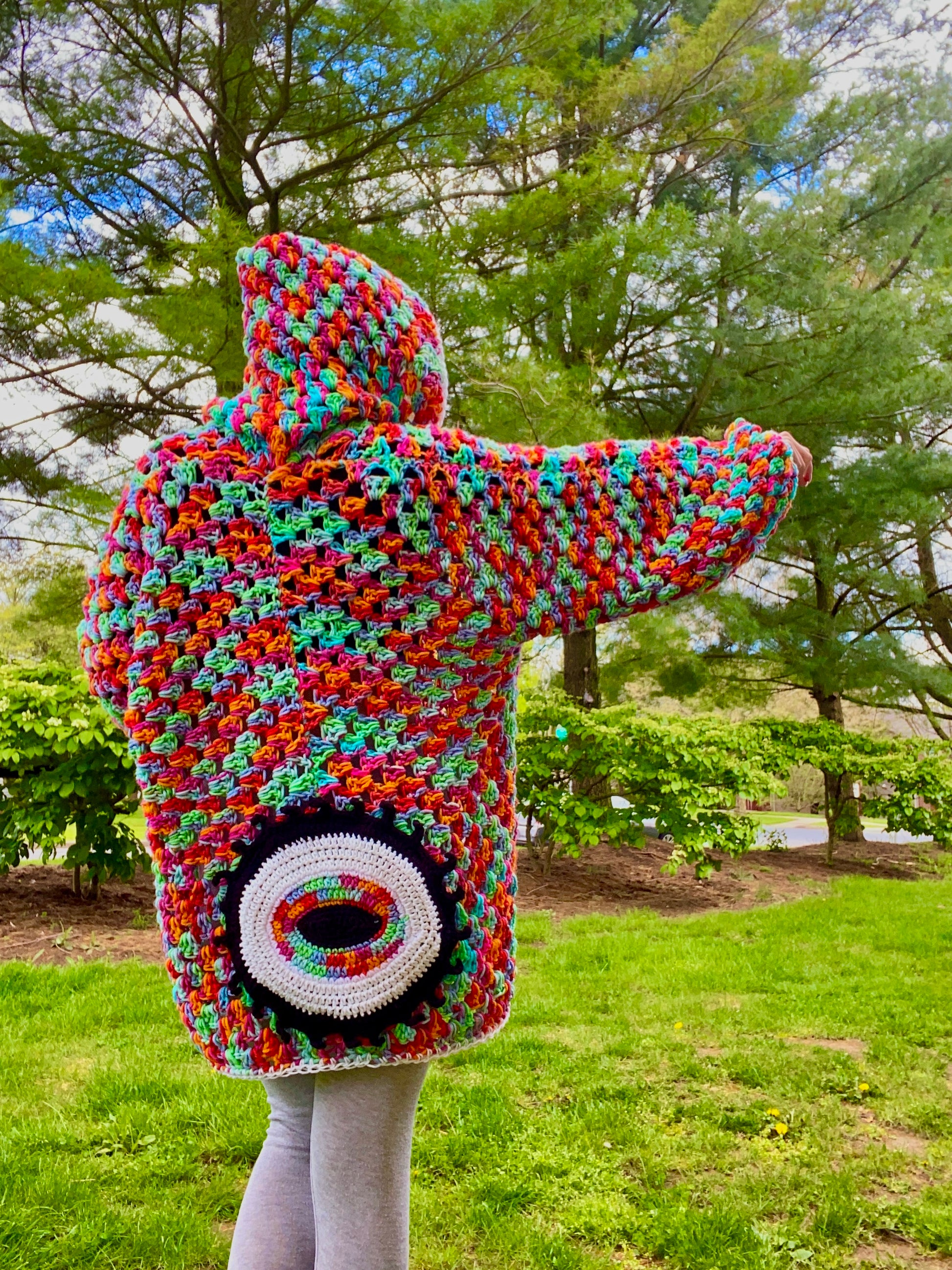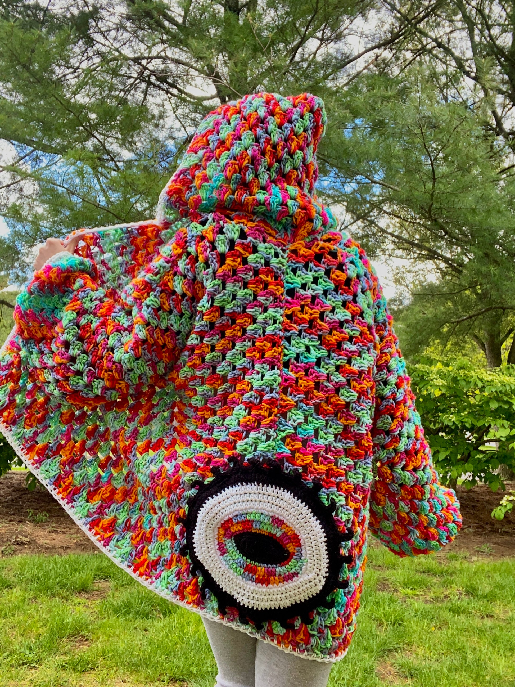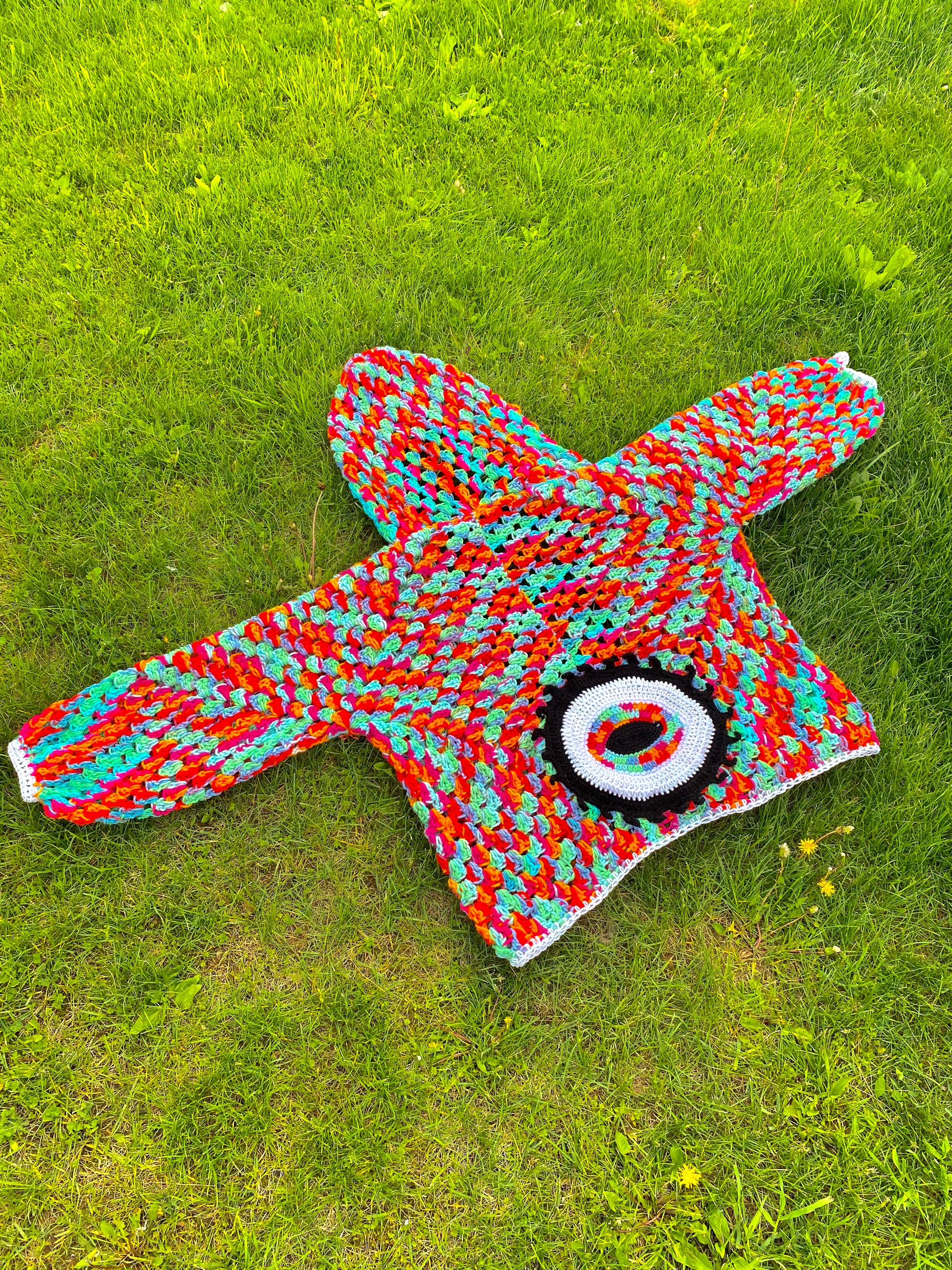 Handmade with black light reactive acrylic yarn, and glow in the dark acrylic yarn. This cardigan has a glow in the dark eye, and a glow in the dark border and sleeve cuffs.