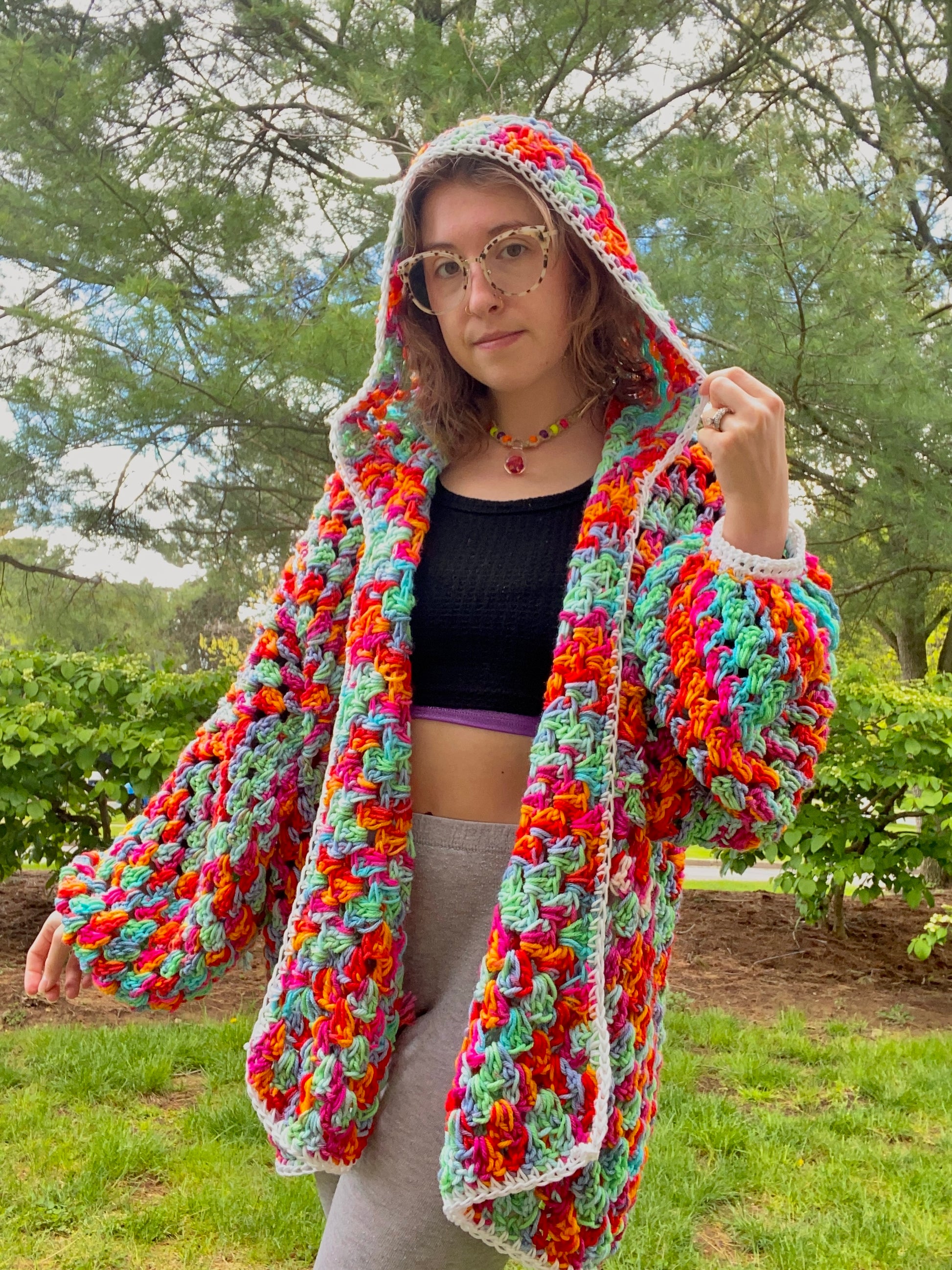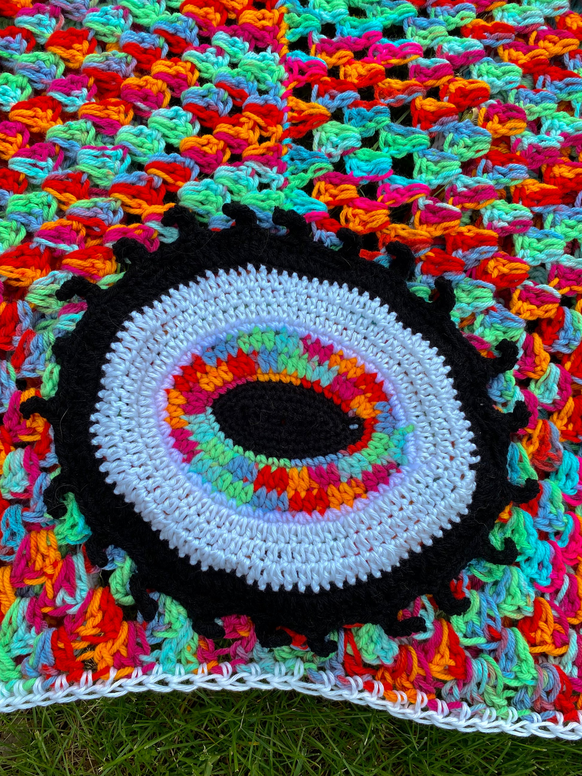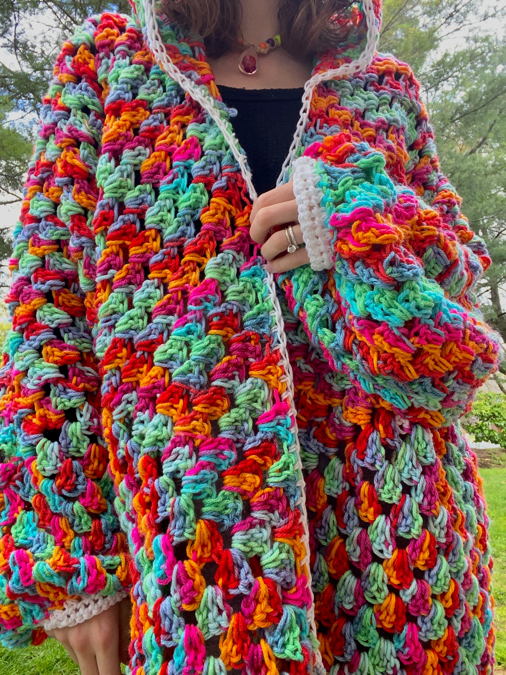 Handmade with black light reactive acrylic yarn, and glow in the dark acrylic yarn. This cardigan has a glow in the dark eye, and a glow in the dark border and sleeve cuffs.