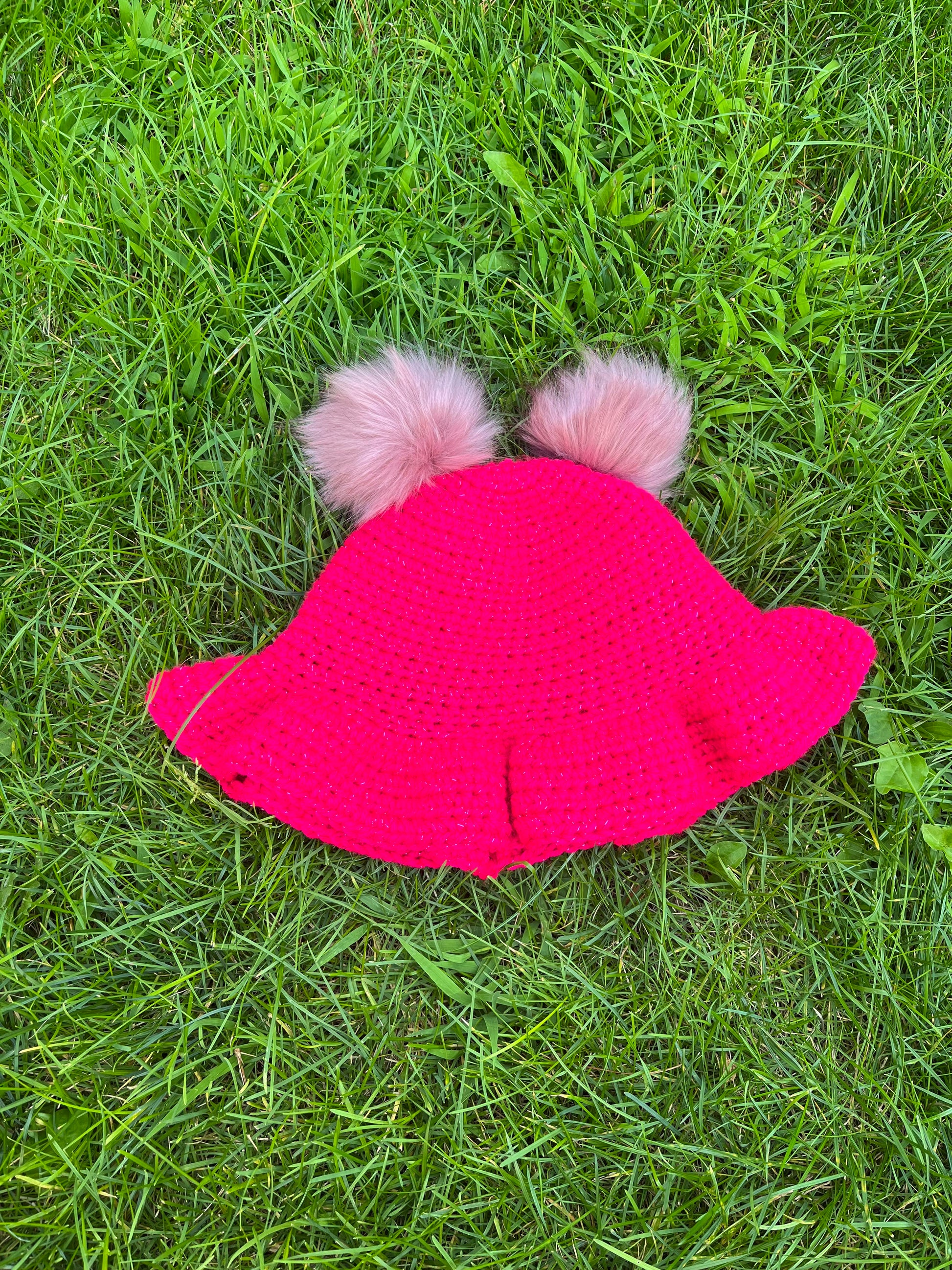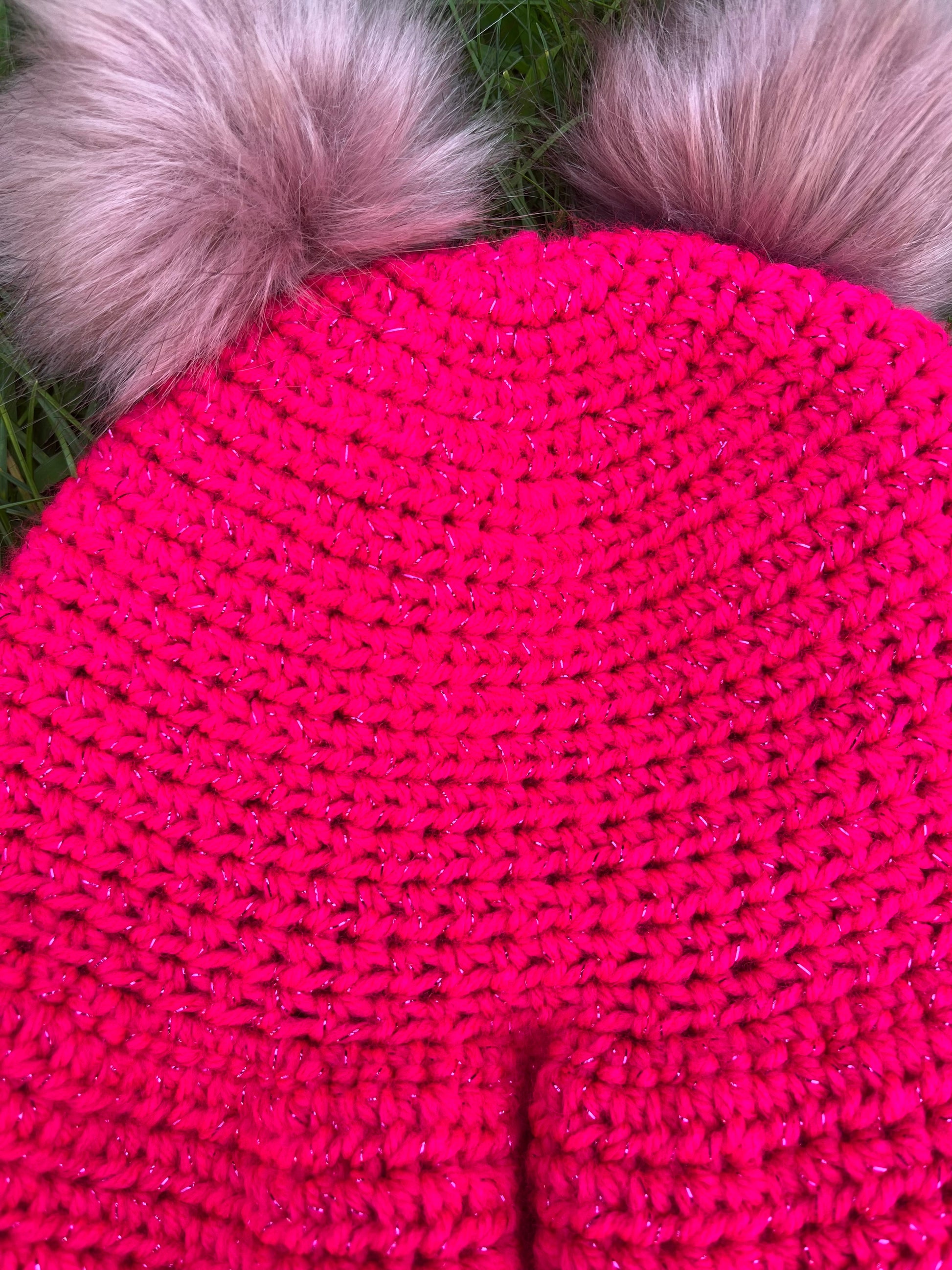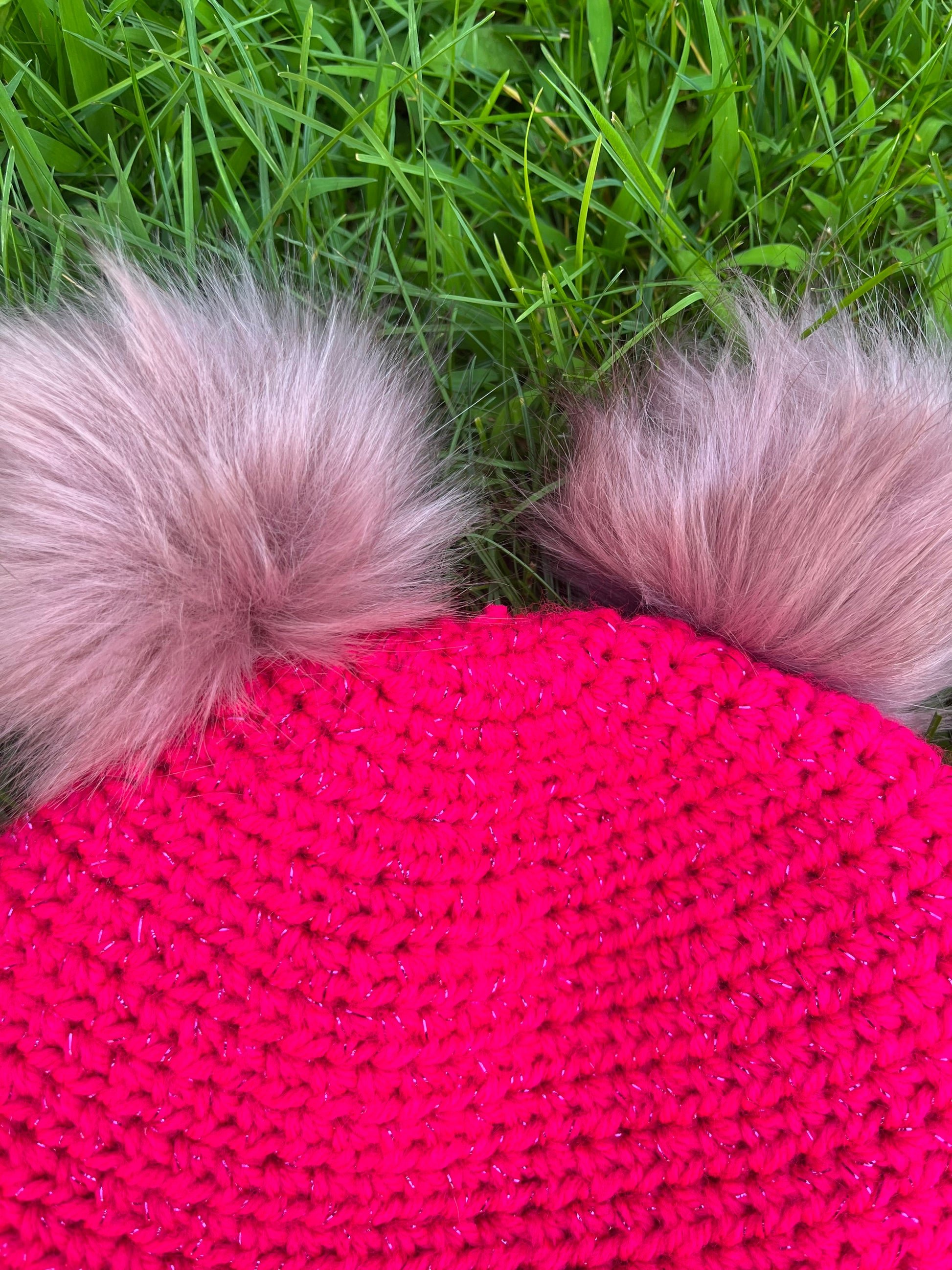 Made with sparkly soft acrylic hot pink yarn and mauve faux fur pom Poms, this aikido cap is so cute cozy and perfect for Wednesdays😉