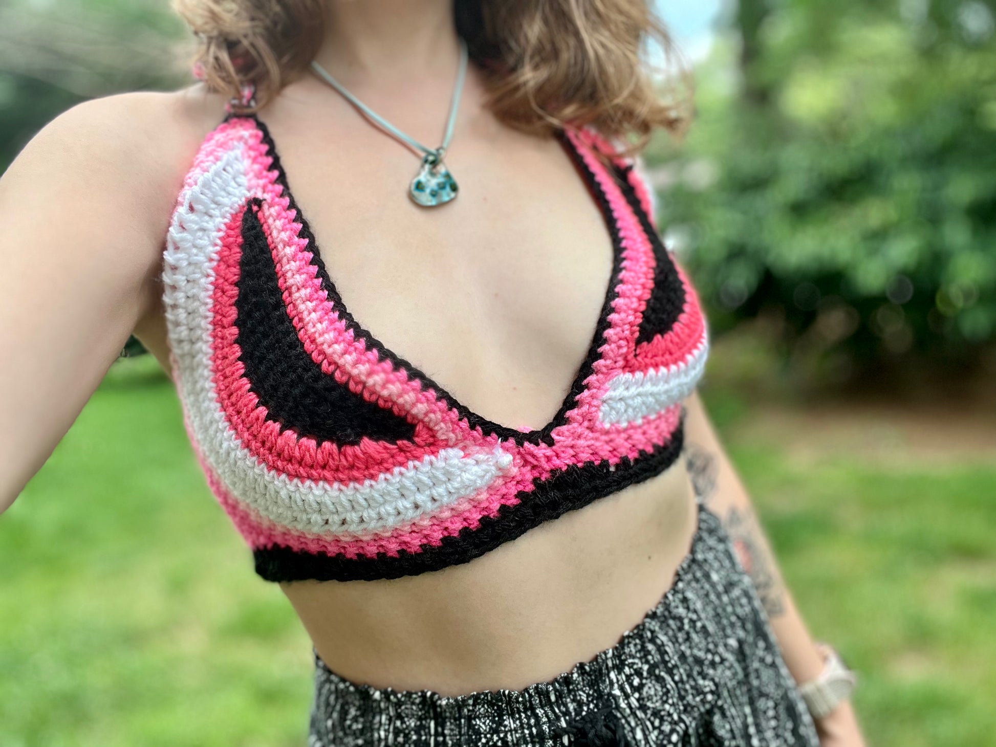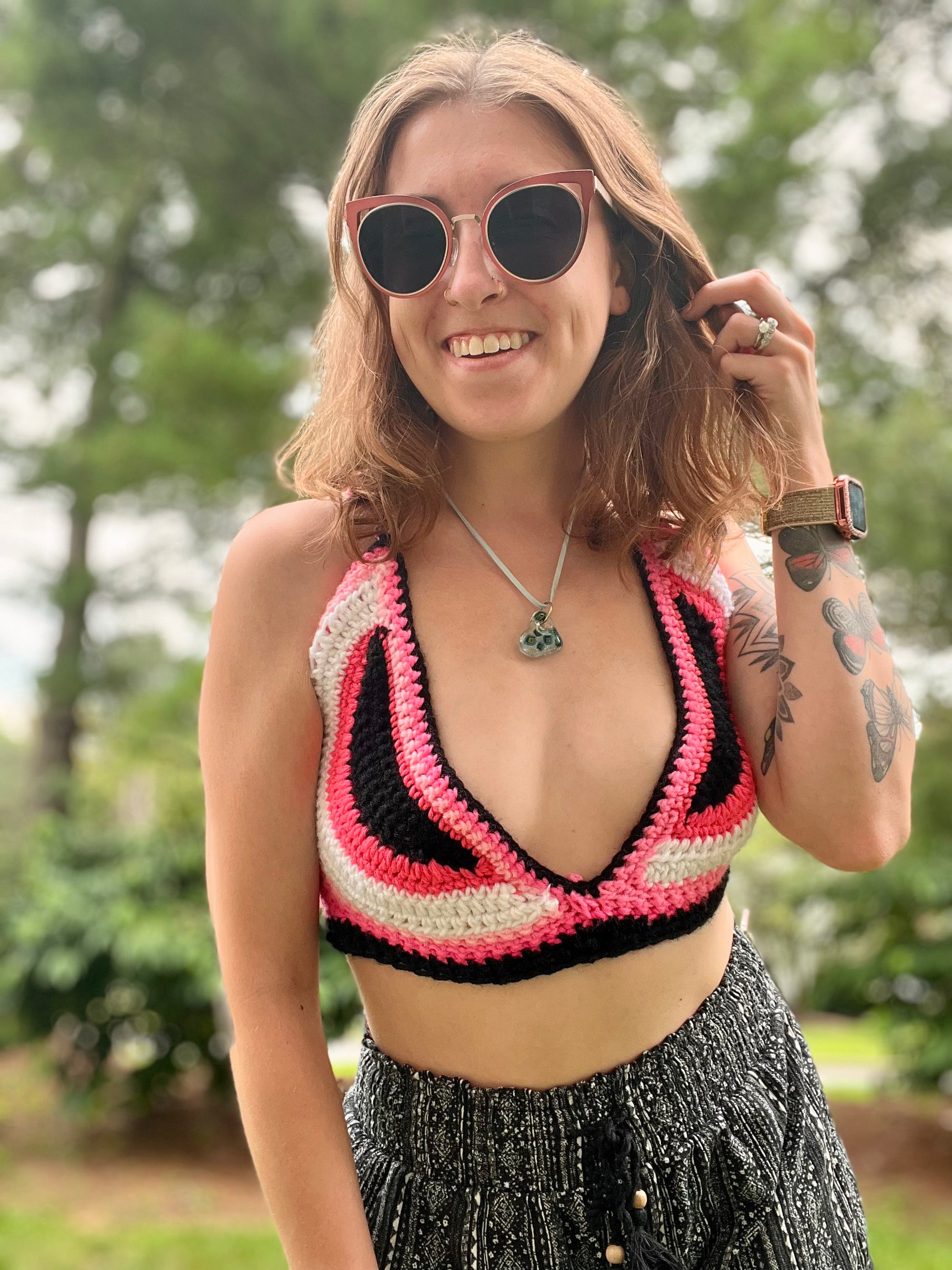 this top best fits sizes M-XXL, and larger size S (I am a size small and this top is a little more open on the chest than I wear)