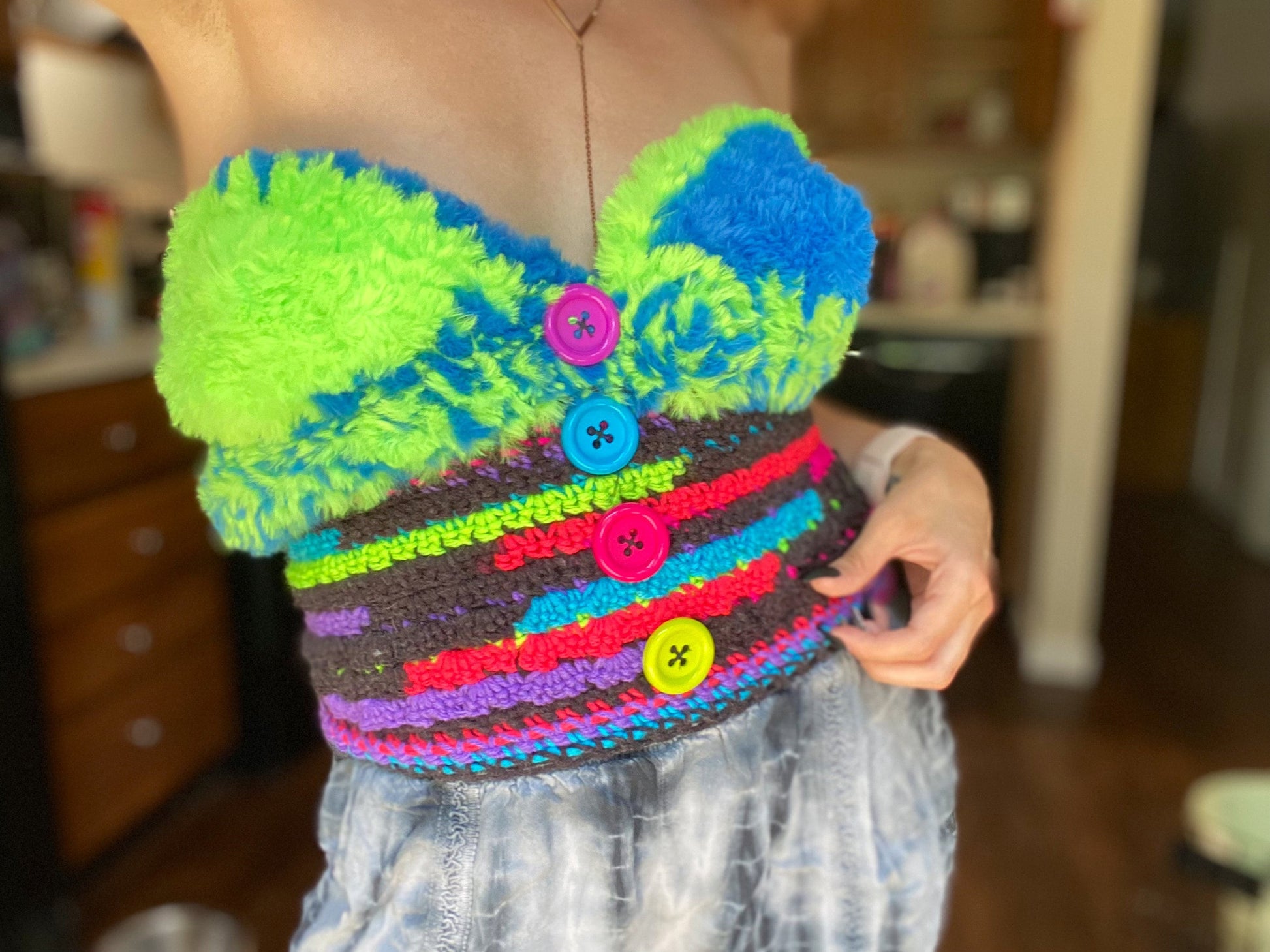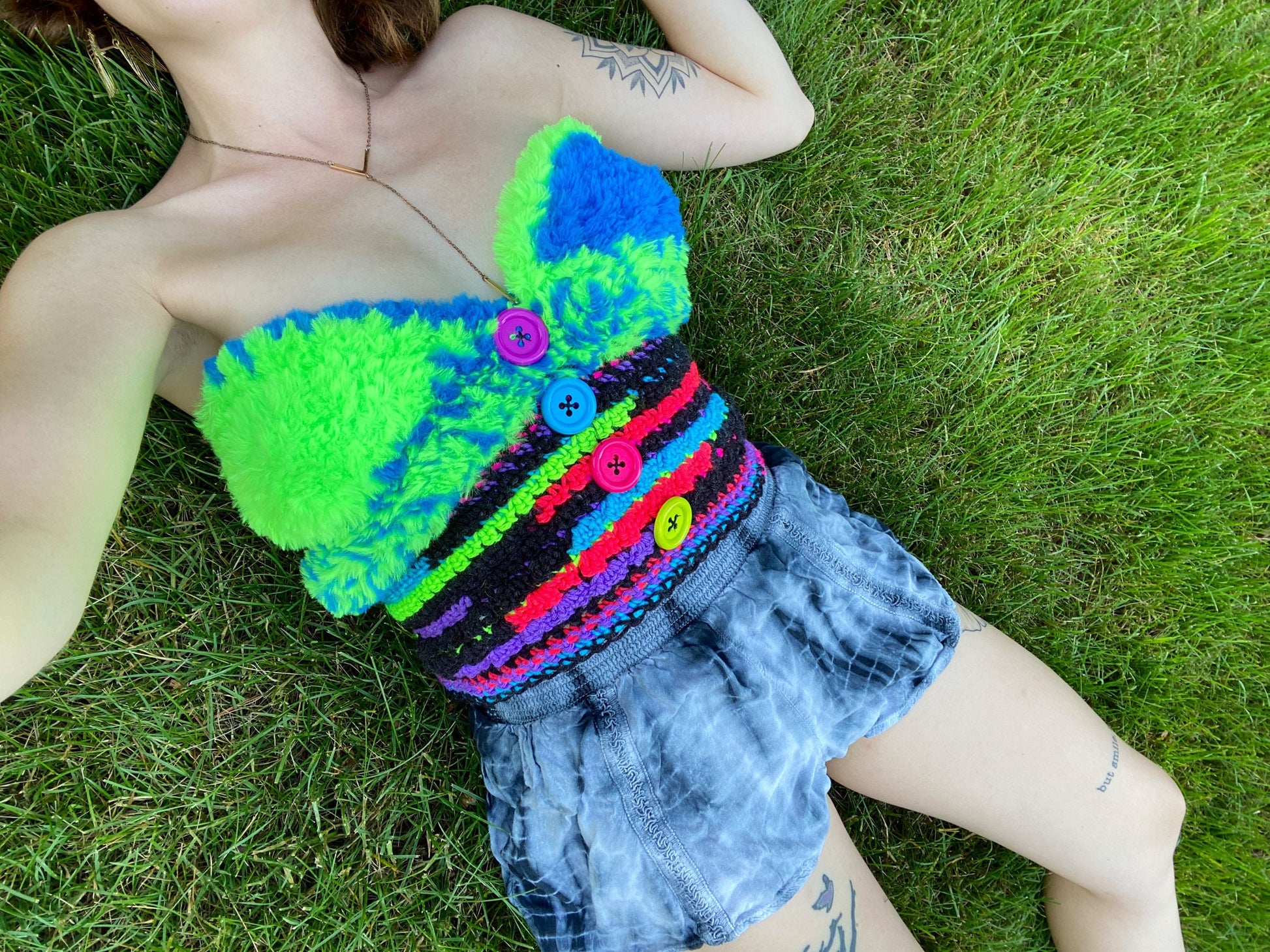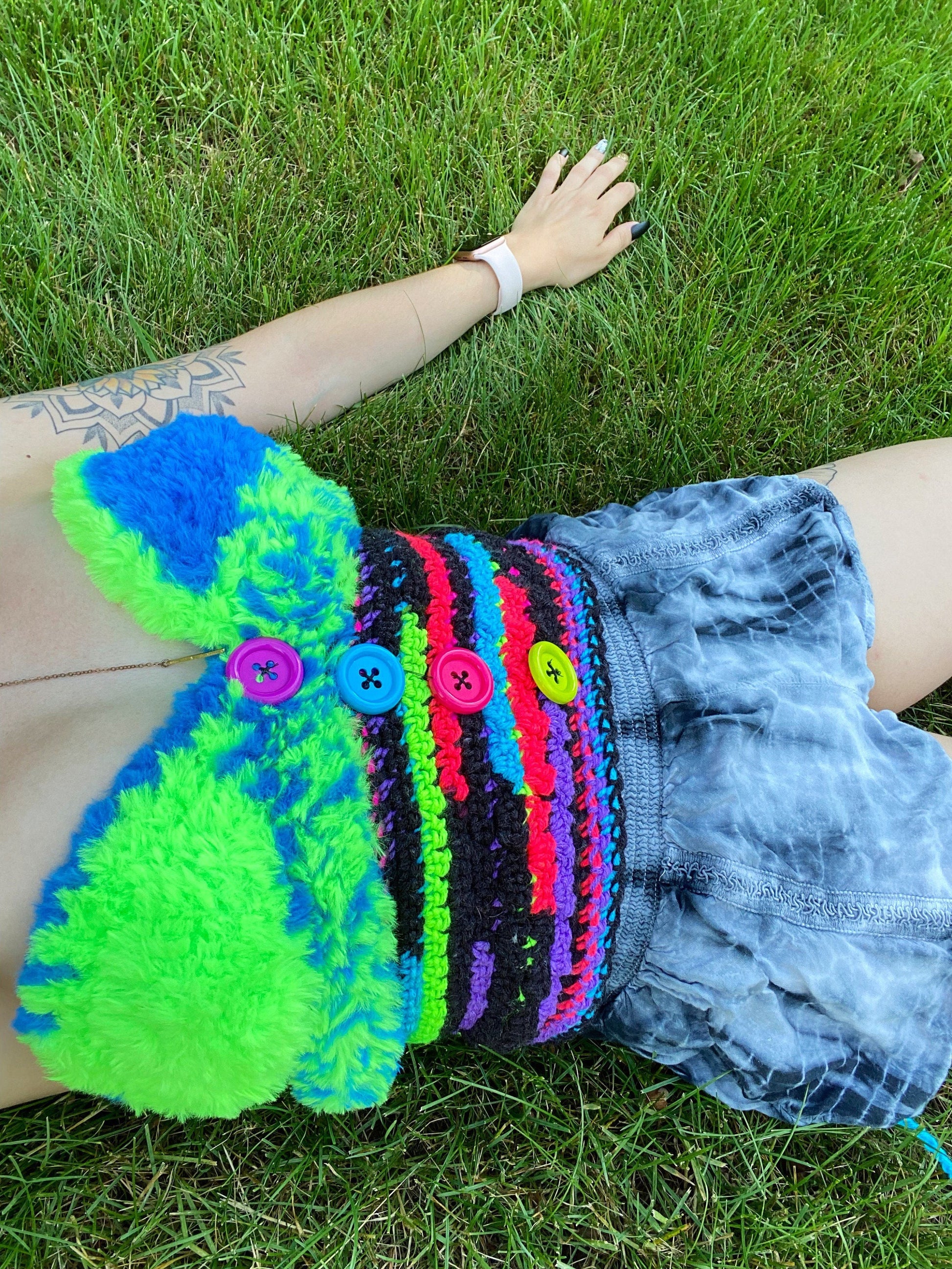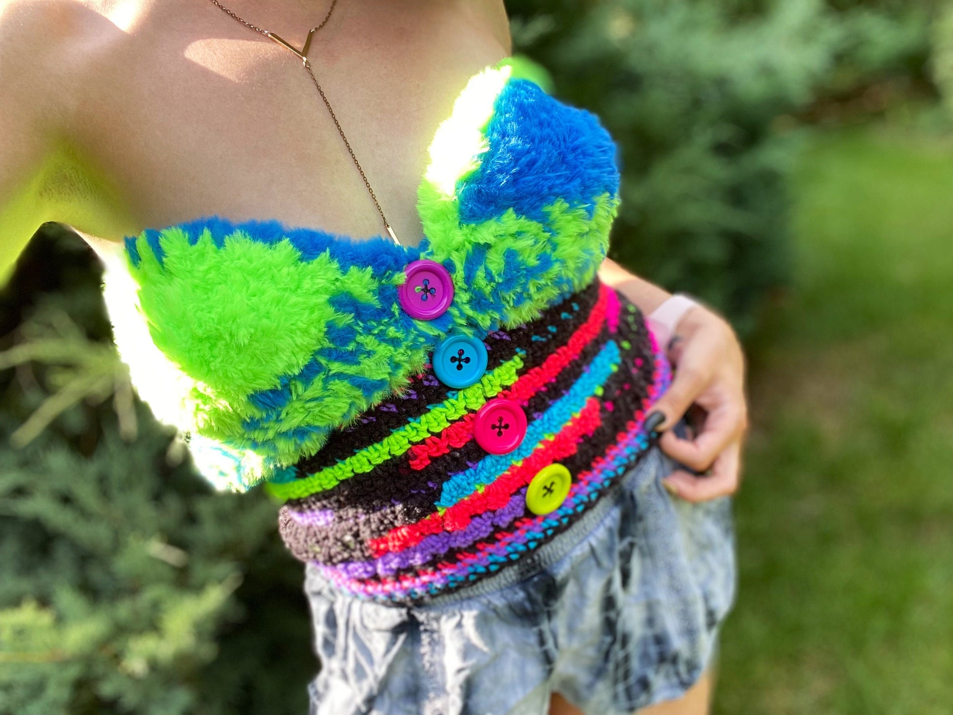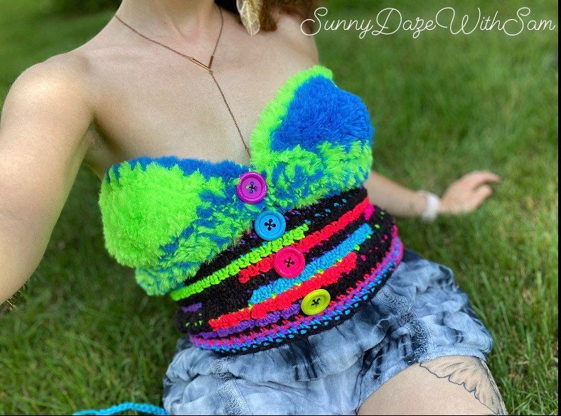 This piece is made to order specific to your size you can message me your specific measurements So I can make your top the perfect fit for you. This is my second corset style that i have available on my shop! This top is made of black and neon acrylic yarn and fuzzy faux fur. All of the yarn used is black light in UV light reactive and looks so cool!!! Look at those gorgeous large buttons! Adding some flare to a simple style top! This top comes with adjustable straps for different styles and looks it’s perfect for going out getting sexy Raves concerts and even casualwear if you wanna add a little BAM to your look :) This top will be available in different colors :)