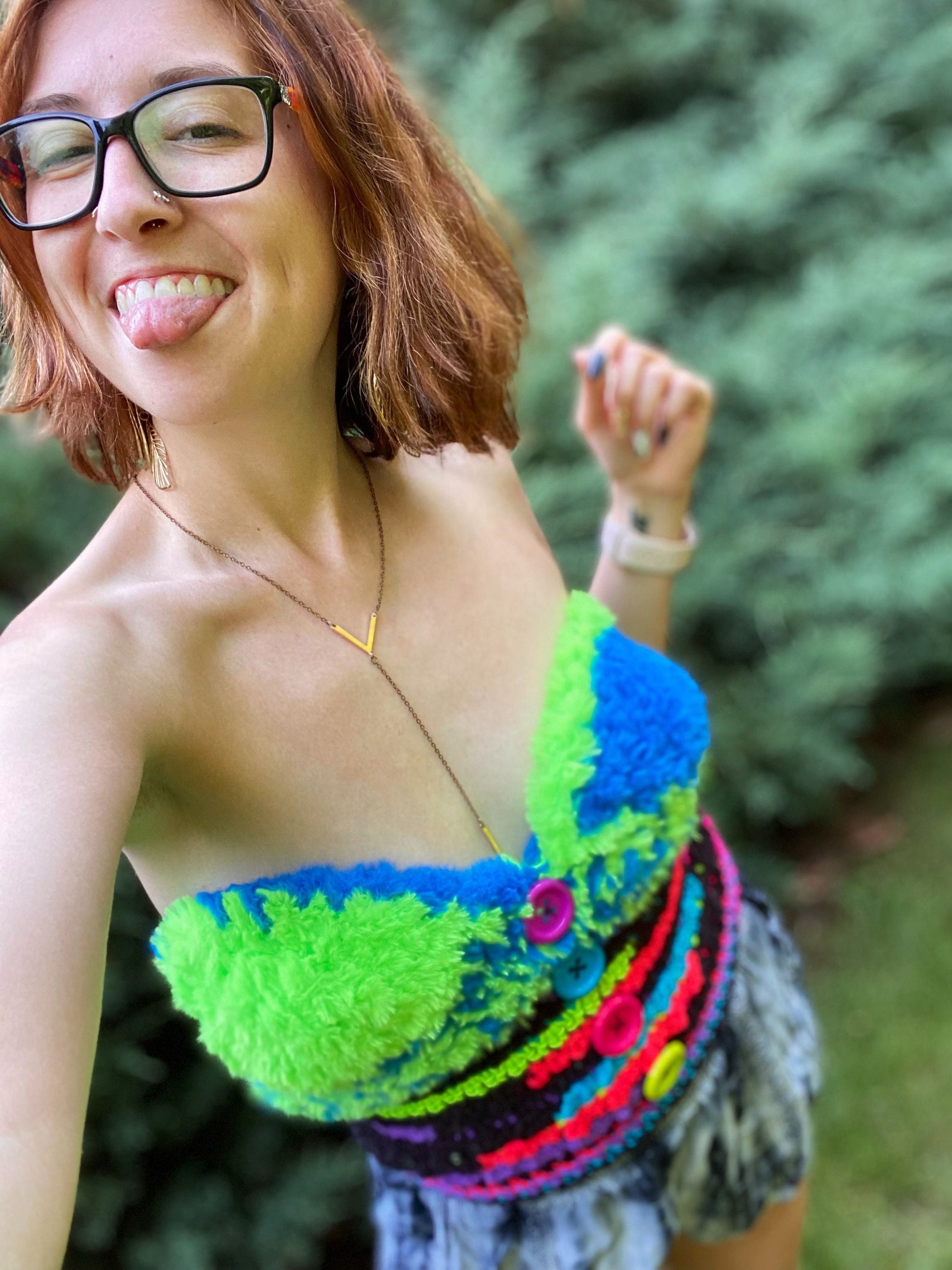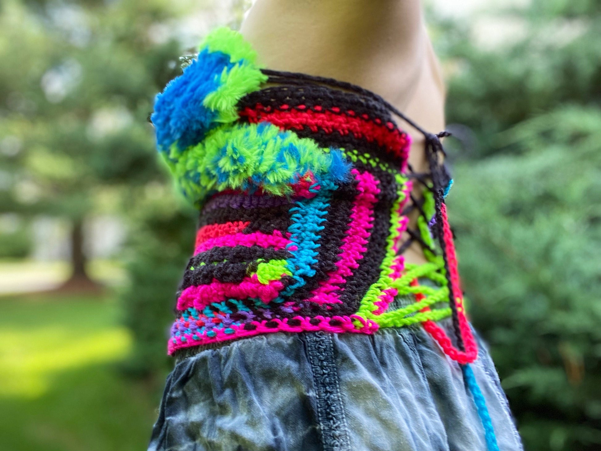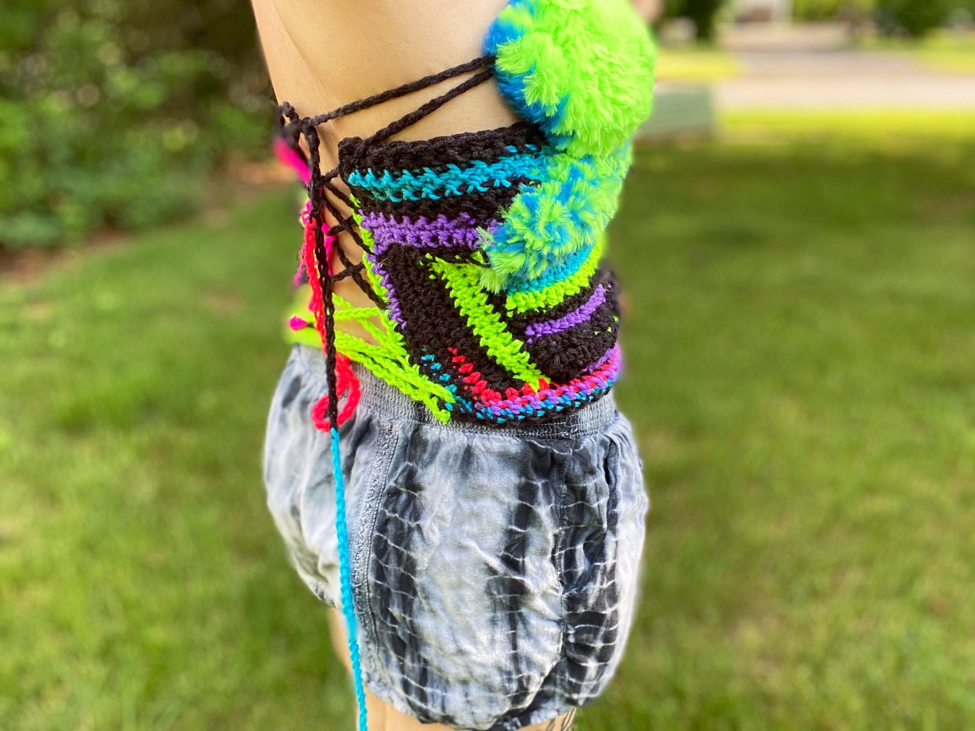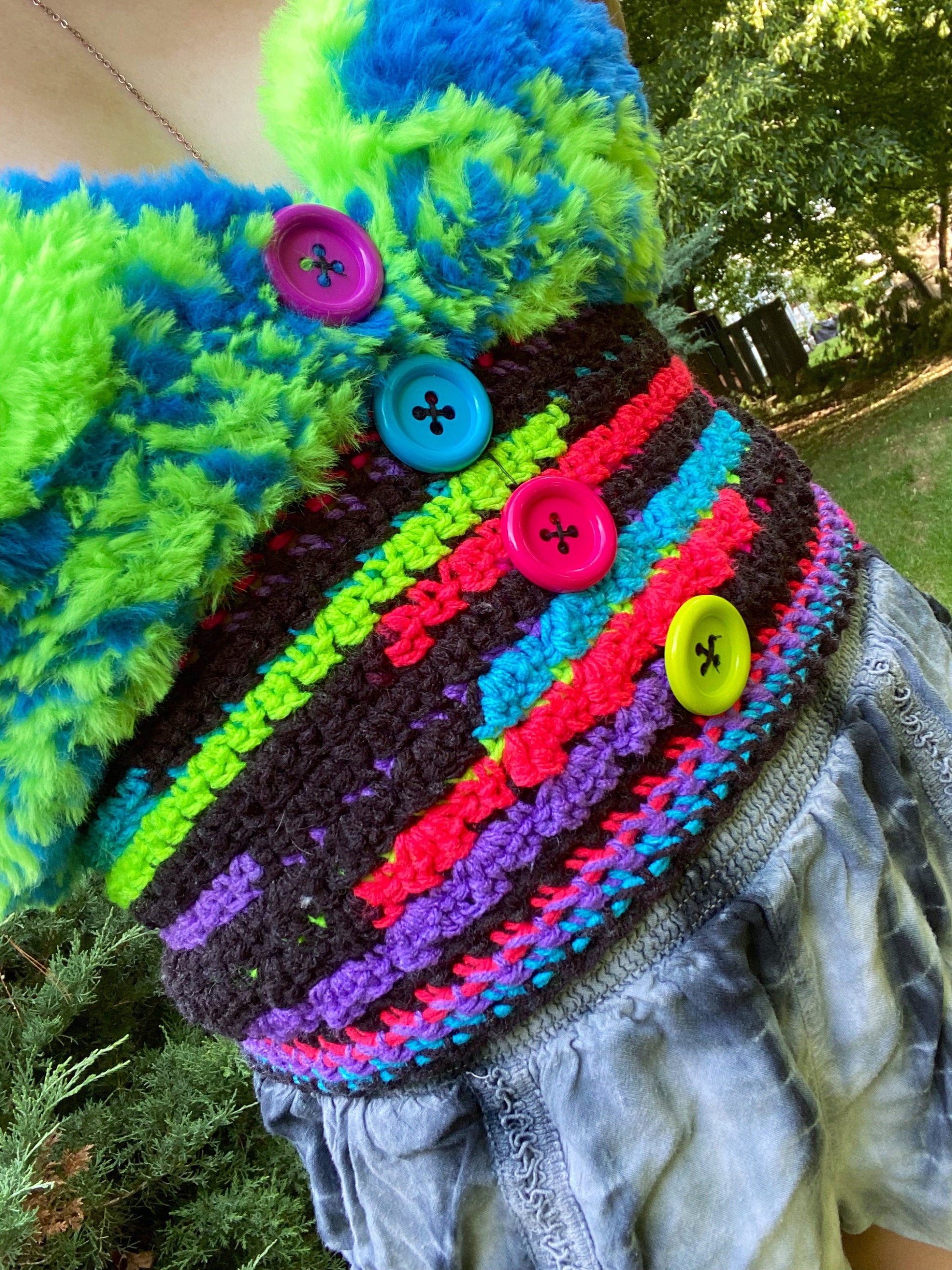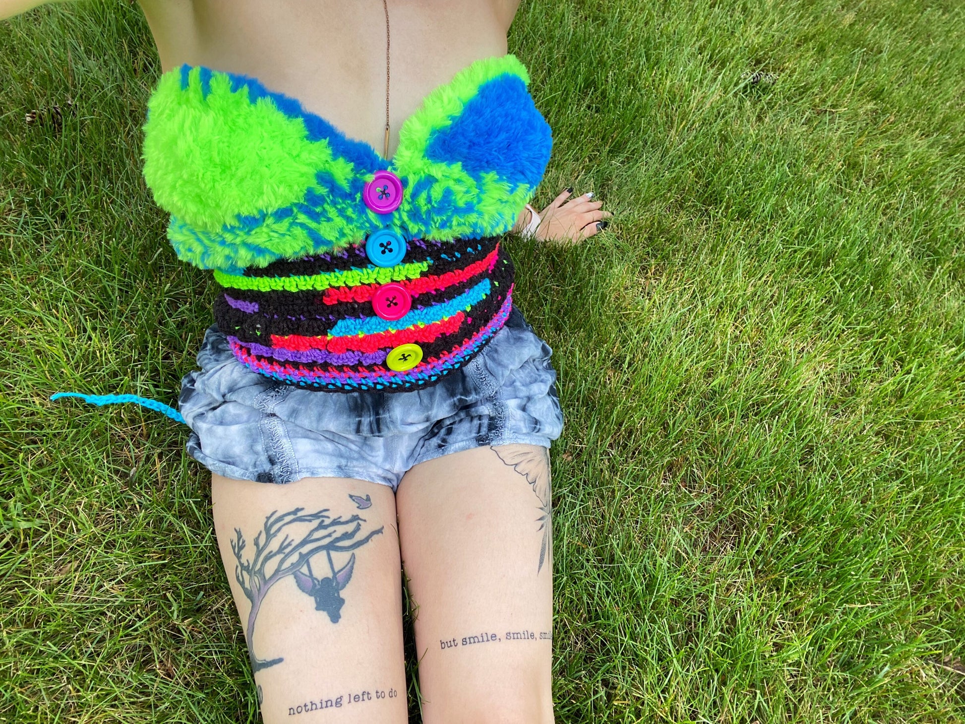 This piece is made to order specific to your size you can message me your specific measurements So I can make your top the perfect fit for you. This is my second corset style that i have available on my shop! This top is made of black and neon acrylic yarn and fuzzy faux fur. All of the yarn used is black light in UV light reactive and looks so cool!!! Look at those gorgeous large buttons! Adding some flare to a simple style top! This top comes with adjustable straps for different styles and looks it’s perfect for going out getting sexy Raves concerts and even casualwear if you wanna add a little BAM to your look :) This top will be available in different colors :)