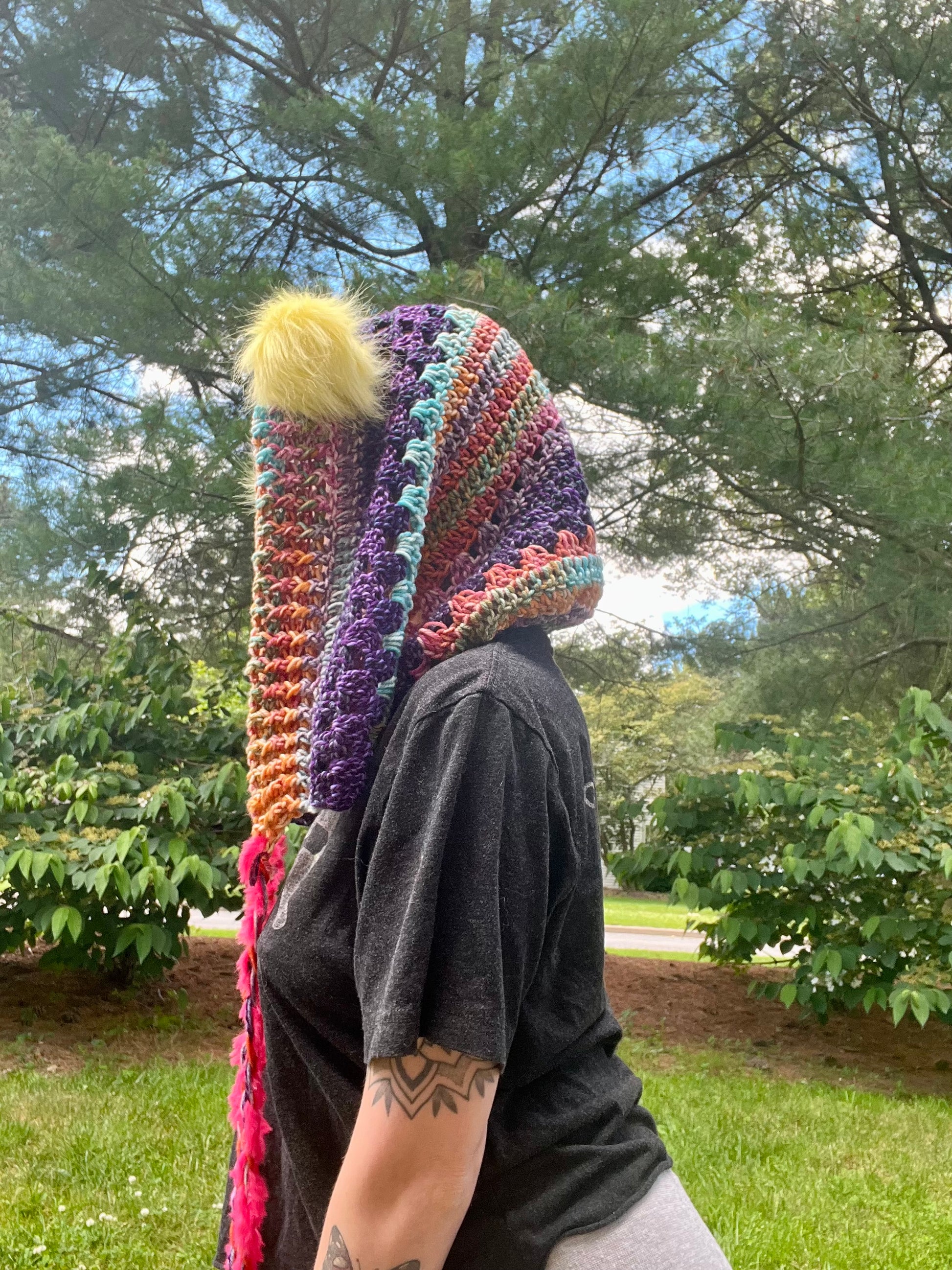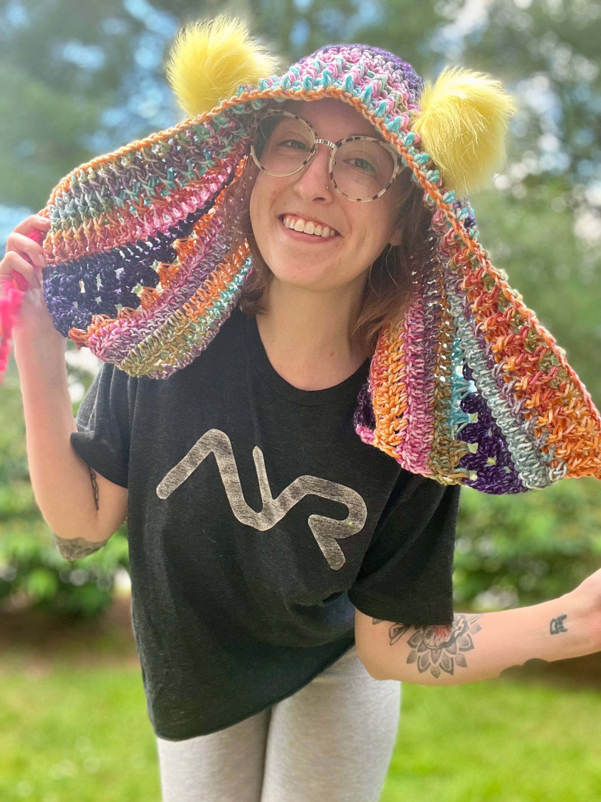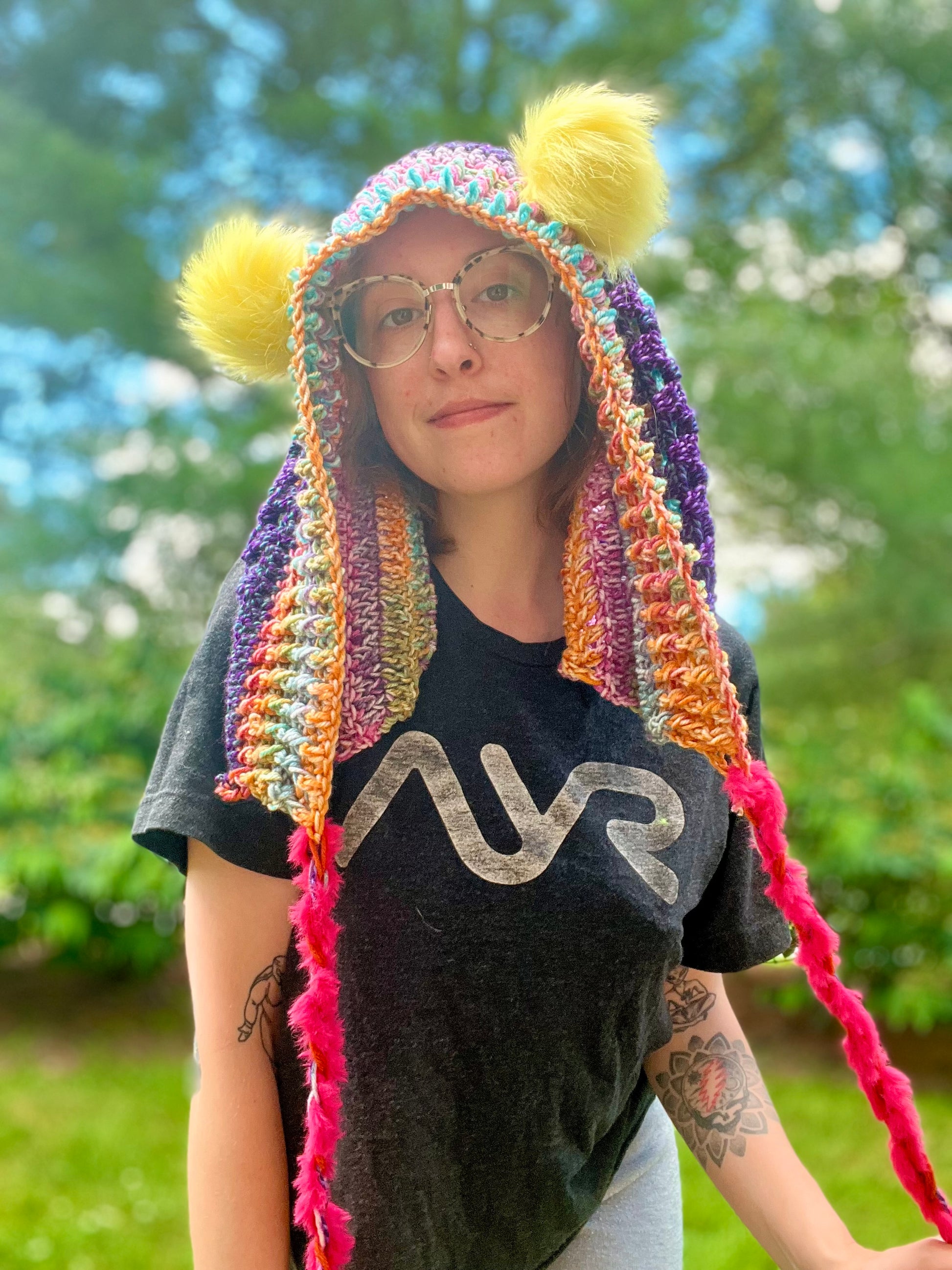 Made with acrylic yarn, faux fur acrylic yarn, and faux fur Pom Pom ears