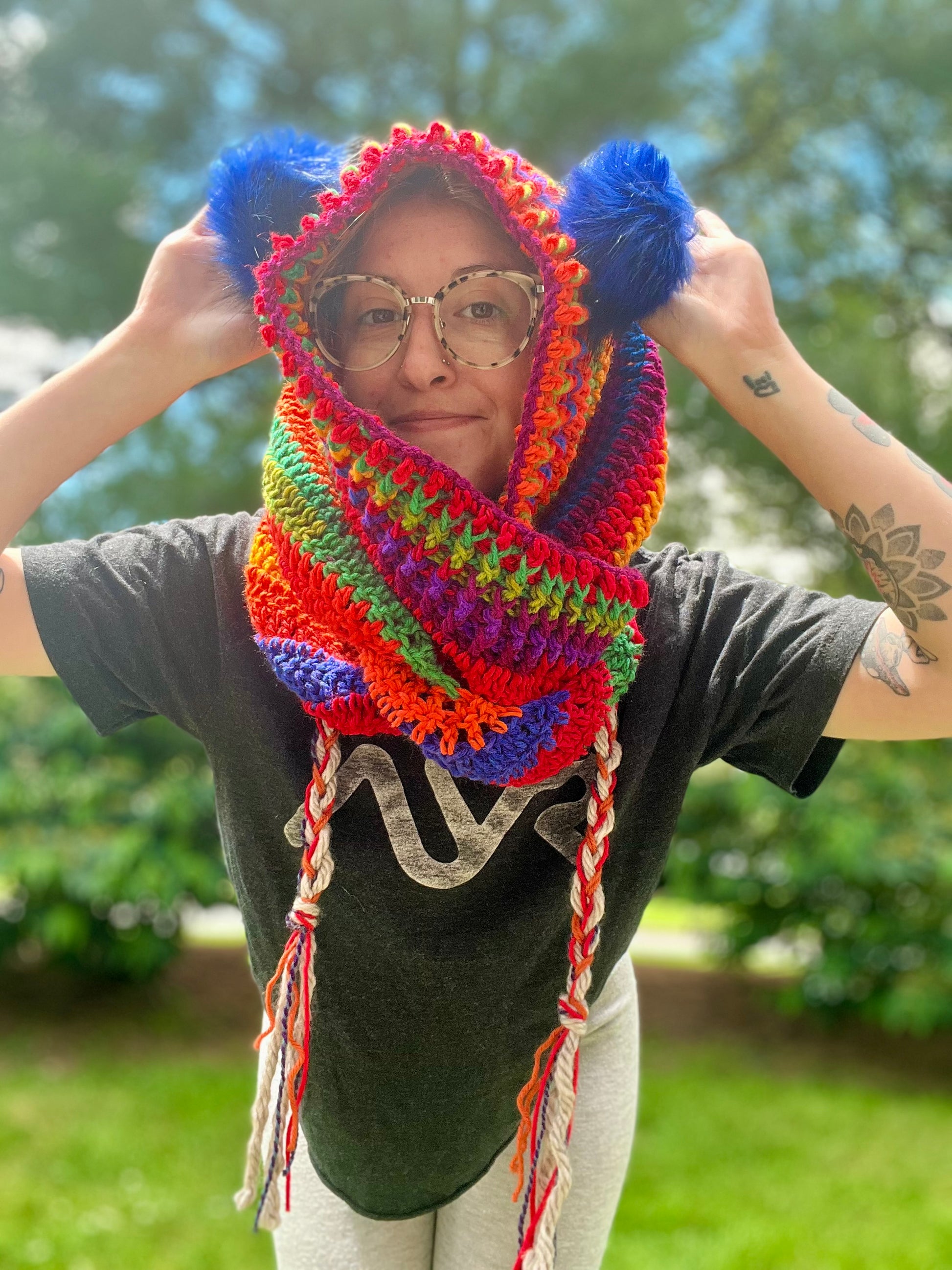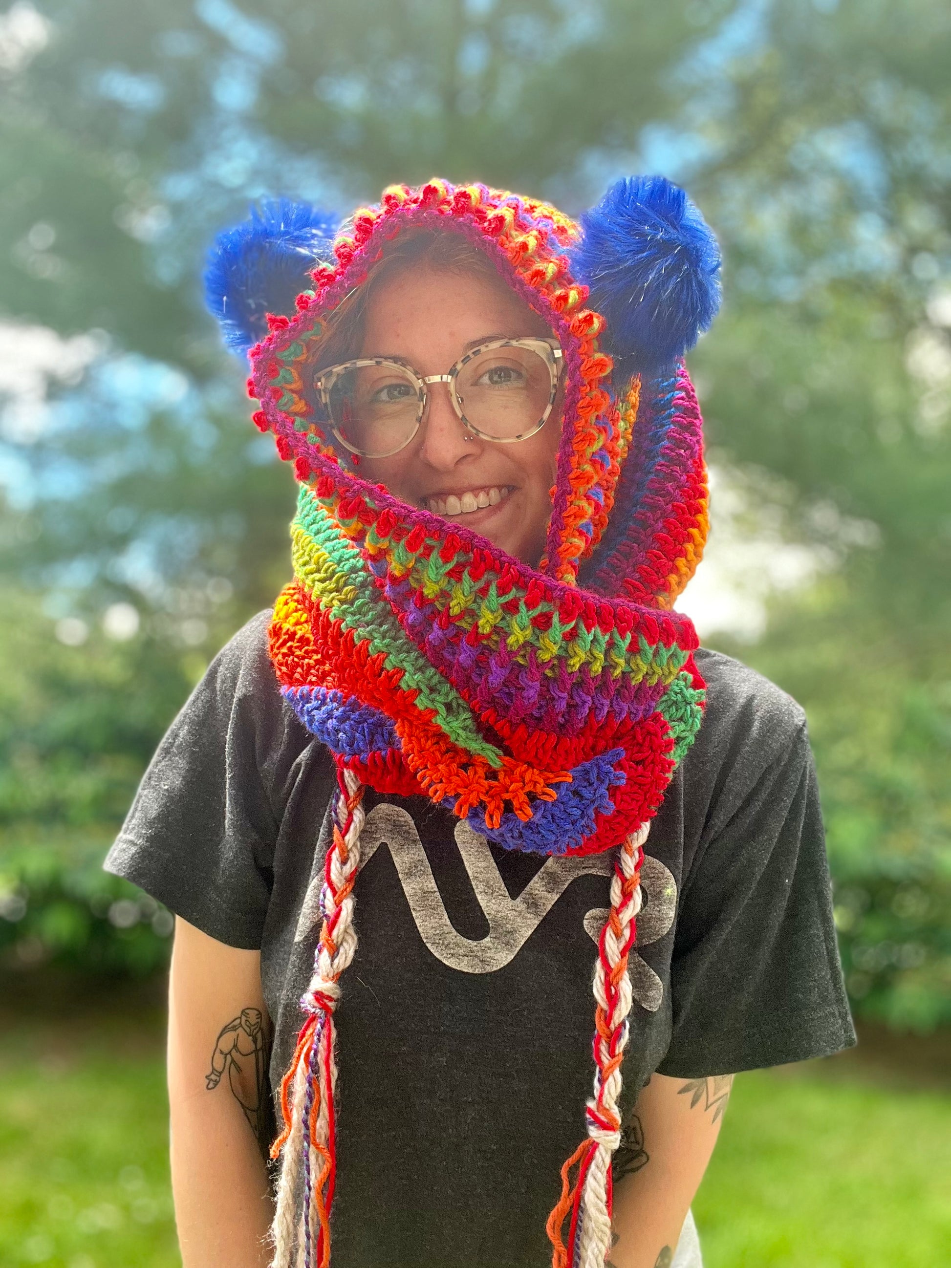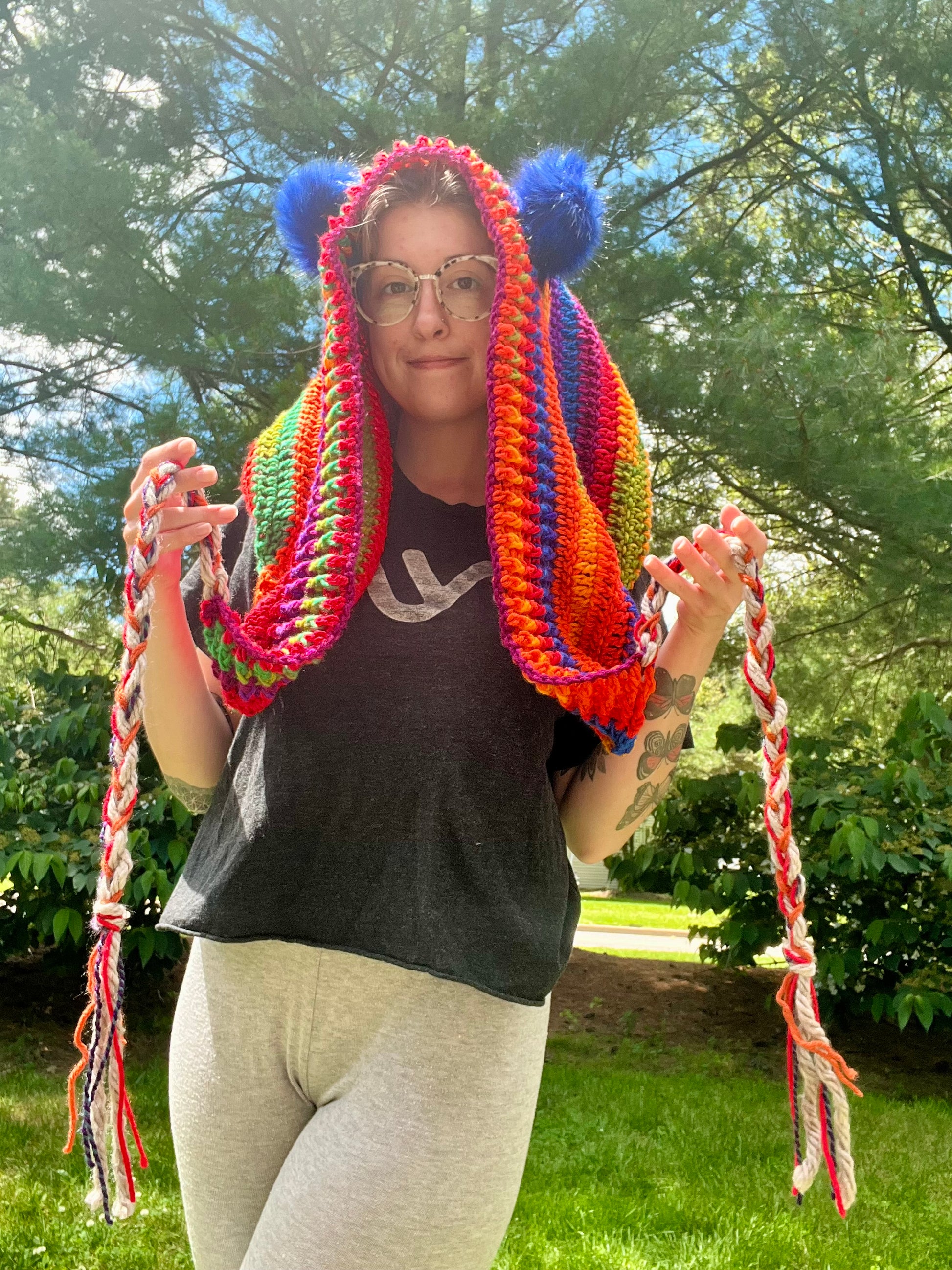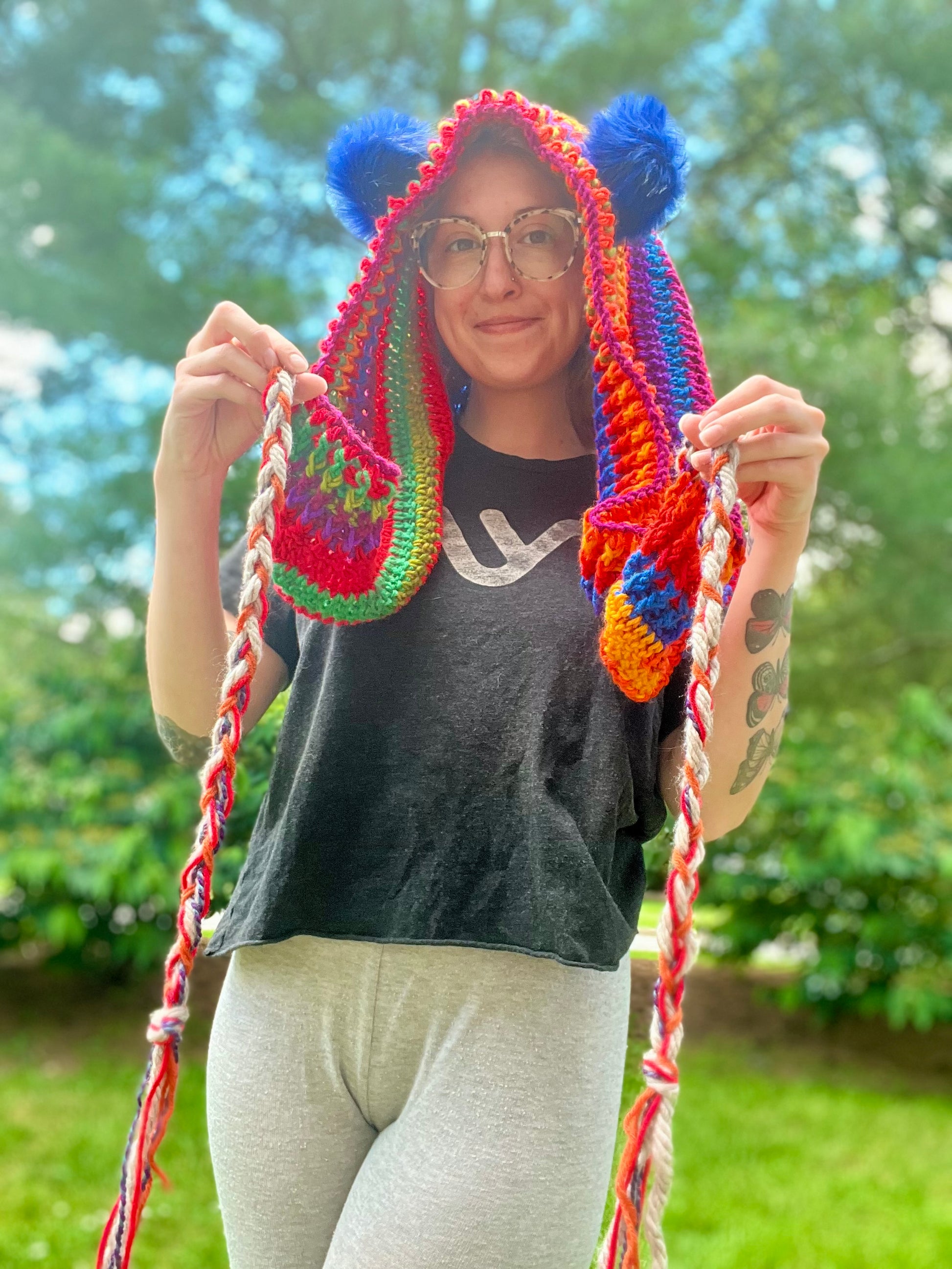 Made with acrylic yarn, faux fur acrylic yarn, and faux fur Pom Pom ears, and wool braided ties