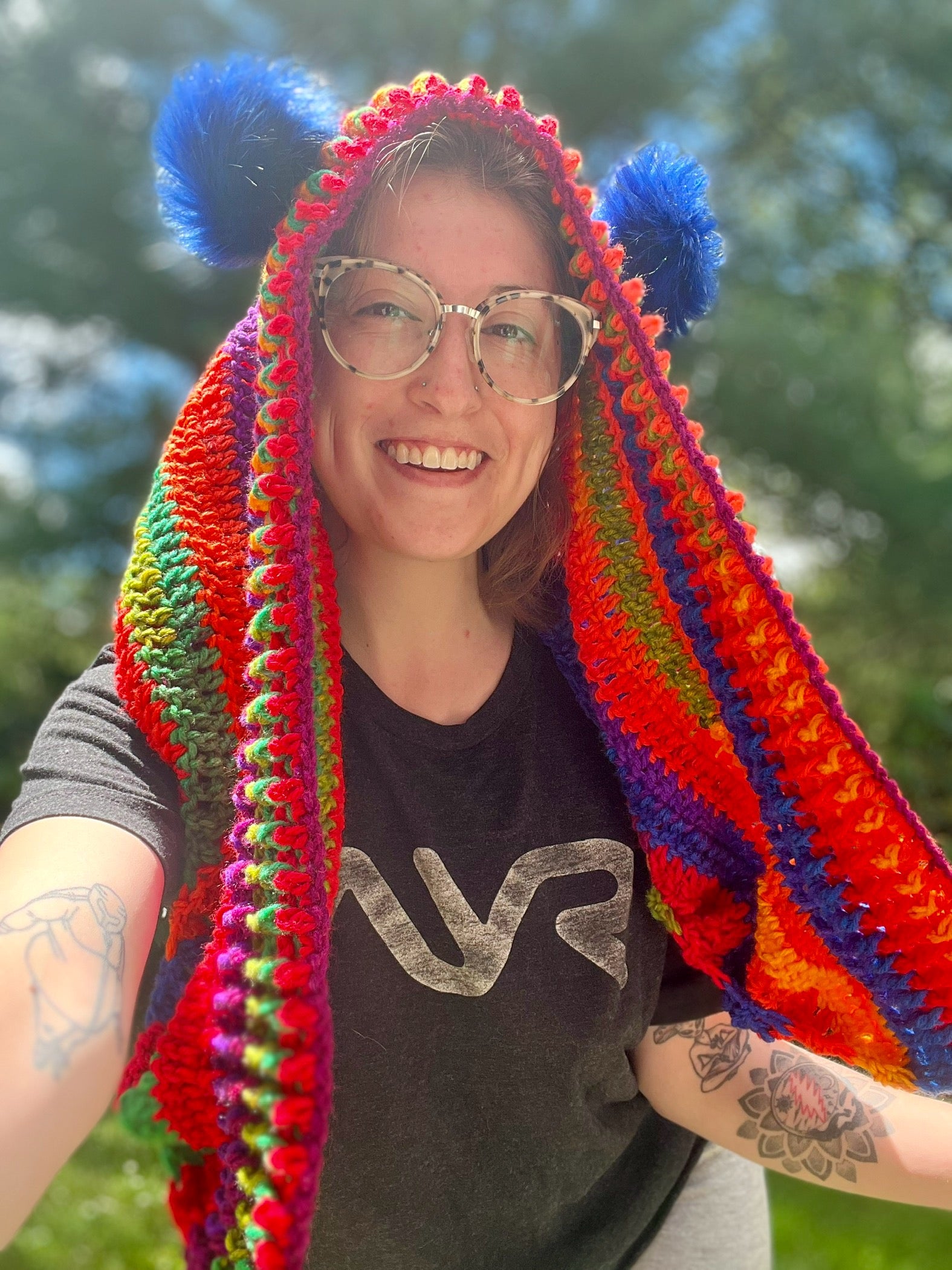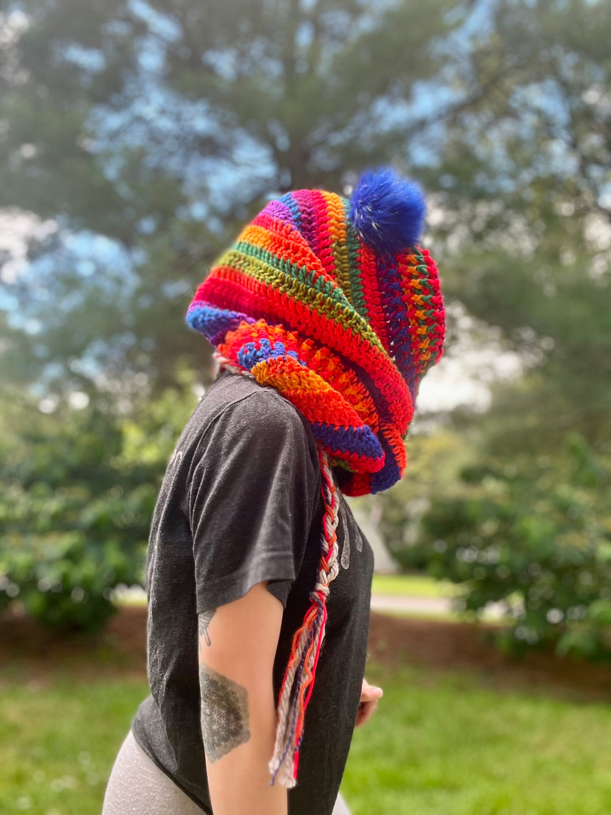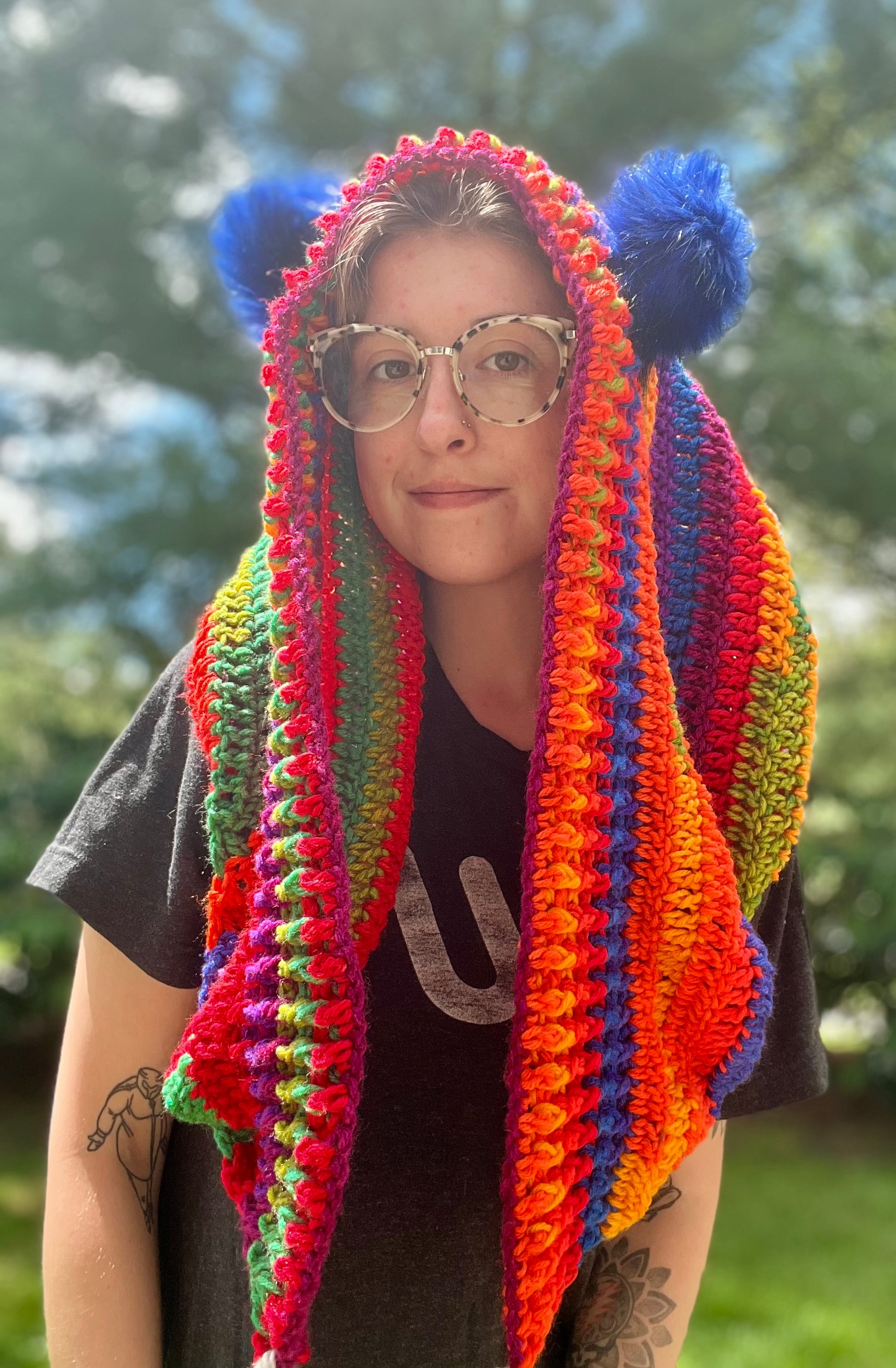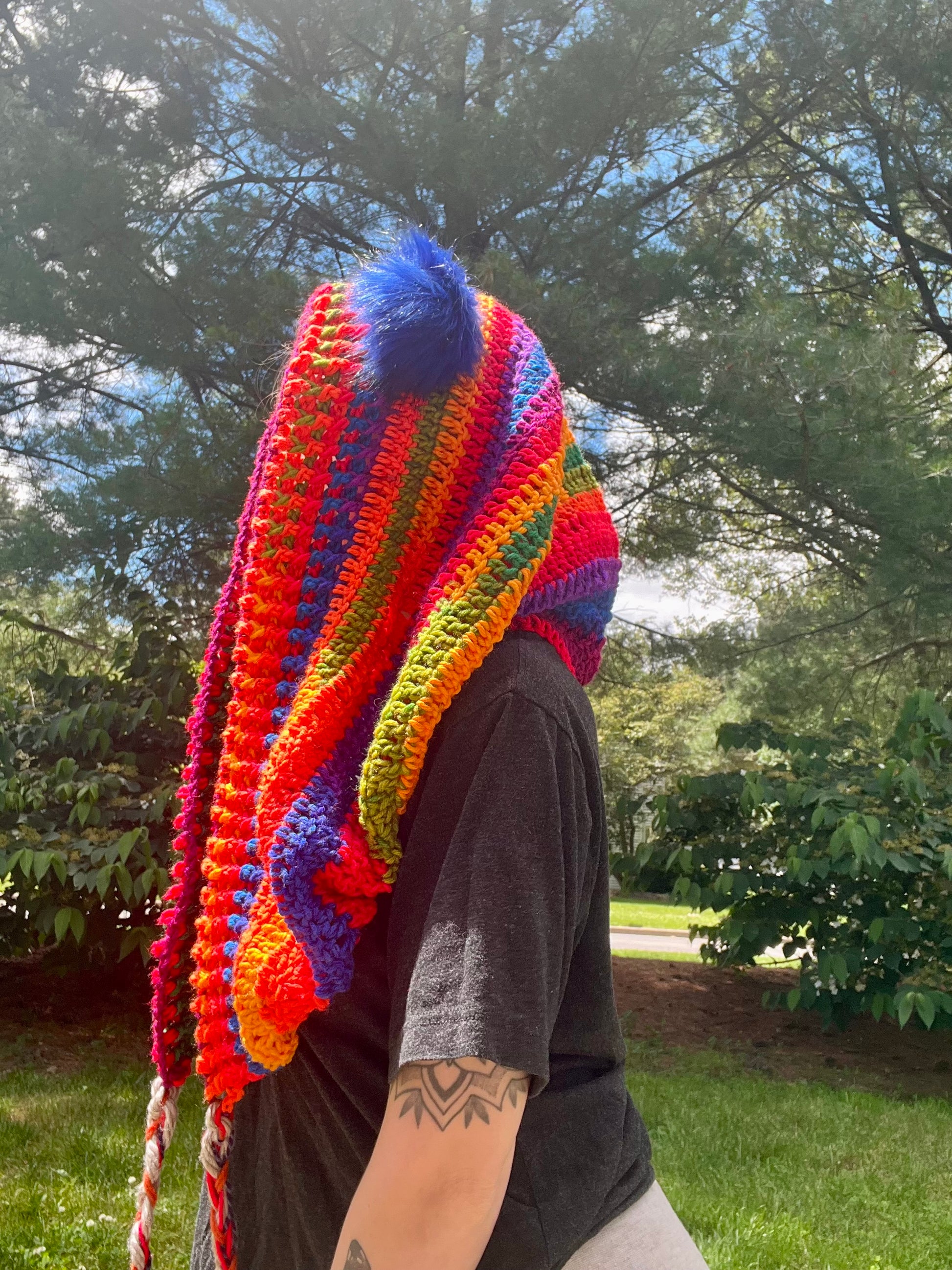 Made with acrylic yarn, faux fur acrylic yarn, and faux fur Pom Pom ears, and wool braided ties