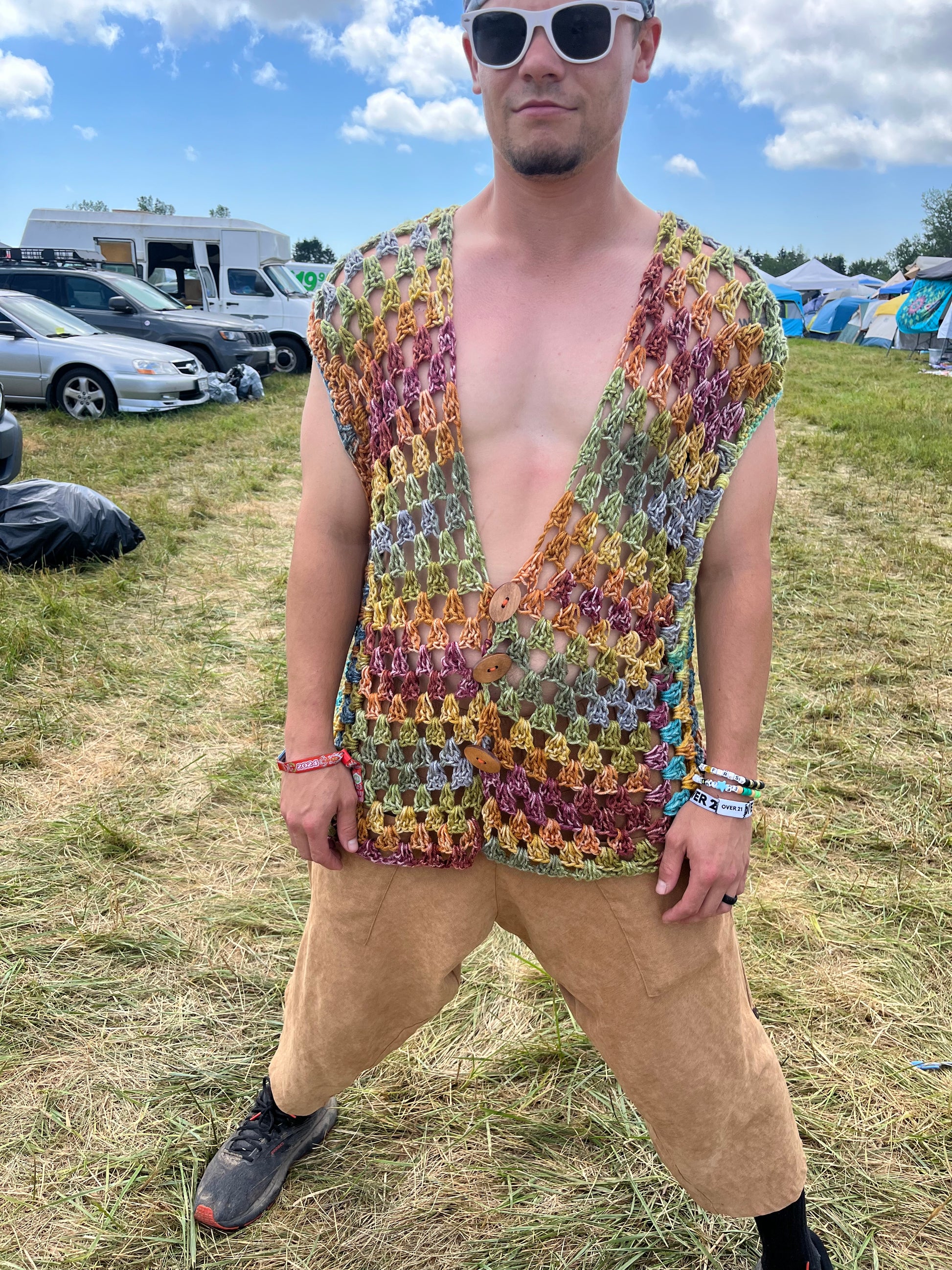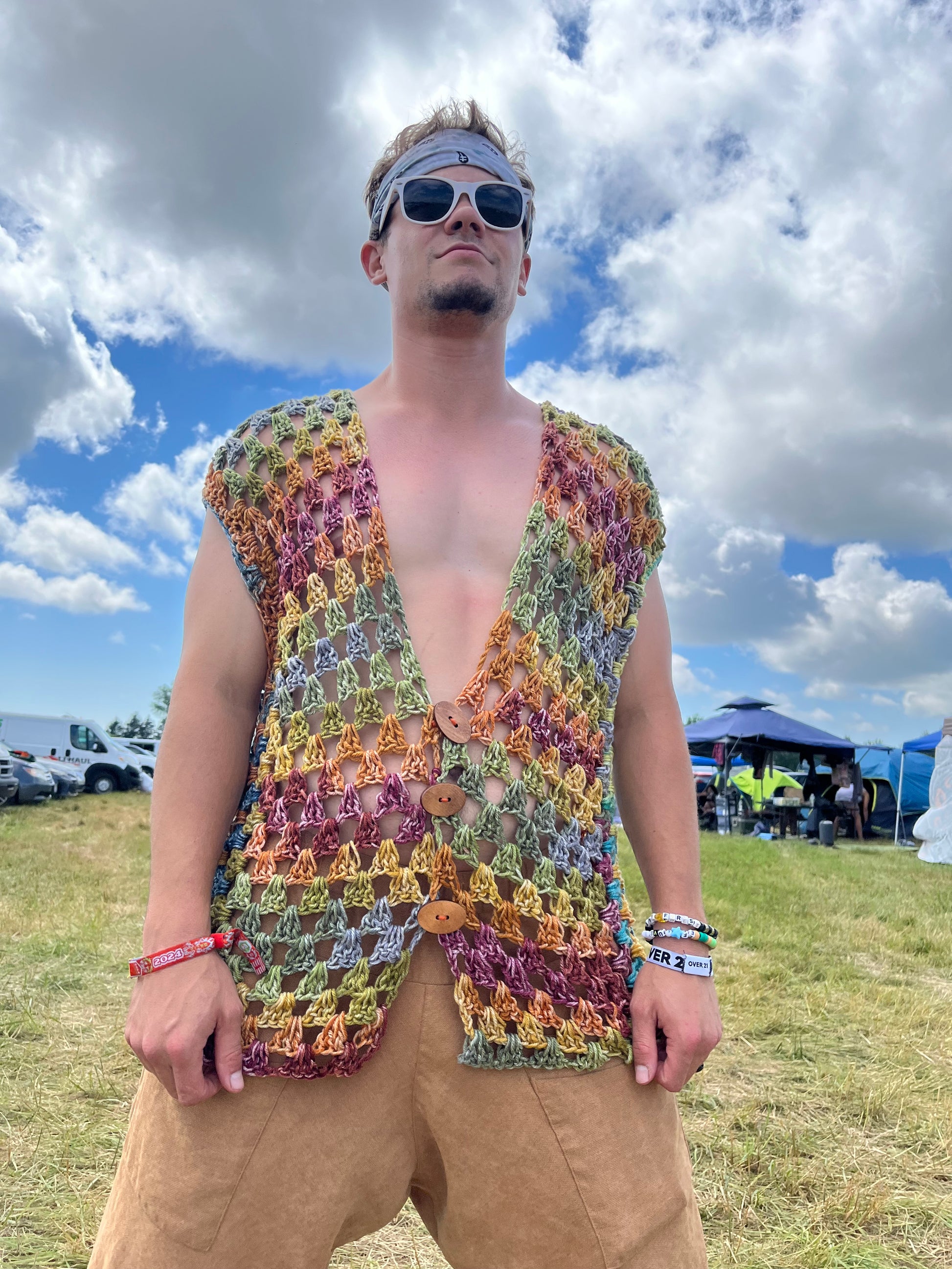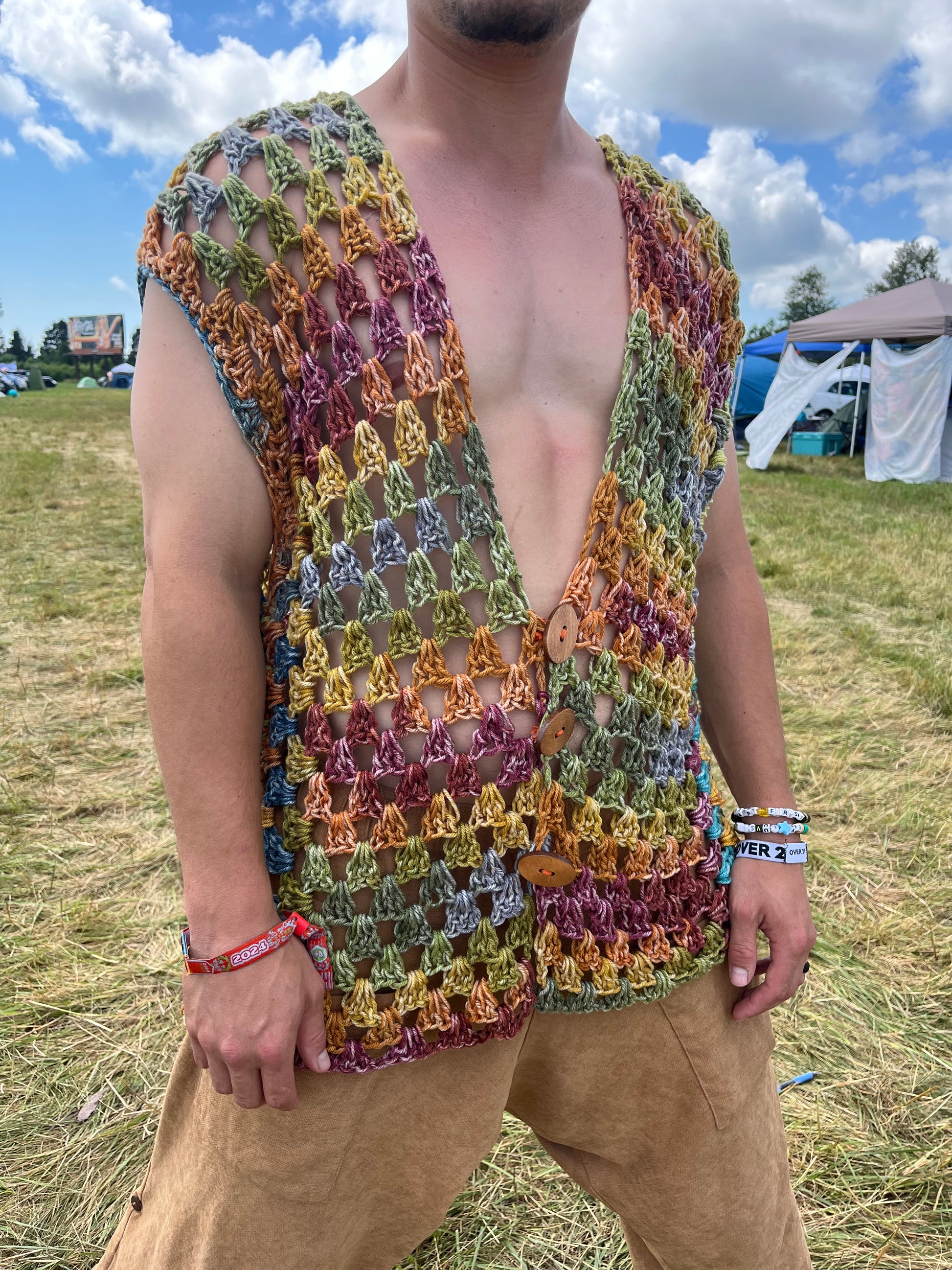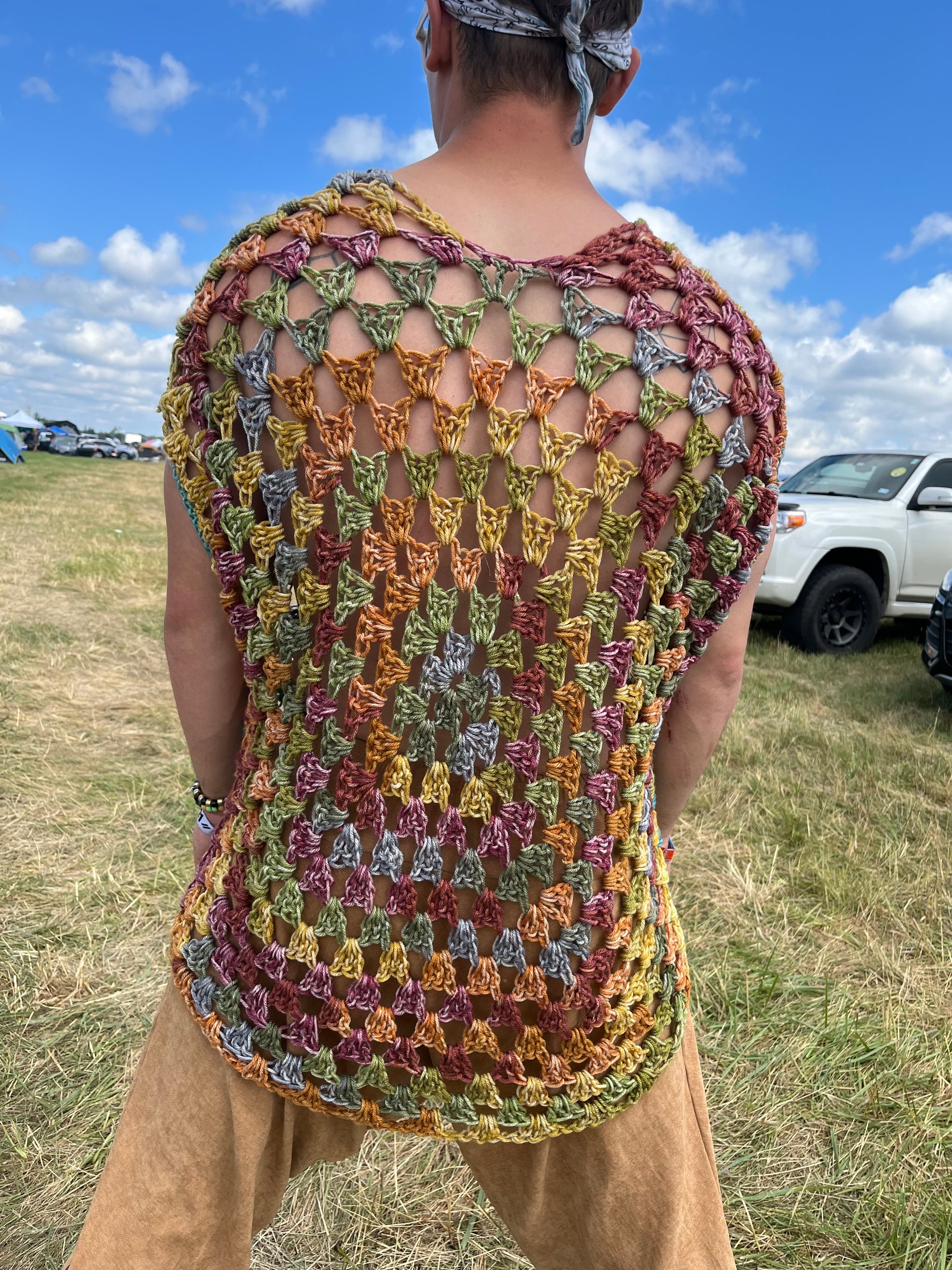 vest is made with soft acrylic yarns, rainbow and yellow and blue multi on the sides