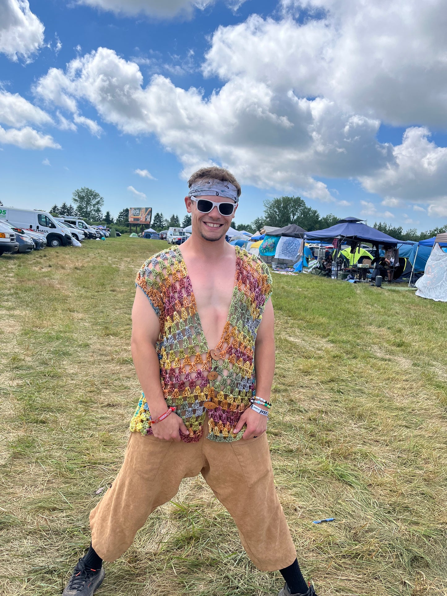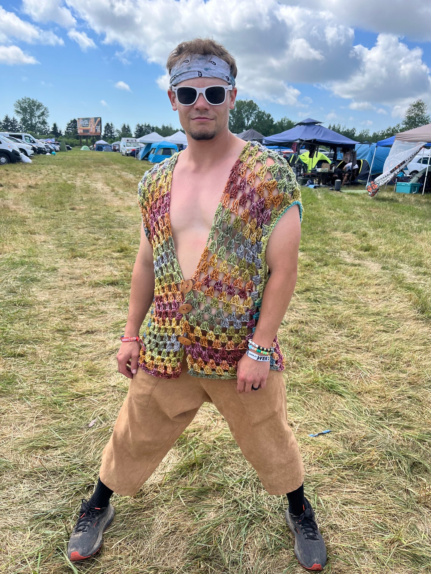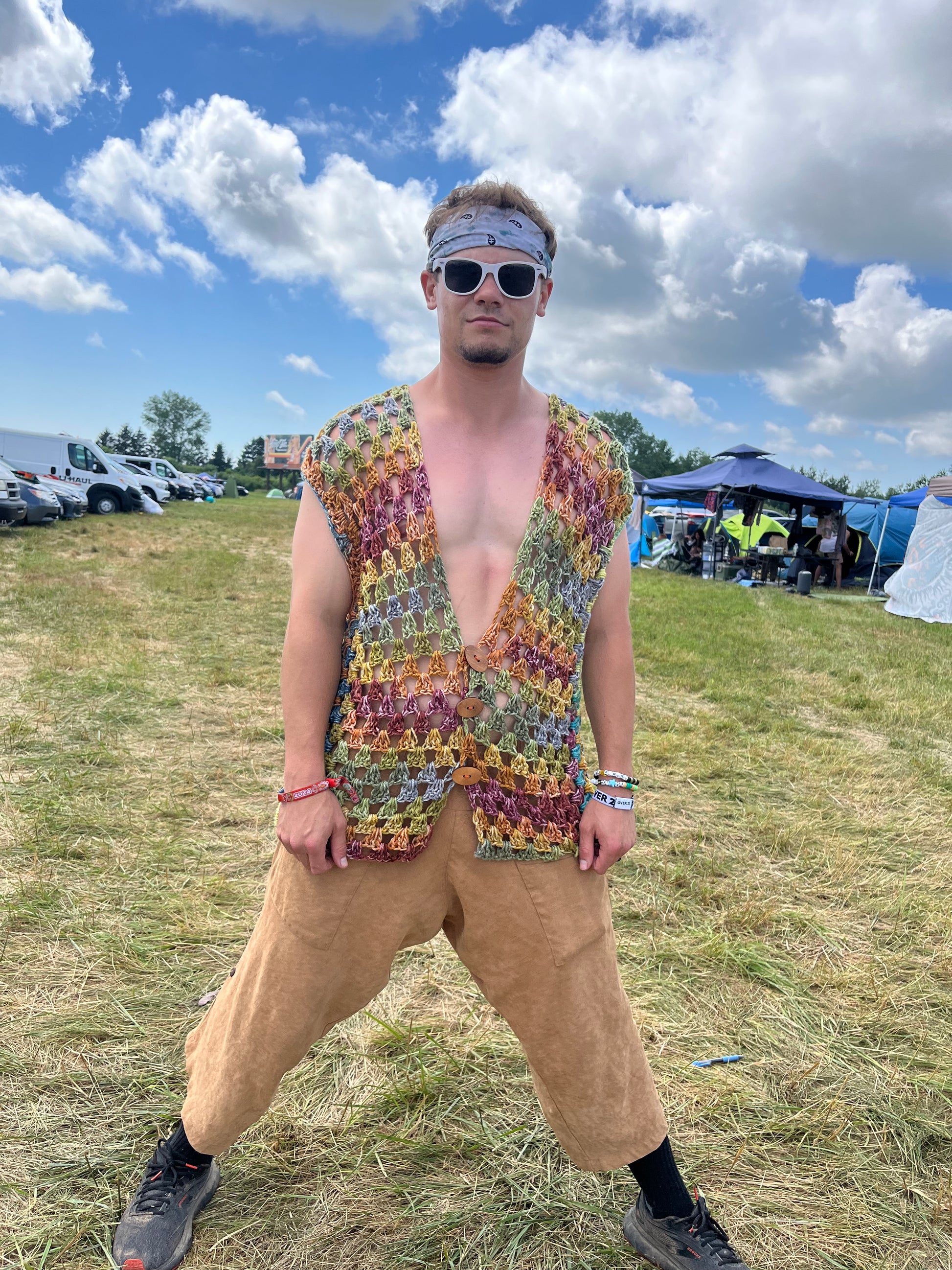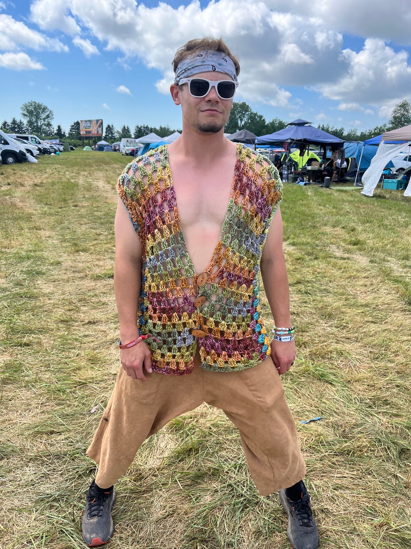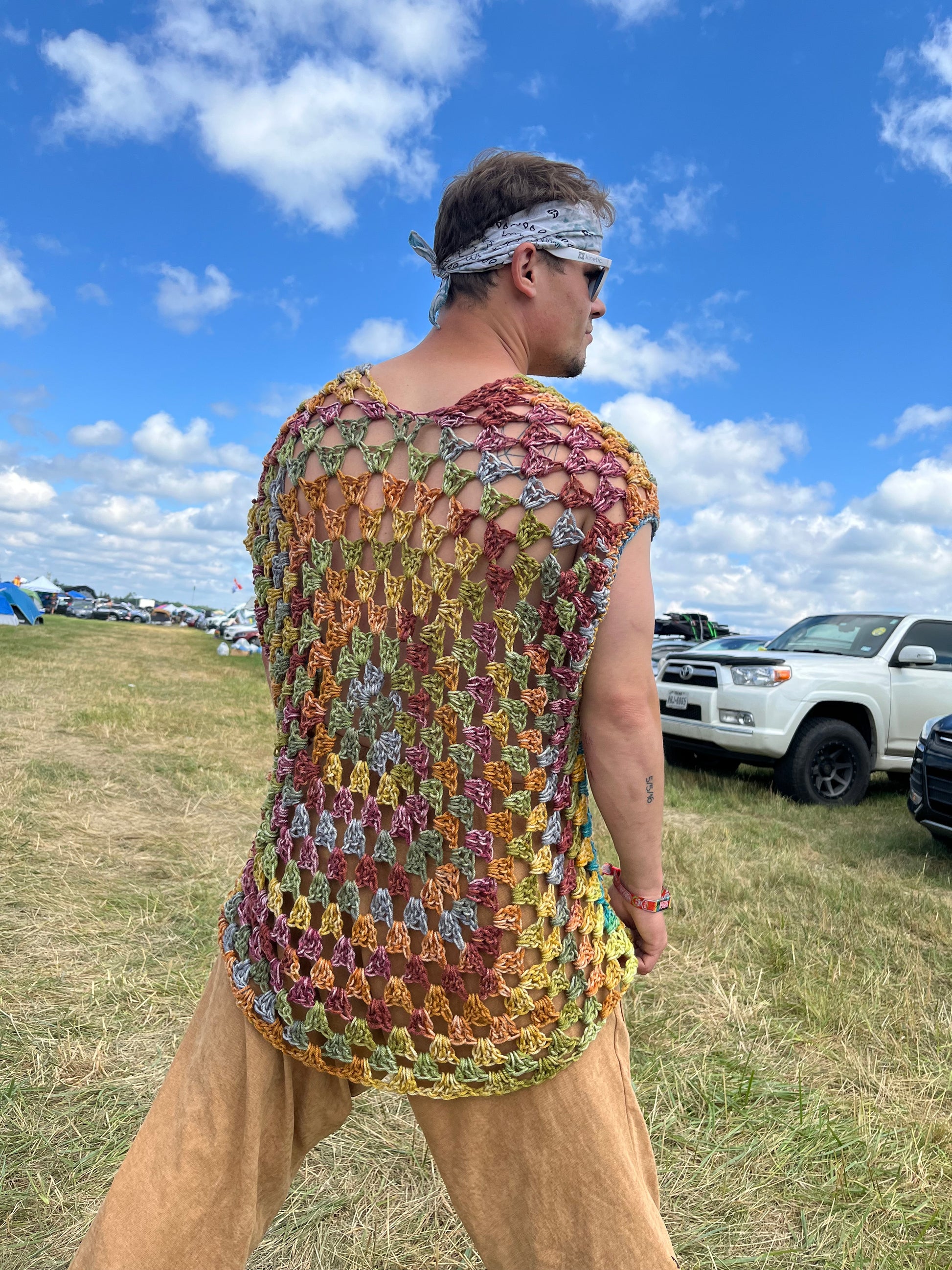 vest is made with soft acrylic yarns, rainbow and yellow and blue multi on the sides