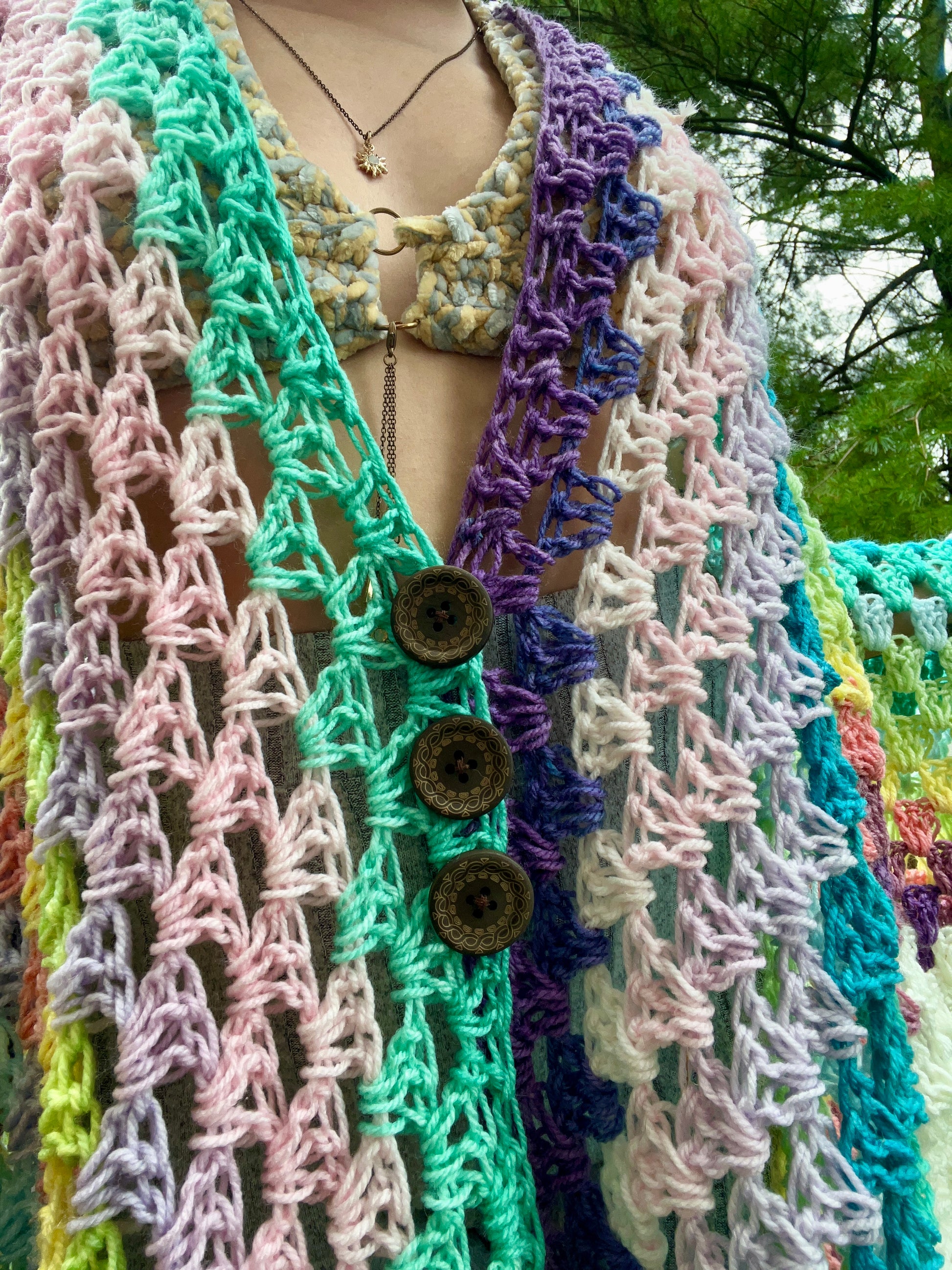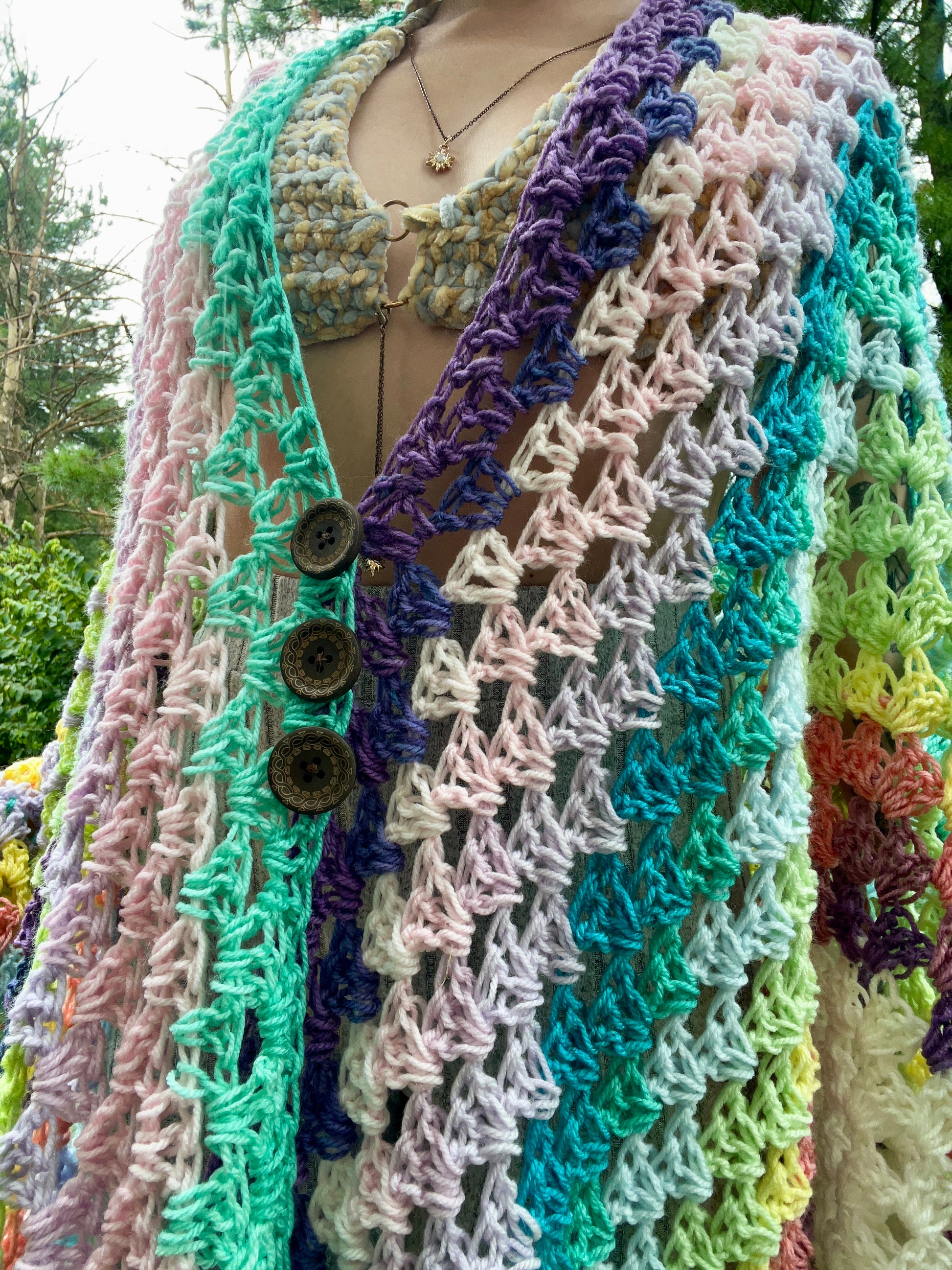 lightweight oversized cardigan adorned with three mandala decorated wooden buttons