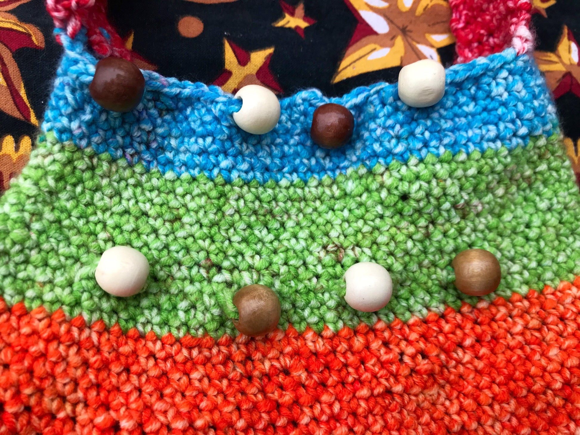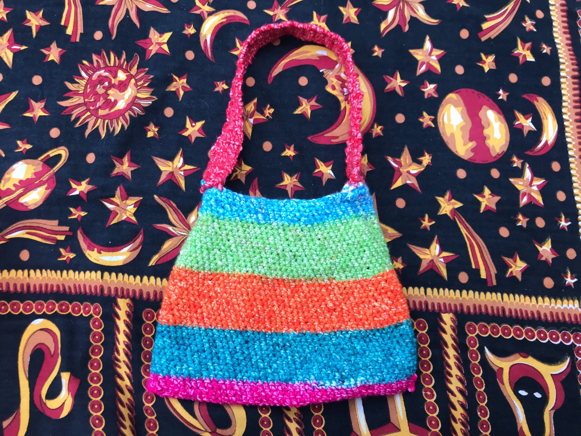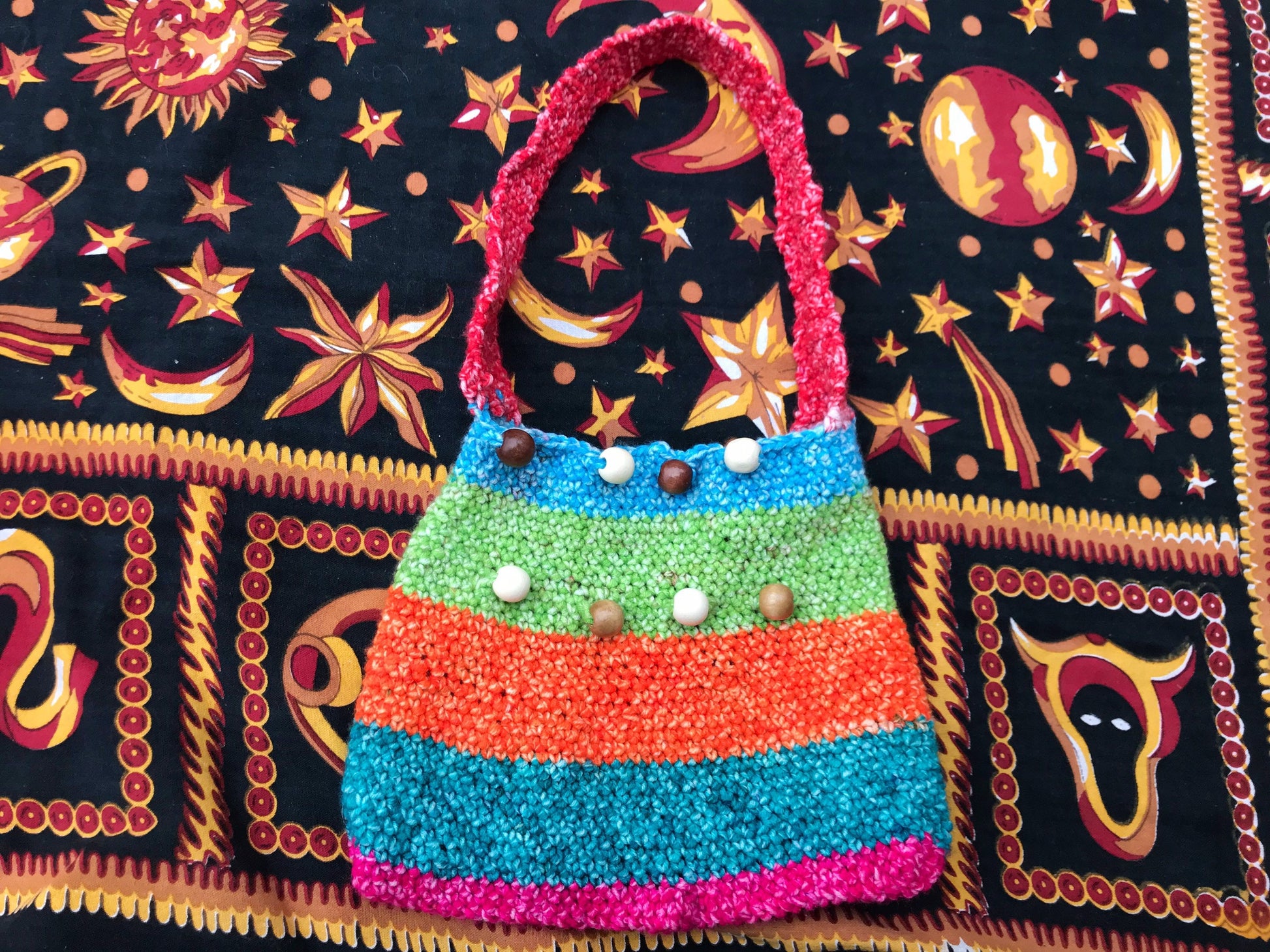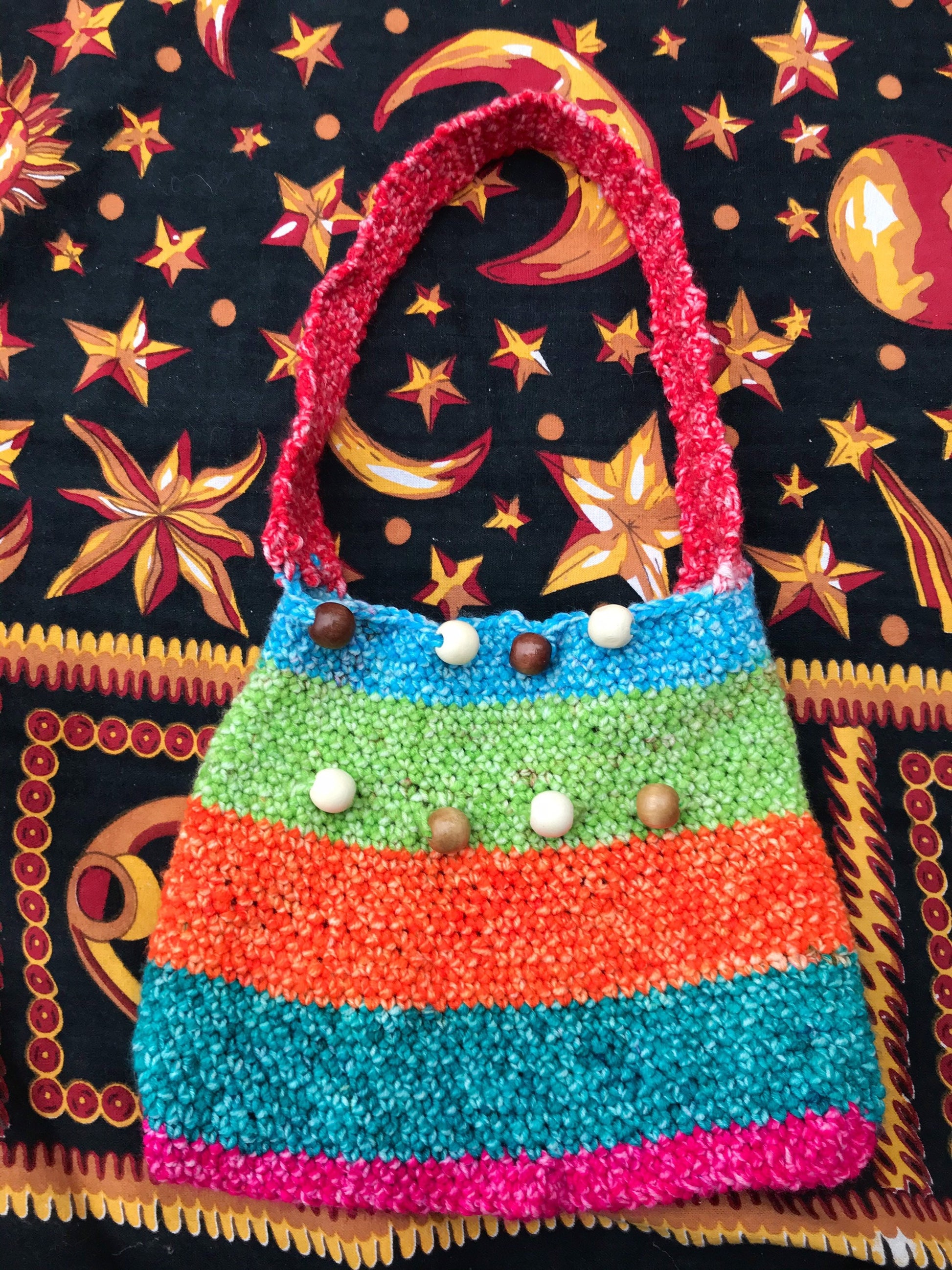 This was my first ever attempt at crocheting! And I absolutely love how it turned out! This piece is made using multicolored rainbow yarn. This purse is reversible (easily flip it inside out to display the beads or hide the beads). This bag features large wooden beads on one side of the bag for some pop. Or keep it simple with the basic rainbow pattern. This is a smaller sized hand bag, I will be posting photos of myself holding the bag for a better example or size. Always handle with care!! 💗
