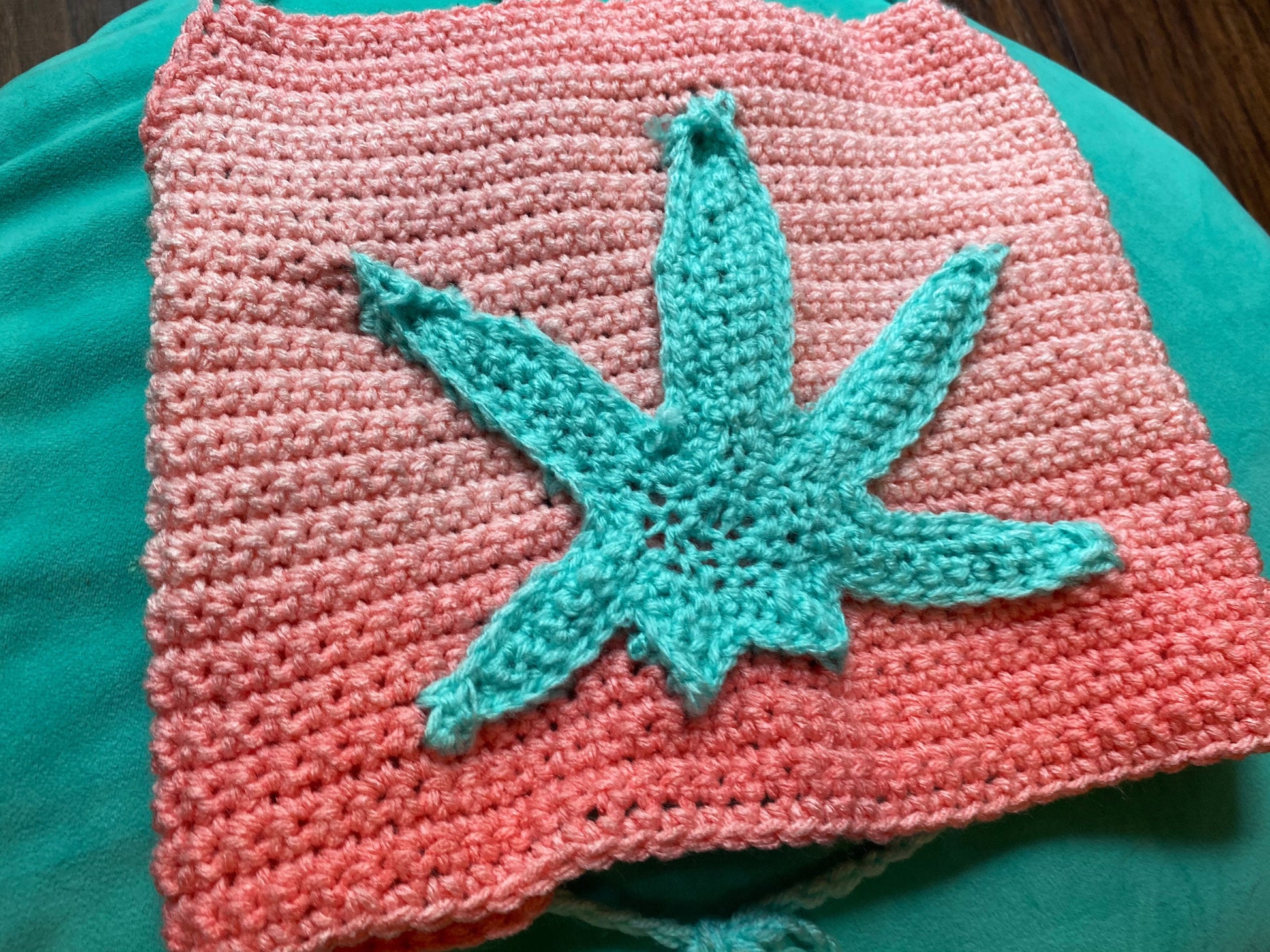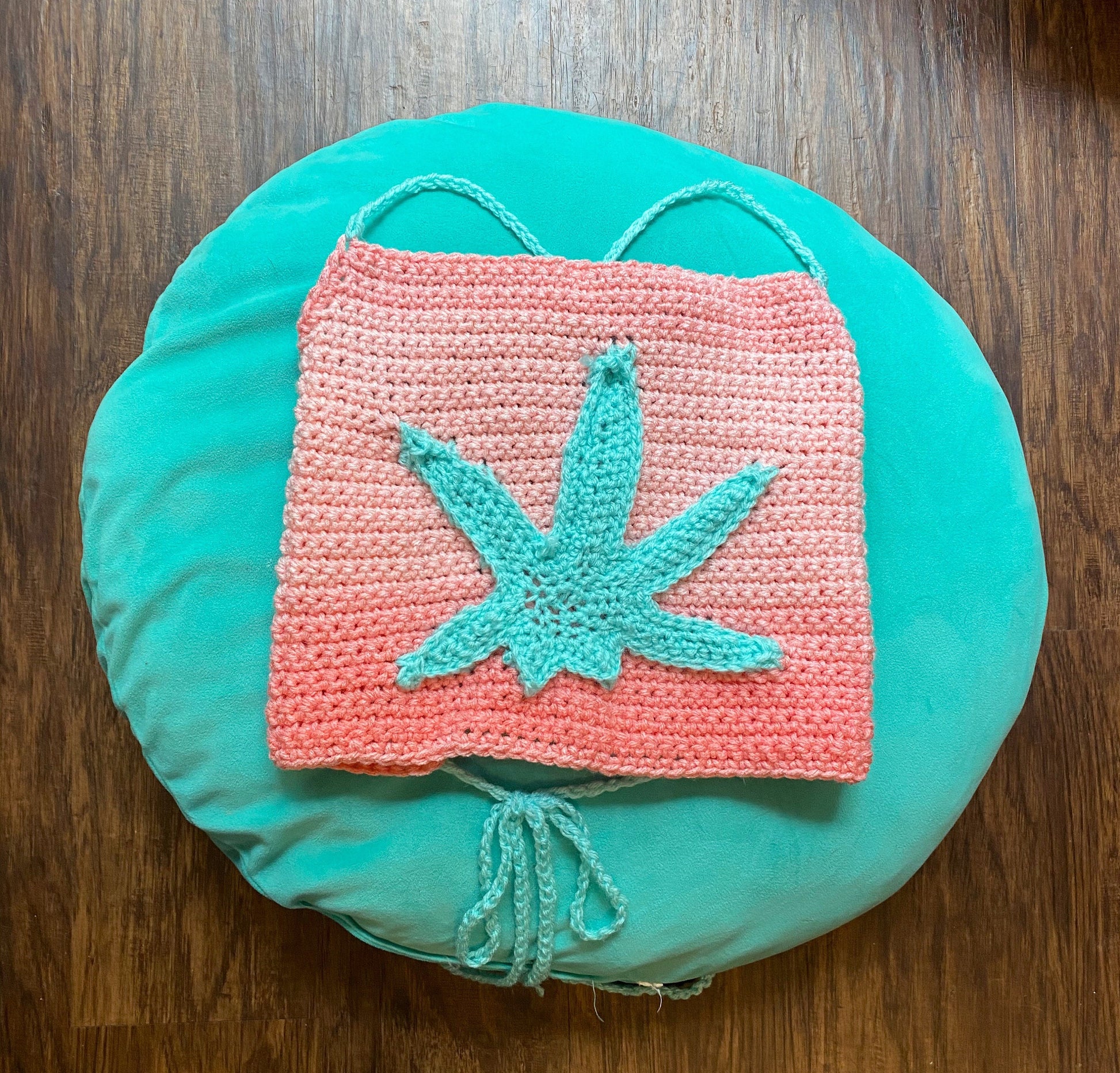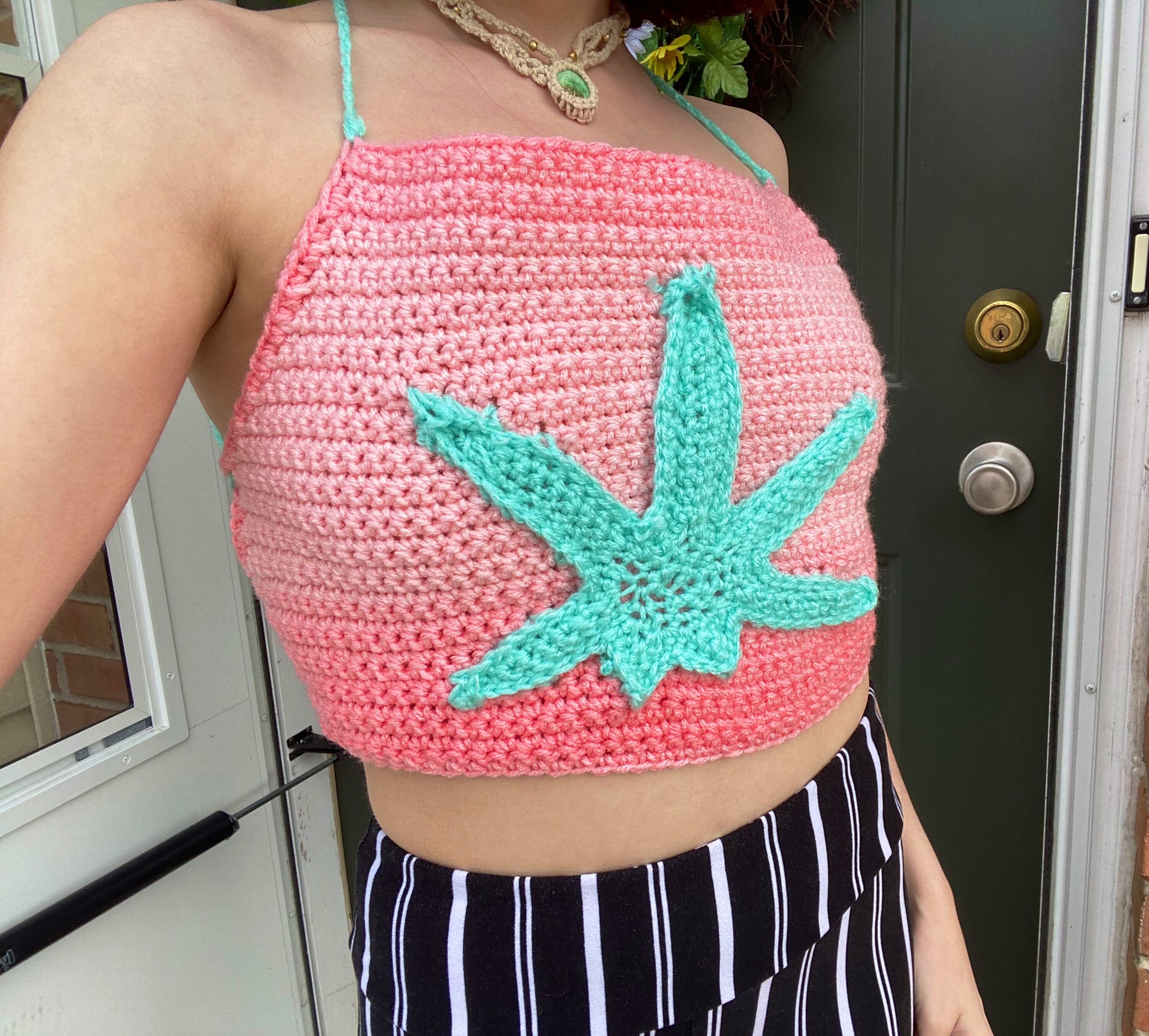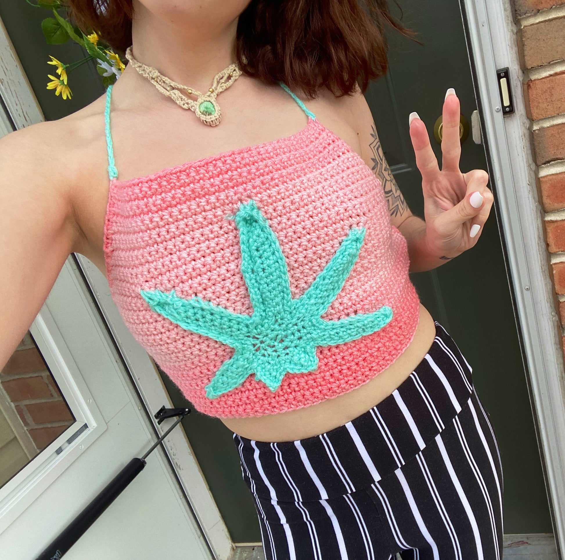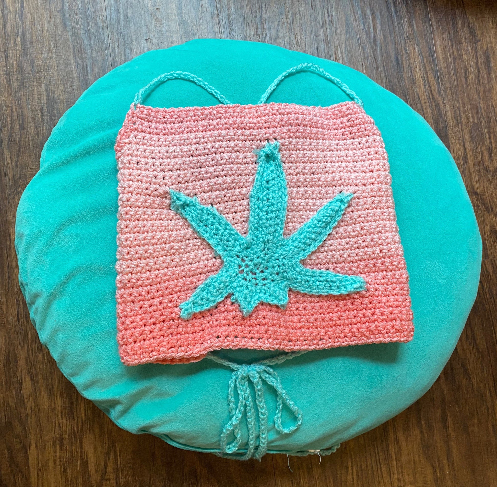 Handmade using this beautiful multicolored sherbet pink acrylic yarn, I’m obsessed with this top! This was my first weed leaf attempt, I made the weed leaf awhile back and kept it in my yarn basket because I had nooo idea what to use it with! So happy I saved it for this special one of a kind top 😏 This top is adjustable with a cross tie connected at the top of the shirt, and can fit sizes XS-L. Happy holidazeeee to my stoner friends ❤️💛💚