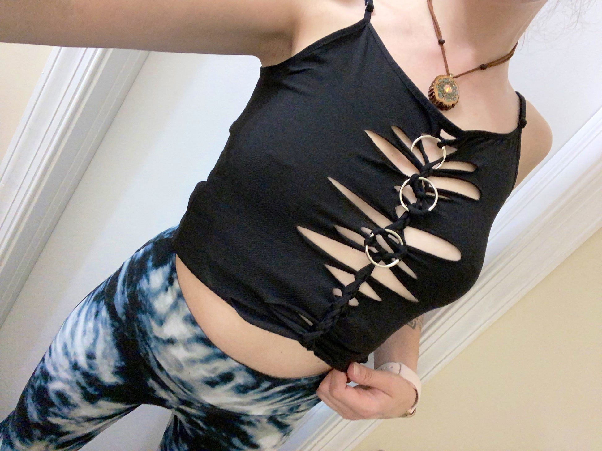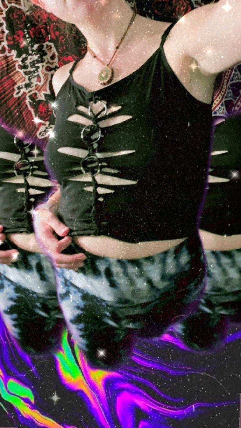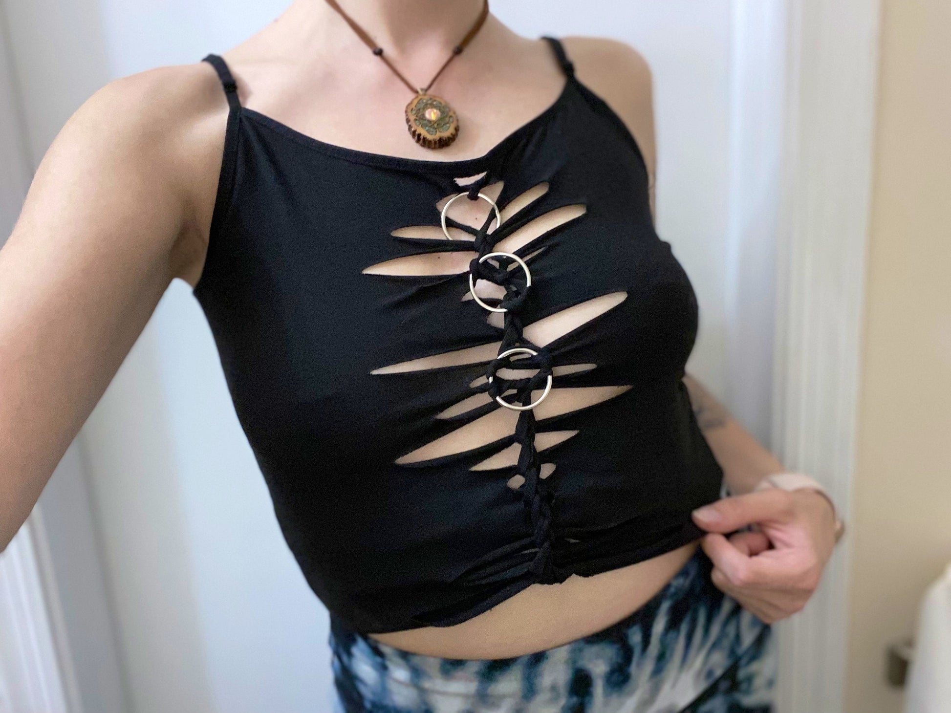 Handmade braided slit weave shirt, The material is super stretchy and soooo soft! This shirt has adjustable spaghetti straps. This shirt can be worn as a tank top or crop top style, just fold it/roll it to the desired length! I used a laddered technique for this shirt. This shirt is perfect for casual wear, going out, and any festie, concert, or rave :) Always handle with care! Hand wash and hang to dry. Machine wash and dry can be used on light settings but it could damage or stretch the weaves.