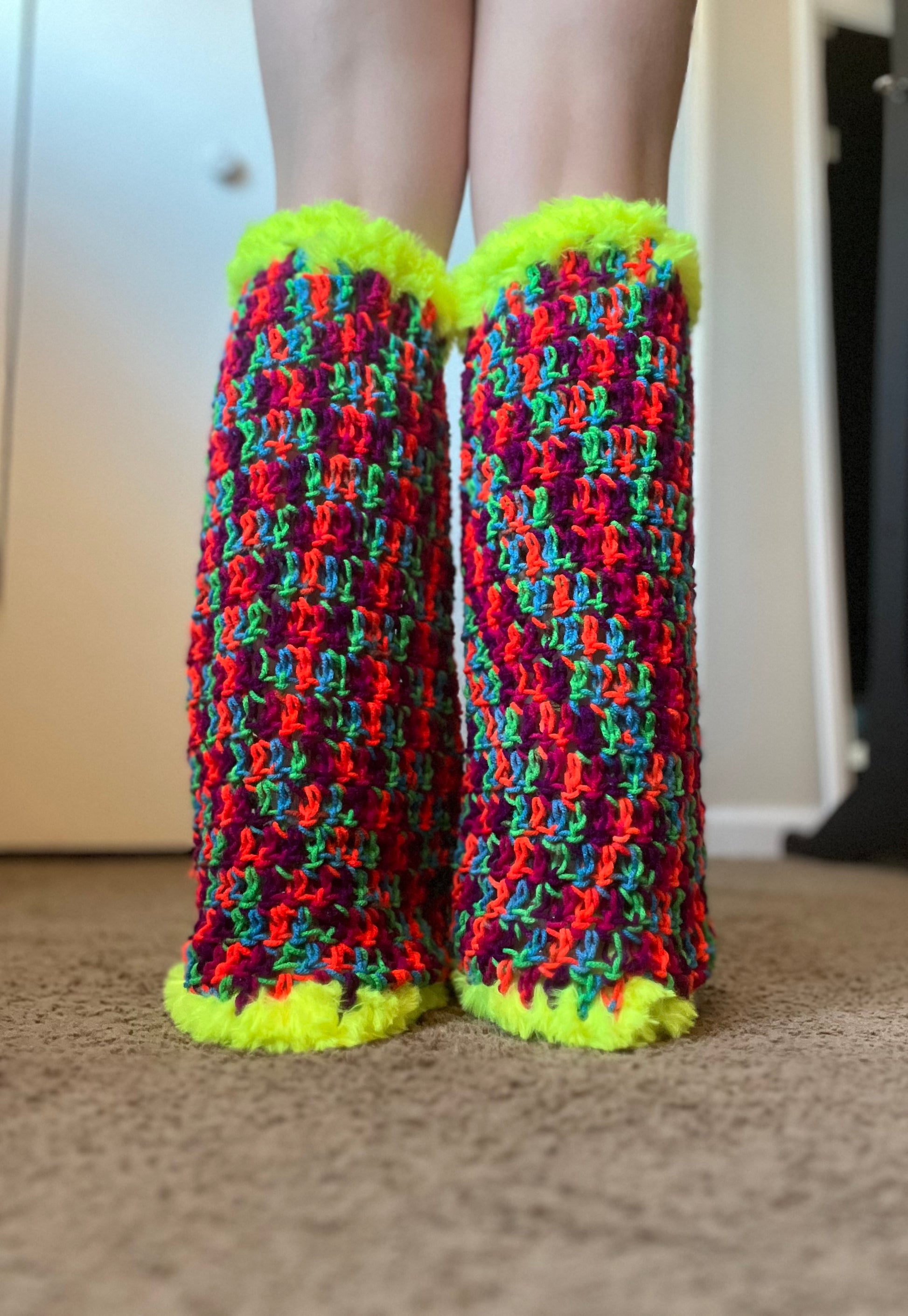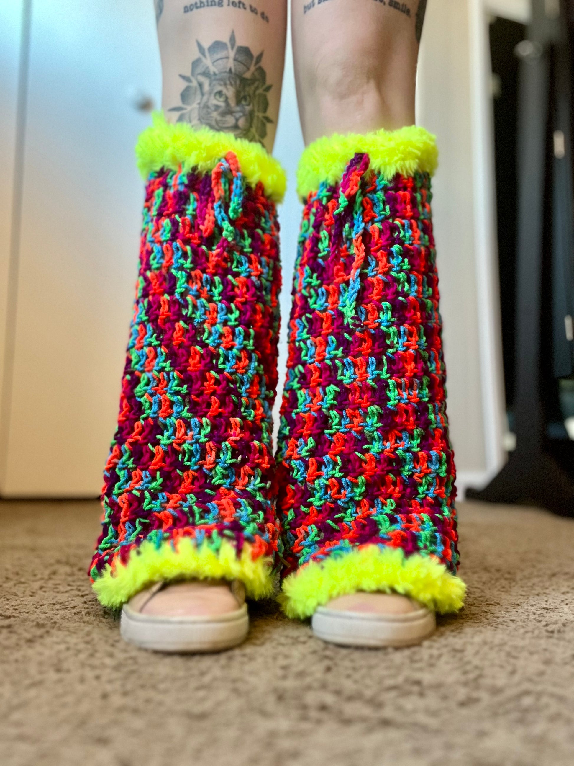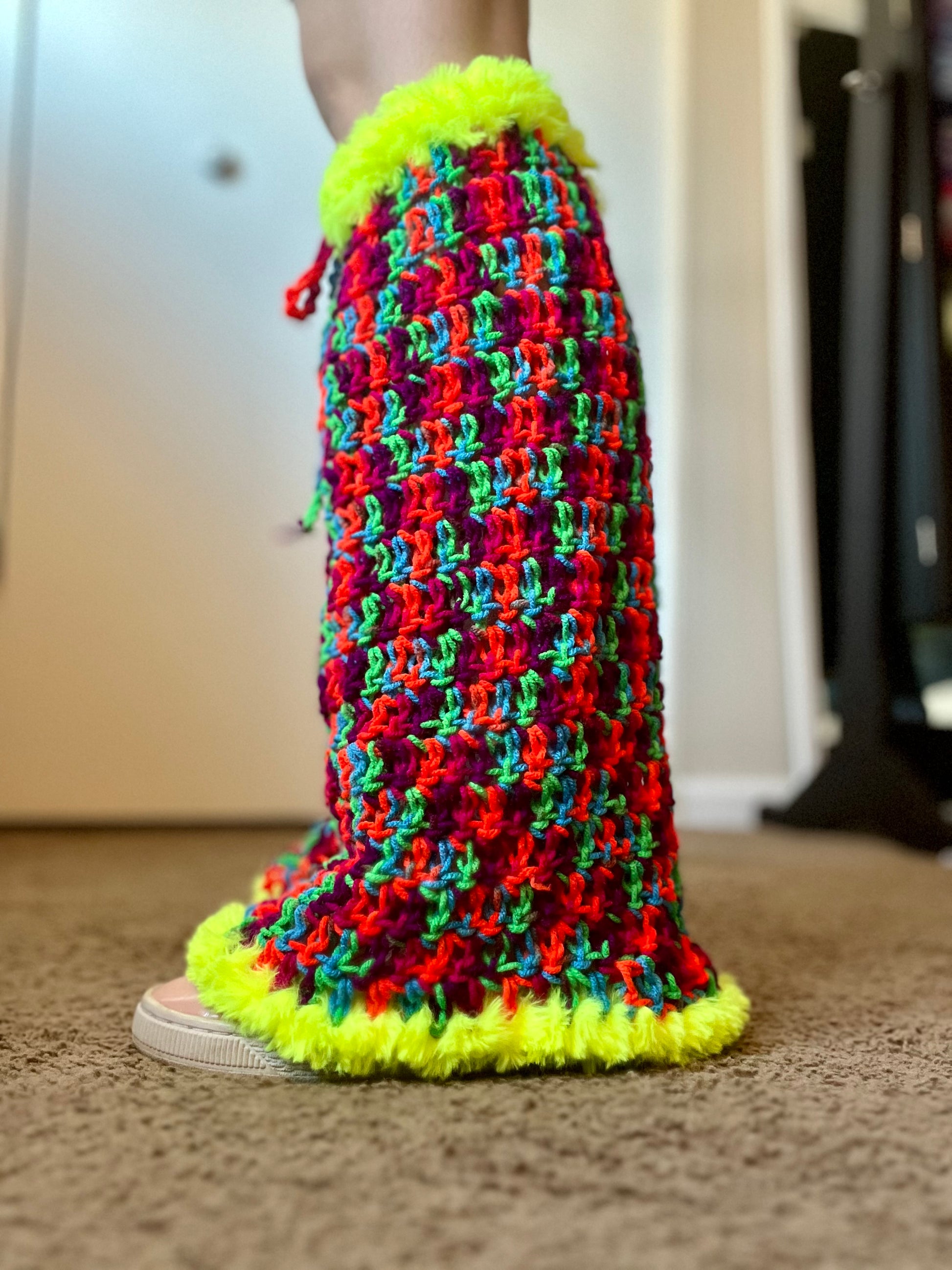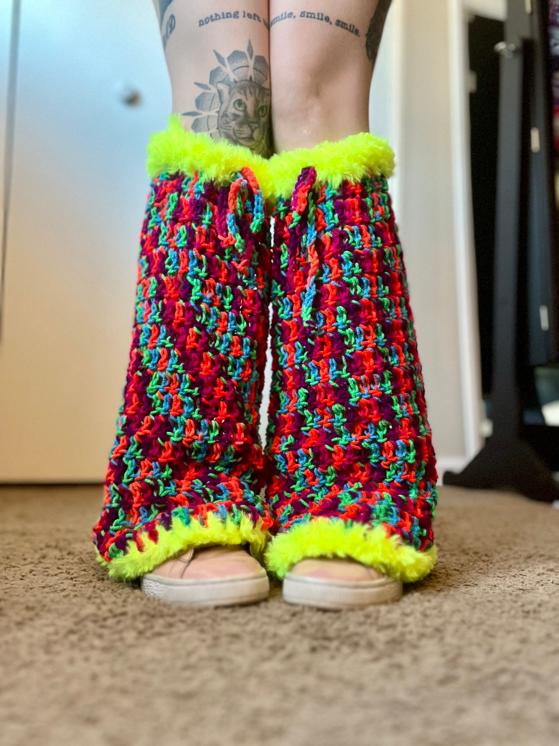 Handmade with black light reactive acrylic yarn, and black light reactive faux fur acrylic yarn