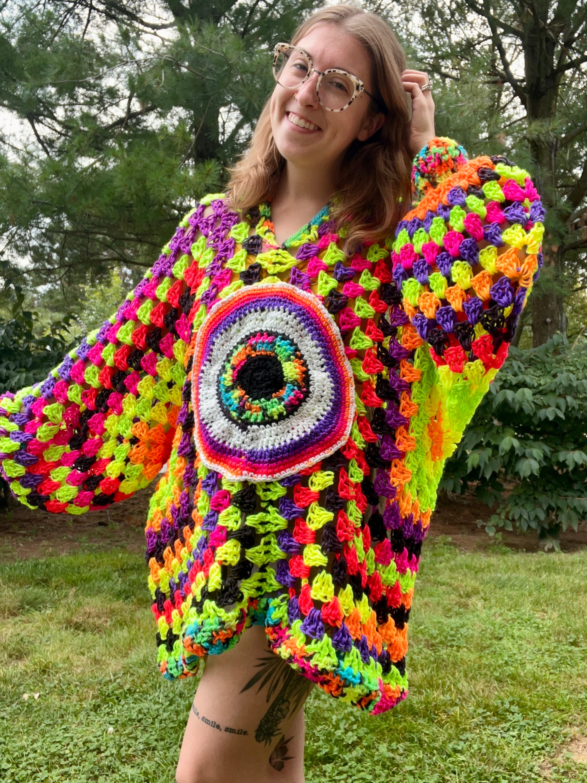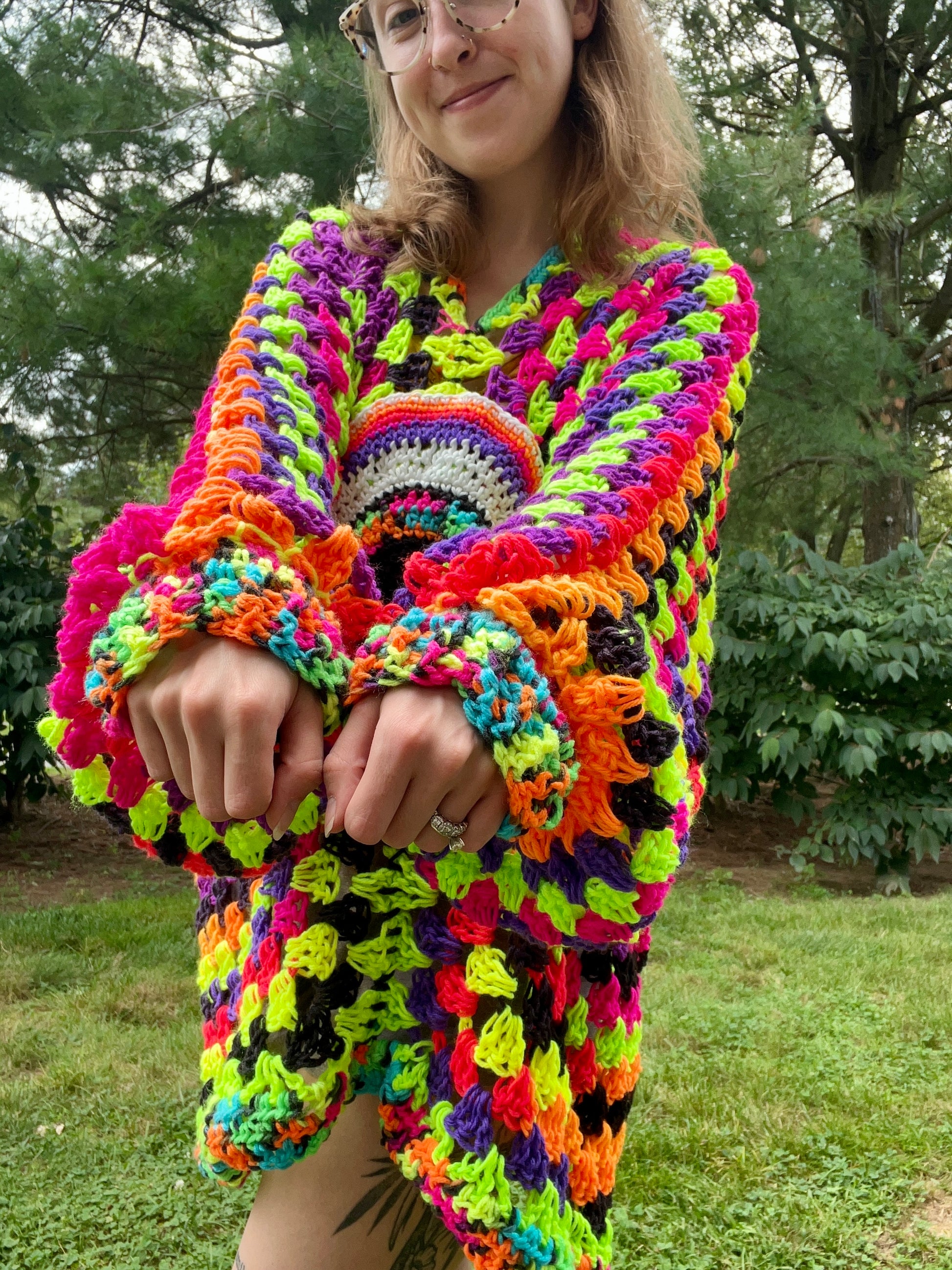 Model is a size S/M, this cardigan can fit up to sizes XL-XXL, but will be less oversized